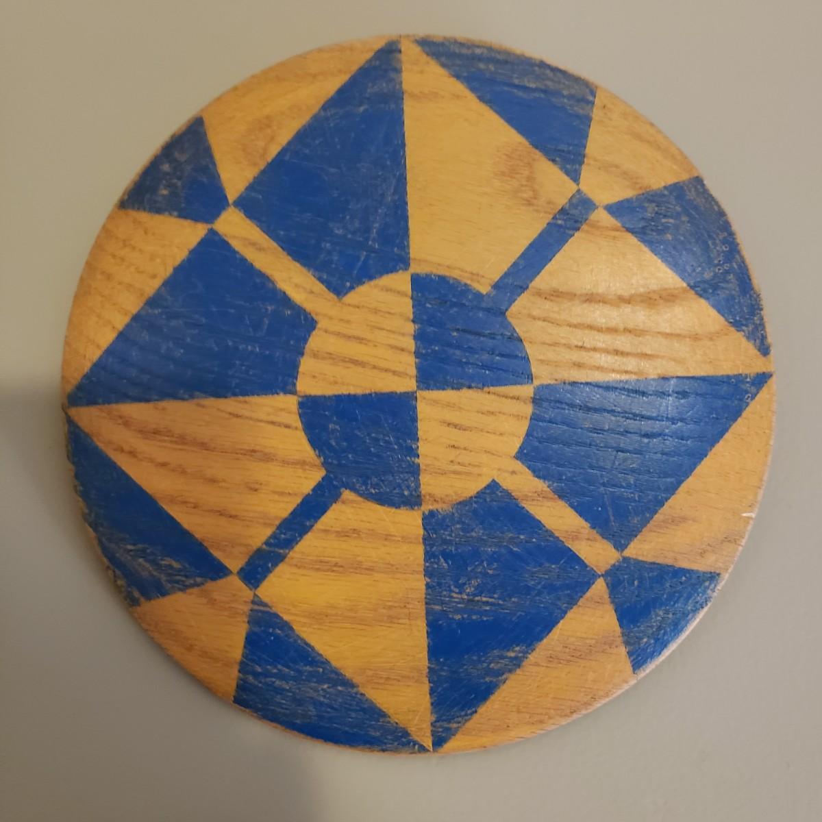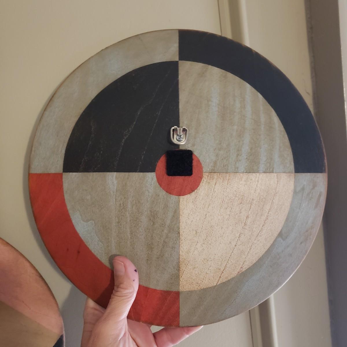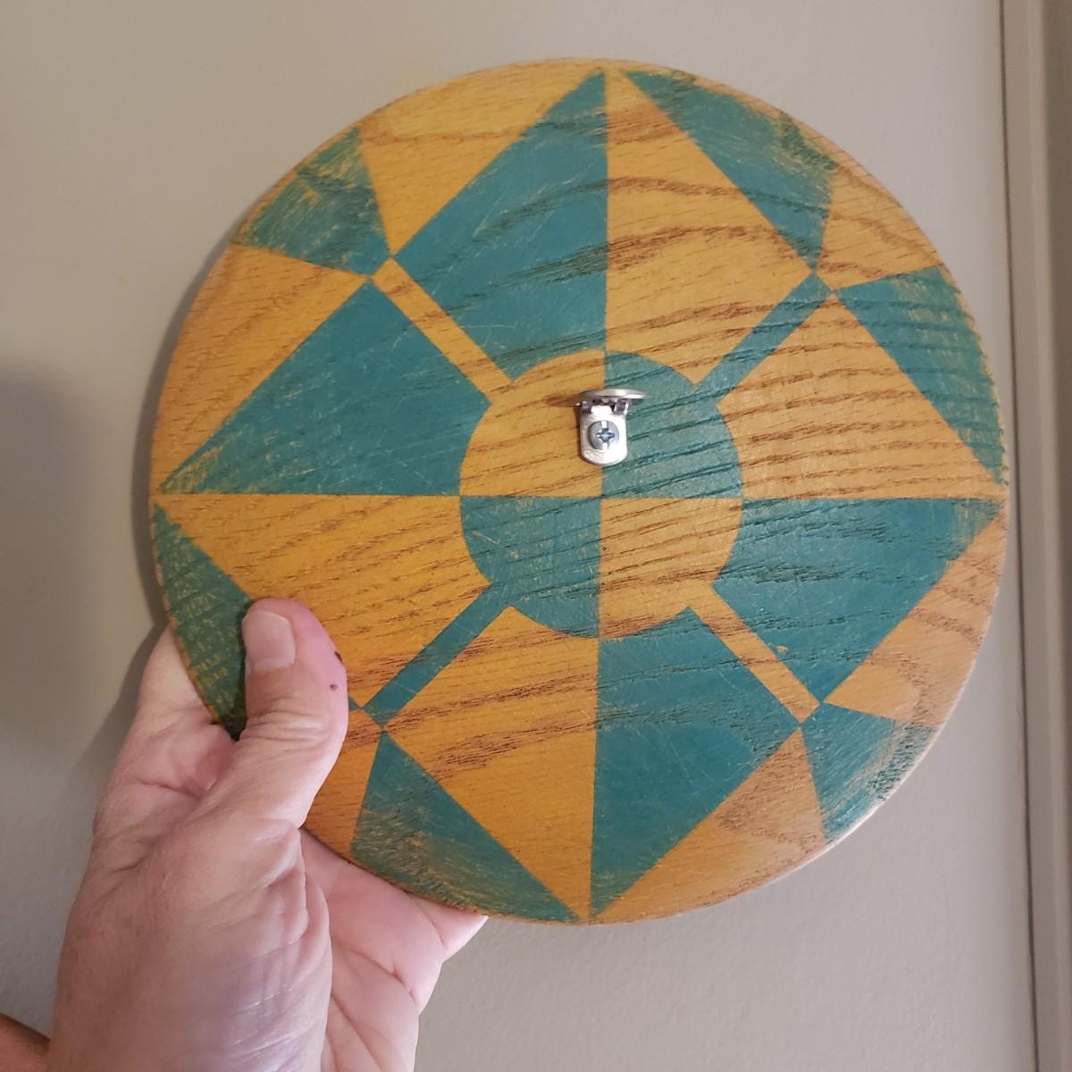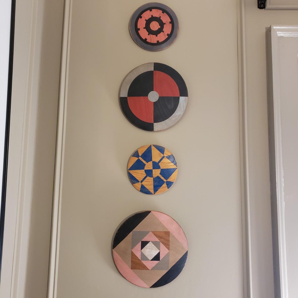 These four contemporary wood pieces are double sided with designs. The pieces appear to have been painted and/or possibly stained. The two large pieces measure 11" and the small ones are 8". They each have a bracket for mounting on a wall.