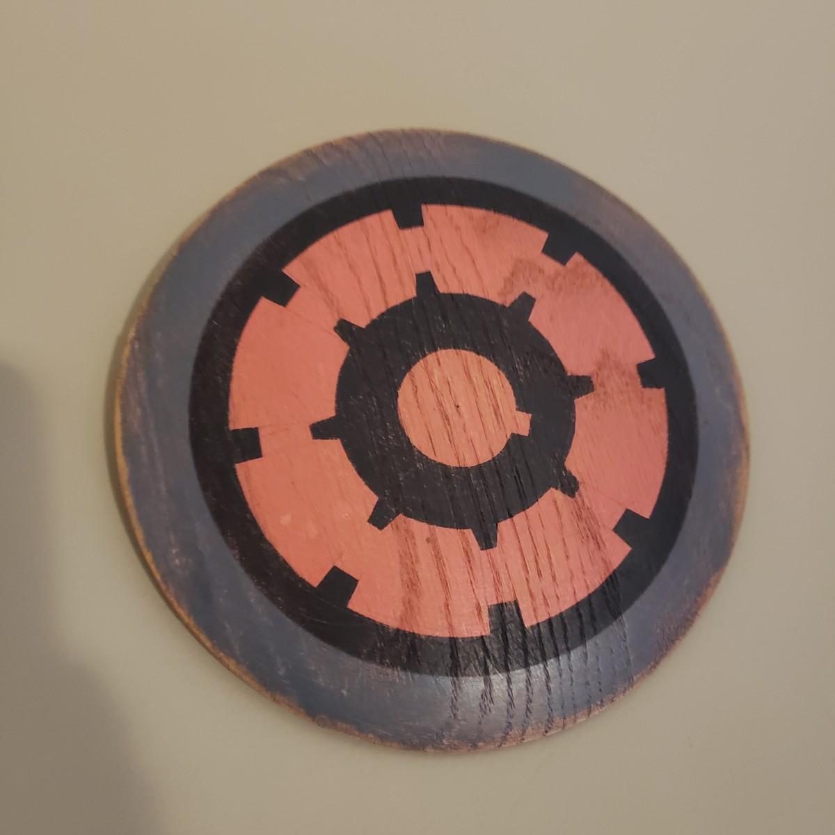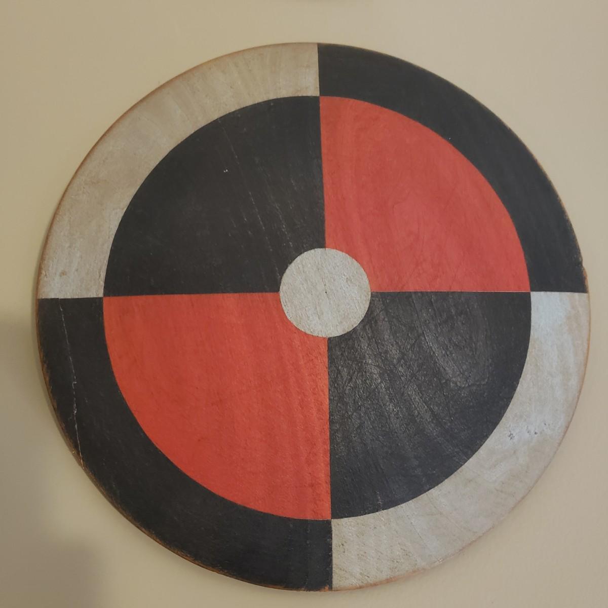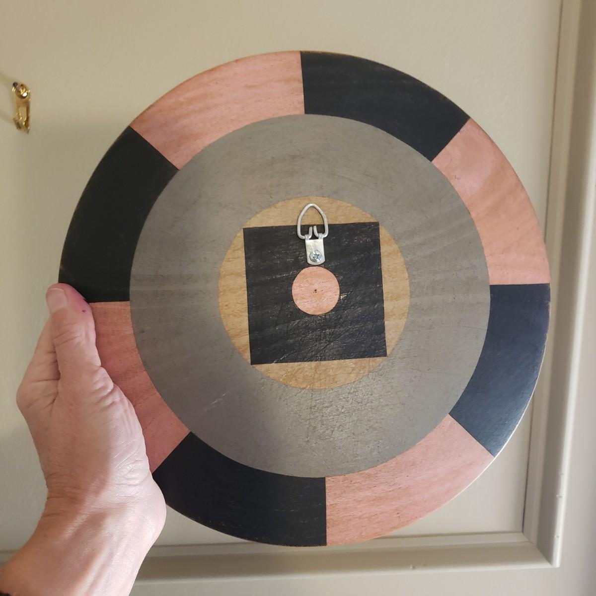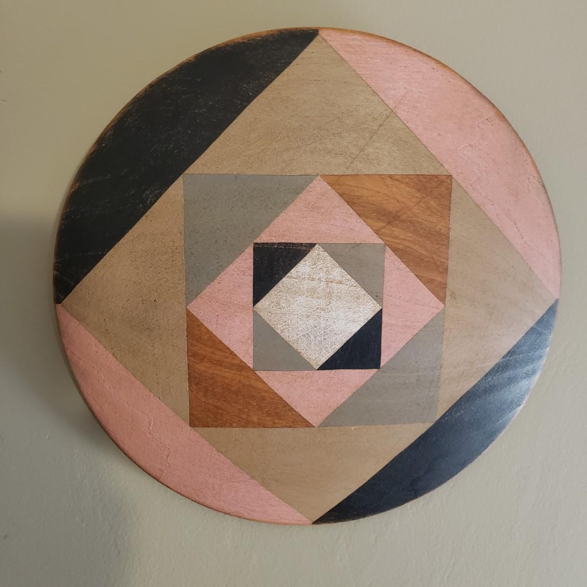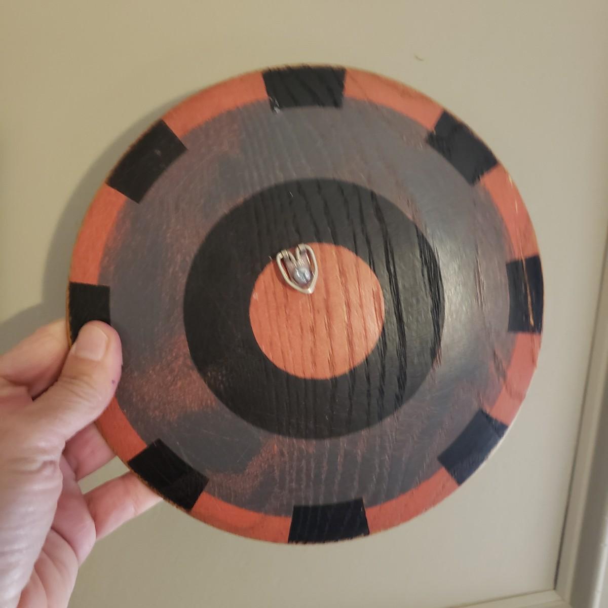These four contemporary wood pieces are double sided with designs. The pieces appear to have been painted and/or possibly stained. The two large pieces measure 11" and the small ones are 8". They each have a bracket for mounting on a wall.