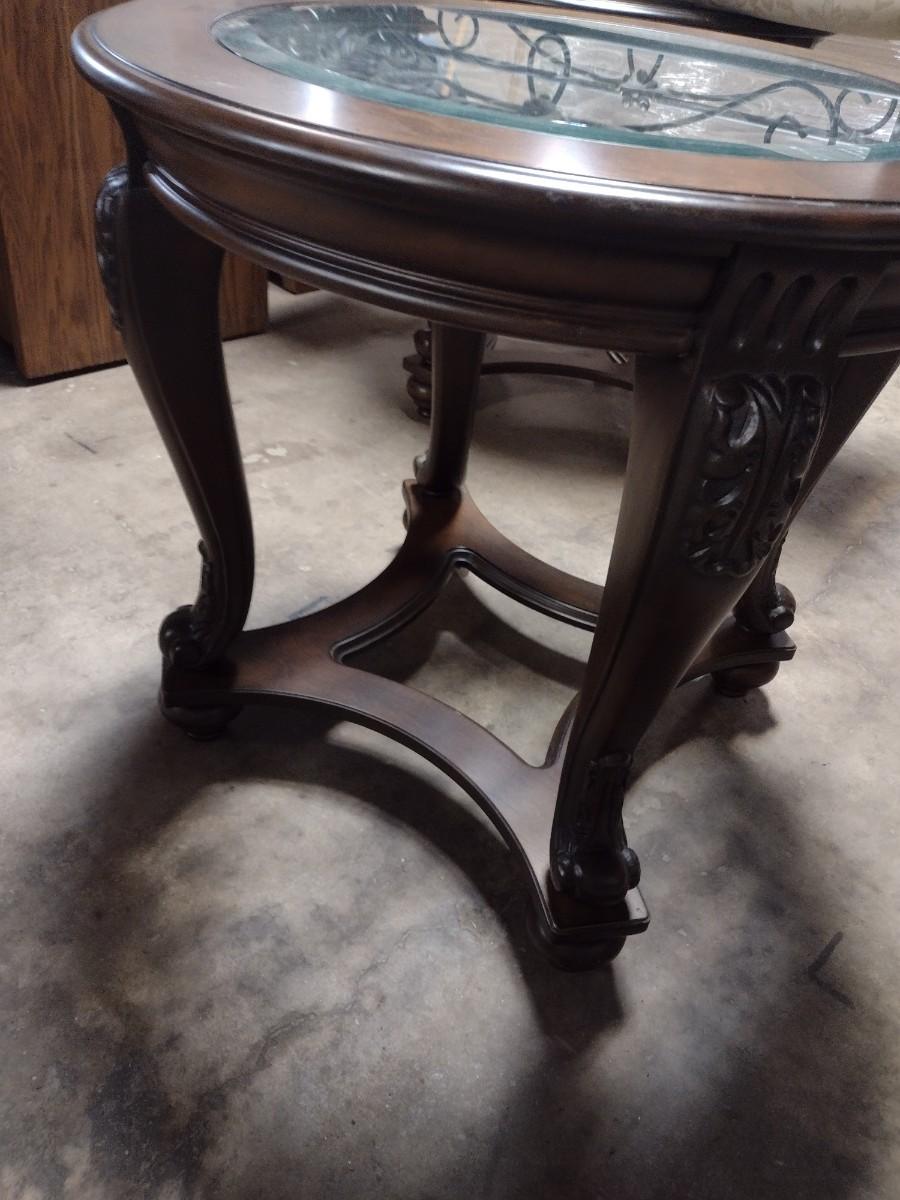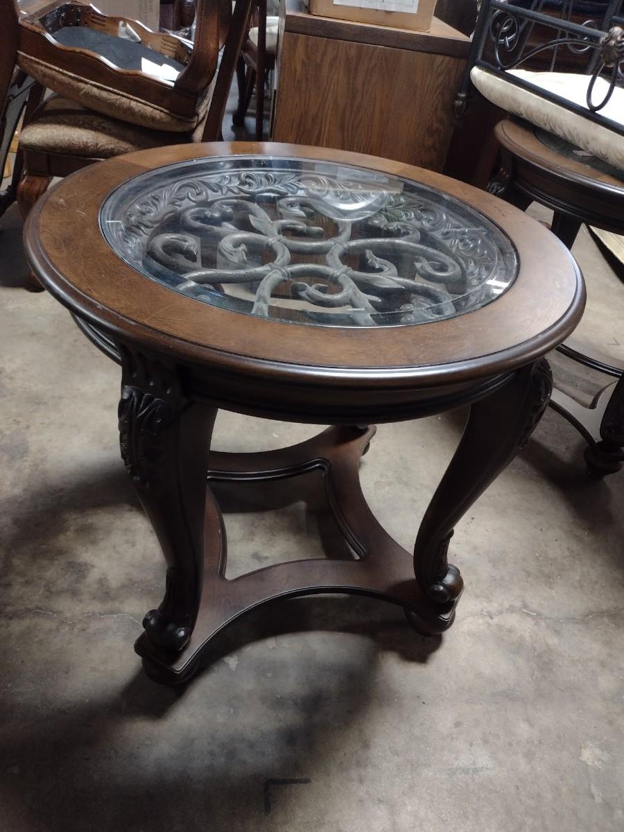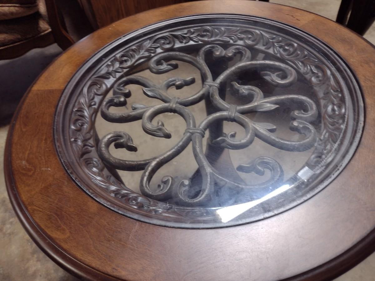 Contemporary Wood Finish Side Table with Wrought Metal Accent and Glass Top Insert Choice B