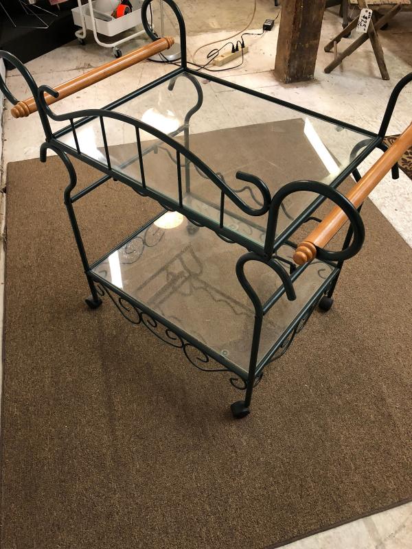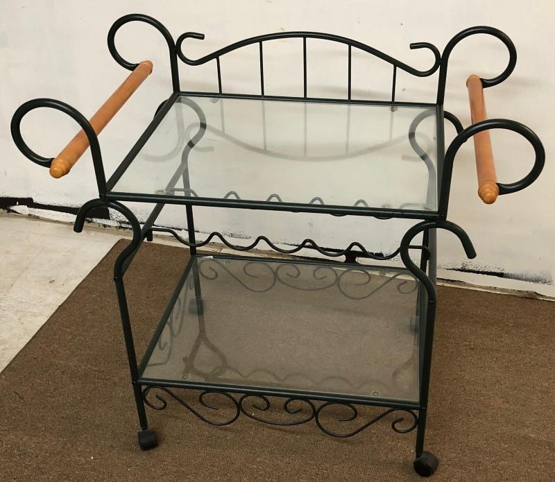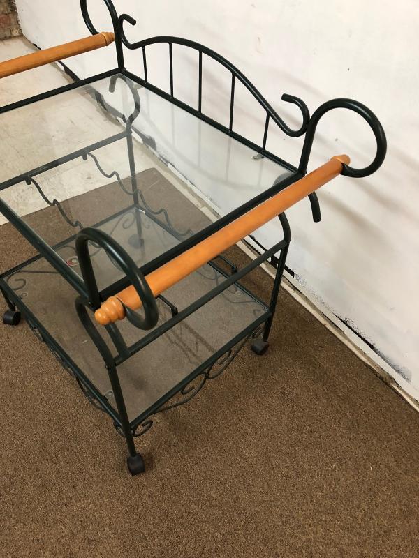 Excellent condition on this contemporary wrought iron bar cart...32" high..36" long...Bottle rack underneath....Glass top..wooden handles....