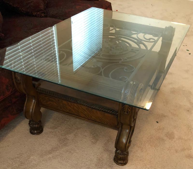 Beveled glass top on this contemporary wrought iron coffee table...32 x 48 x 20"....Excellent condition....