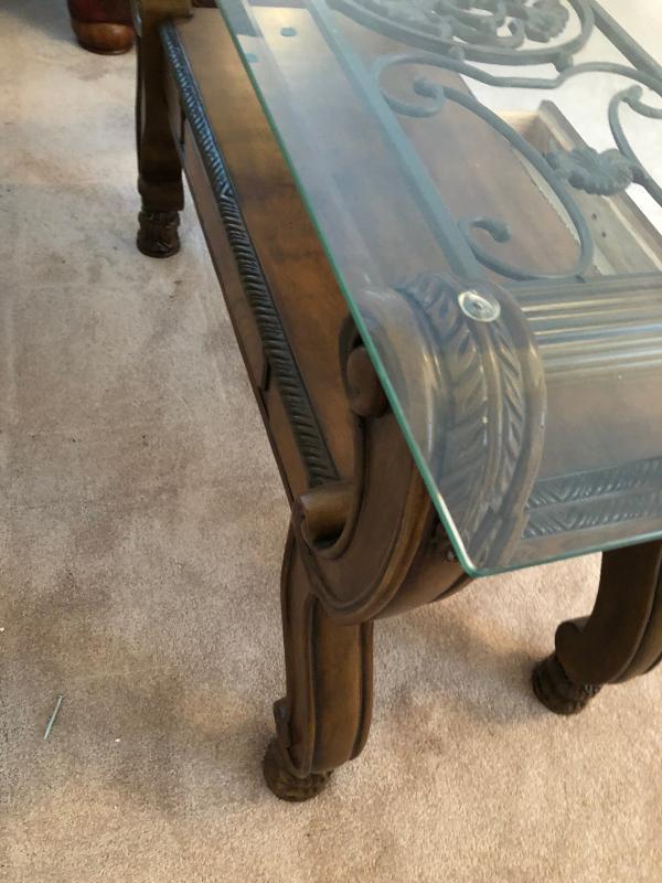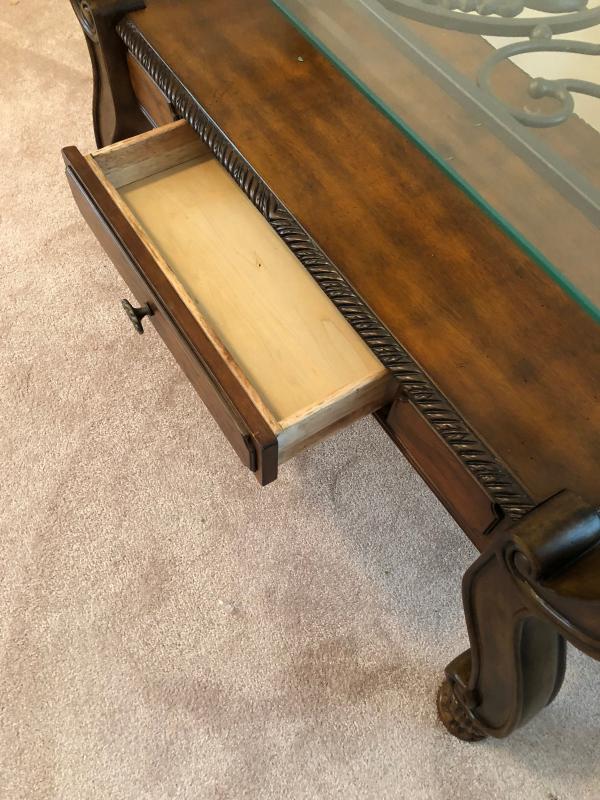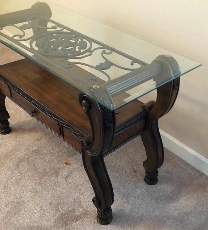 Excellent condition...Glass top on this contemporary style wrought iron sofa table....With drawer...48 x 20 x 30"...
