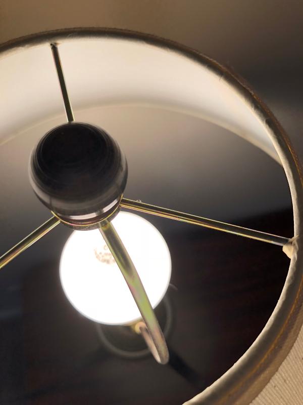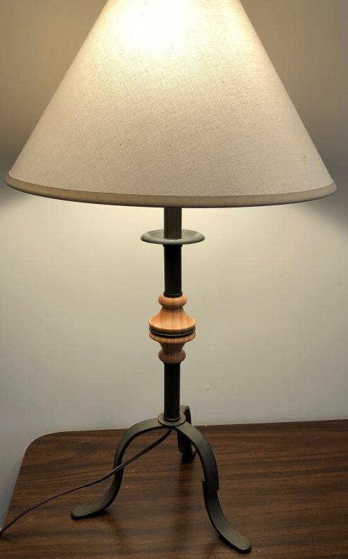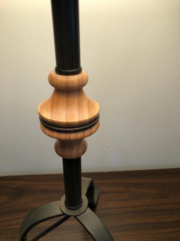 Excellent condition on this 30" tall contemporary wrought iron and wood table lamp with shade....