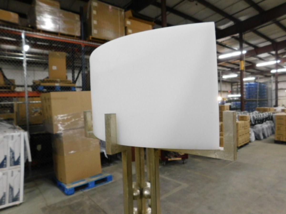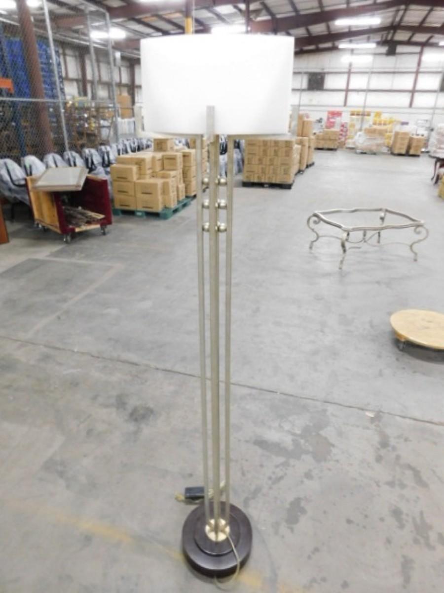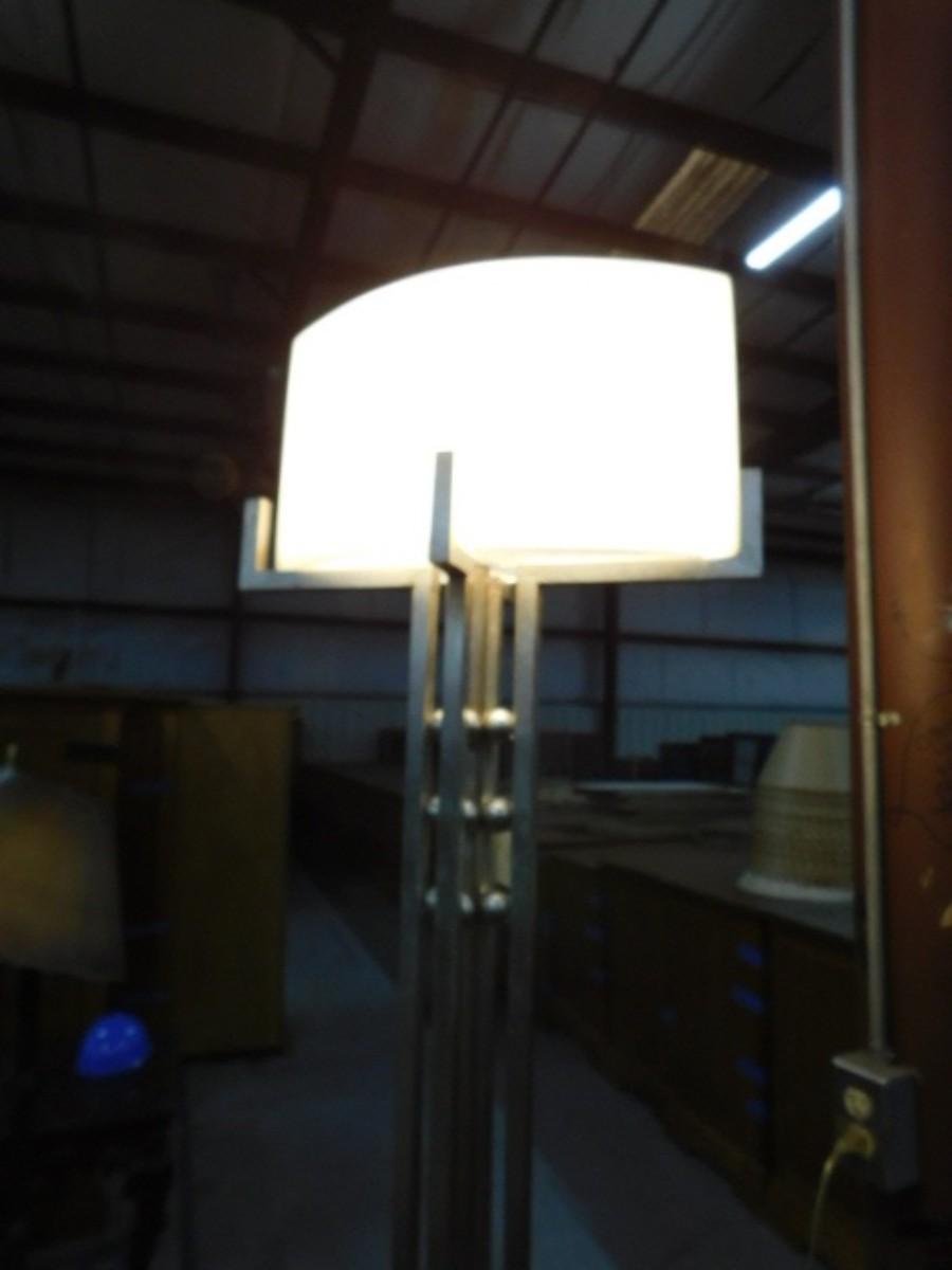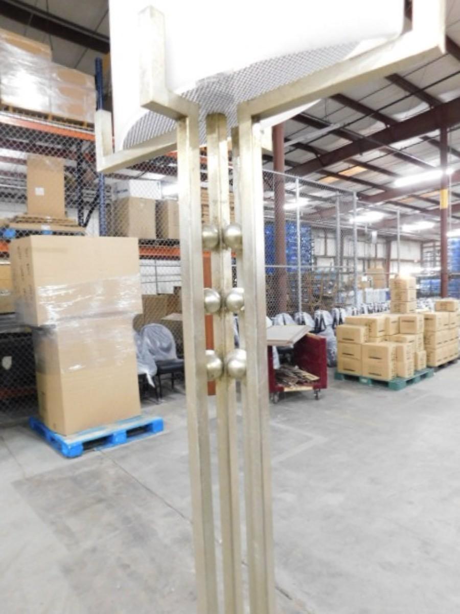 Contemporary Wrought Metal Floor Lamp with Shade. Expect wear or scratches to finish. Shipping option available via freight or local mover at Buyer's expense. Buyer must have all shipping scheduled within the stated dates and times of pickup. Recommended local mover is Beaty Bros. Moving 828-201-2982