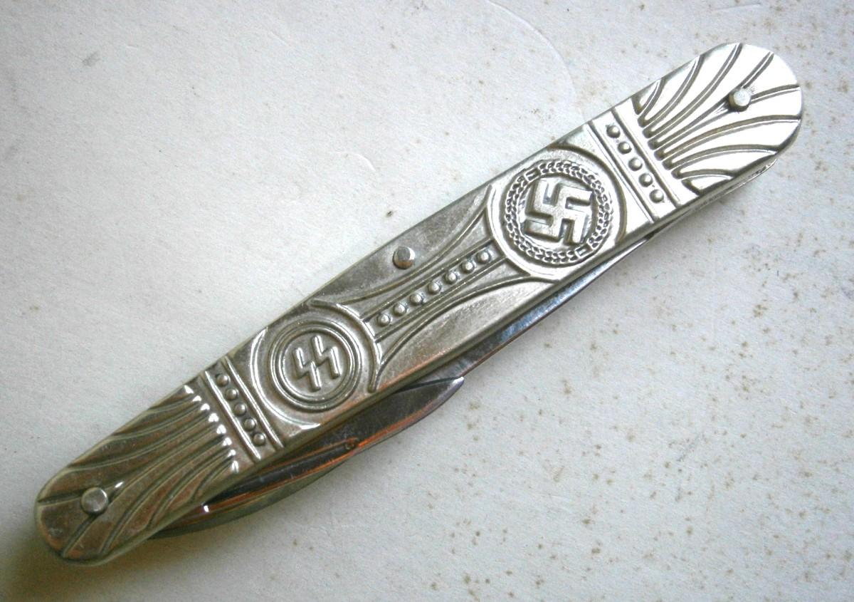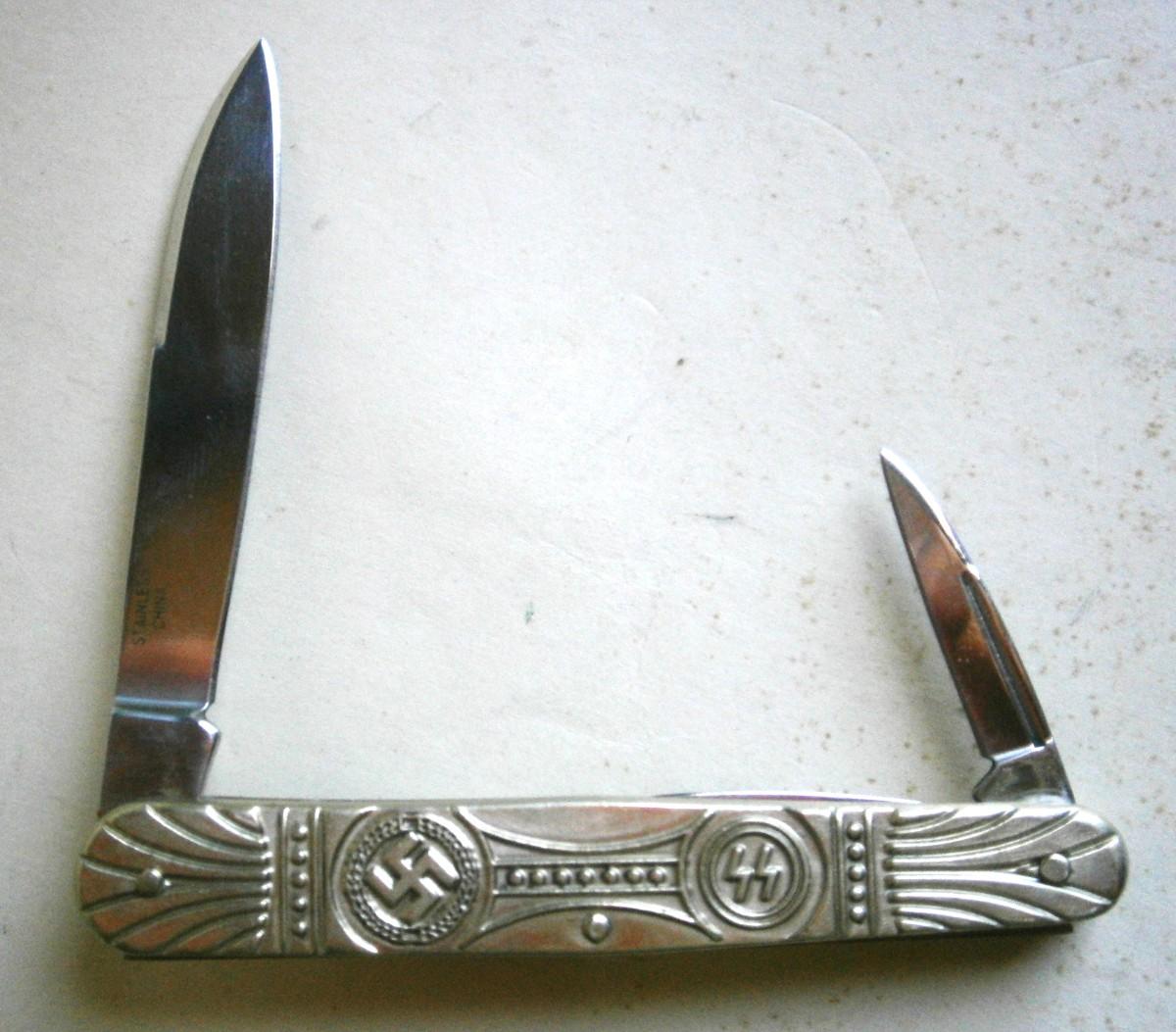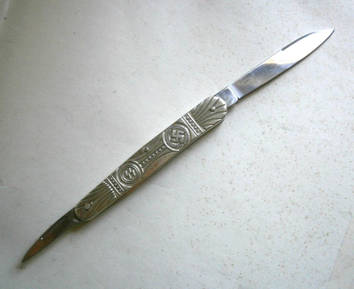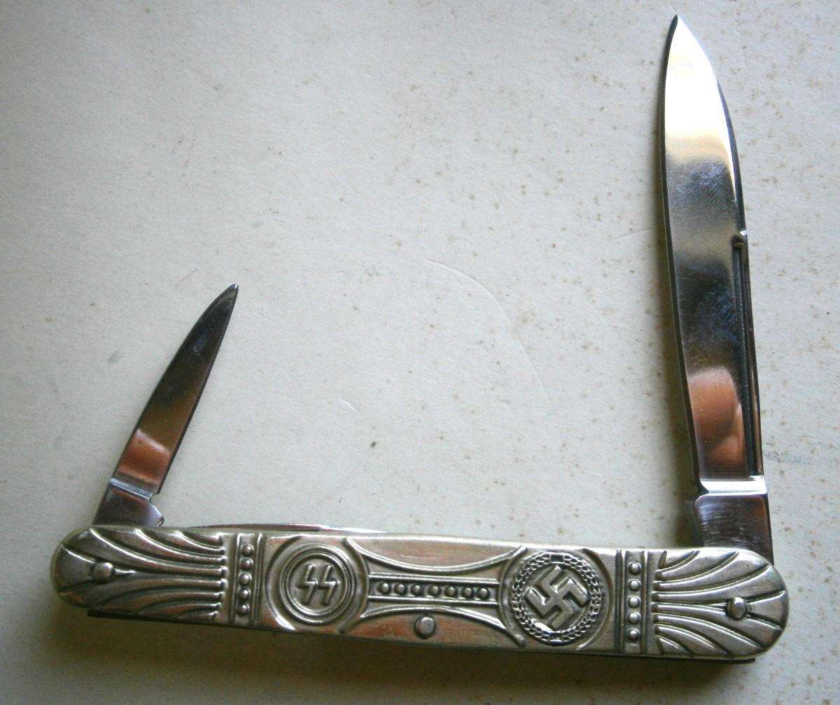 Contemporary WWII German Style Pocket Knife, 3 3/4 in. long (closed), cast metal handle with steel blade.