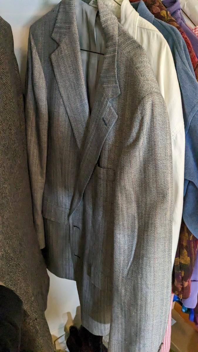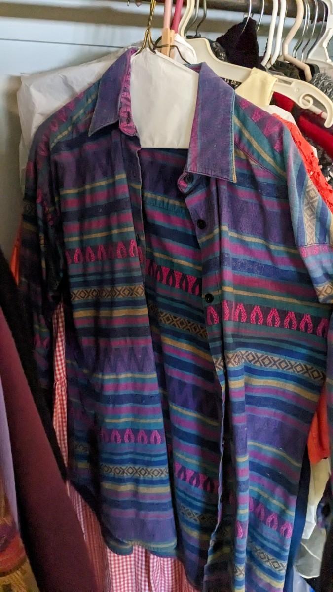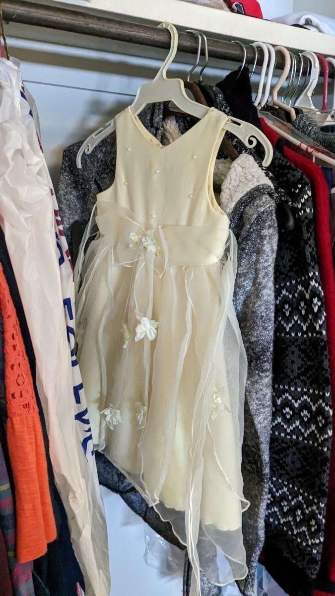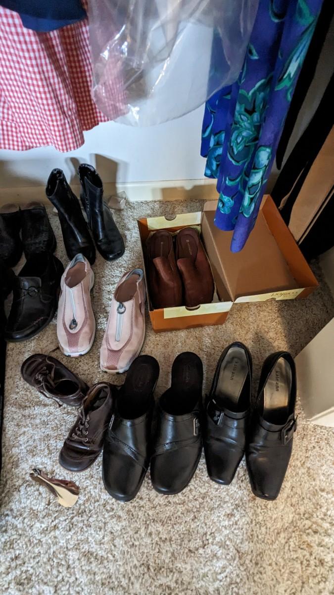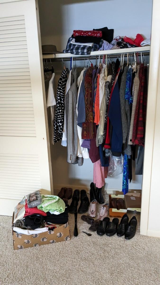 multi decade clothing, mainly women's Small or Medium with some men's XL as well. Includes nice women's shoes, size 7.5, and a beautiful pair of vintage leather kids shoes. Also includes some vintage men's clothing, a beautiful tie rack, nwt ladies scarves, a couple of toddler dresses, enough hangers for another closet, and SO MUCH more! No shipping. Winning bidder responsible for removal of all items. bdrm1