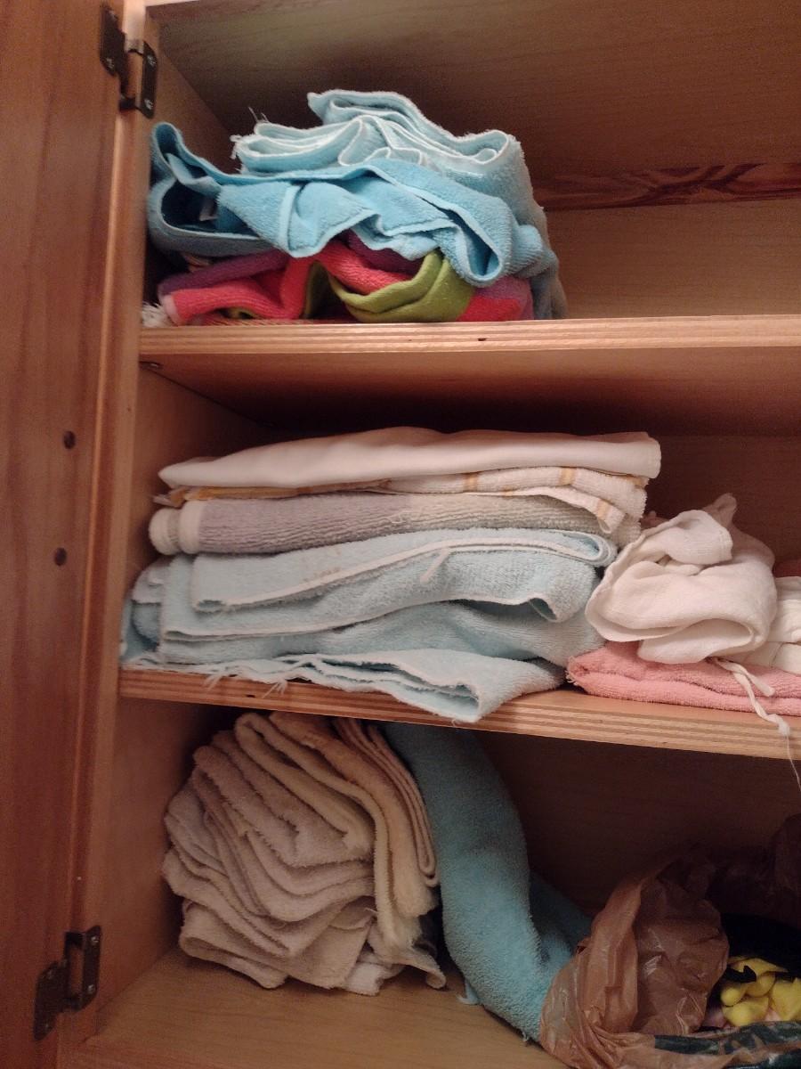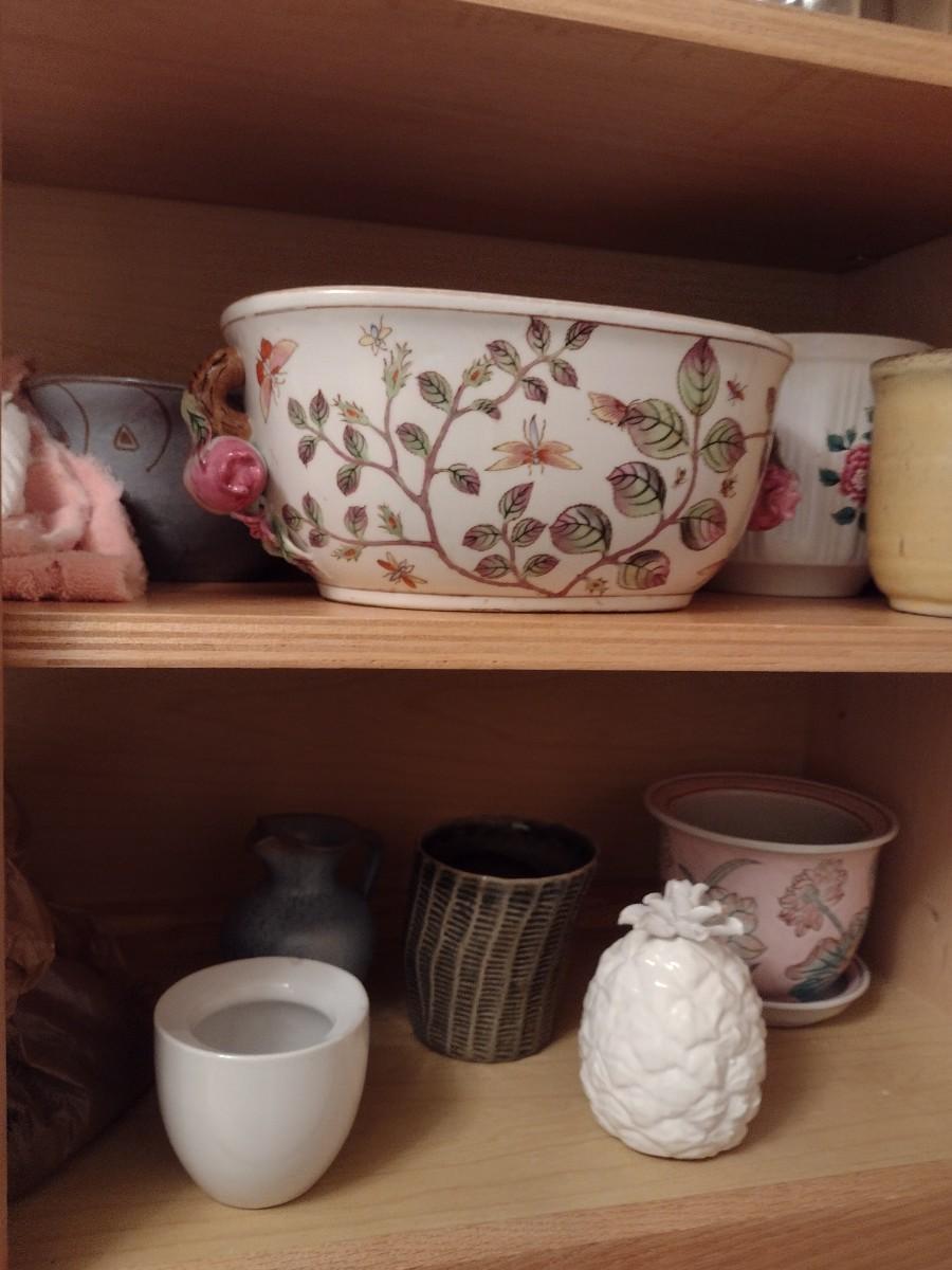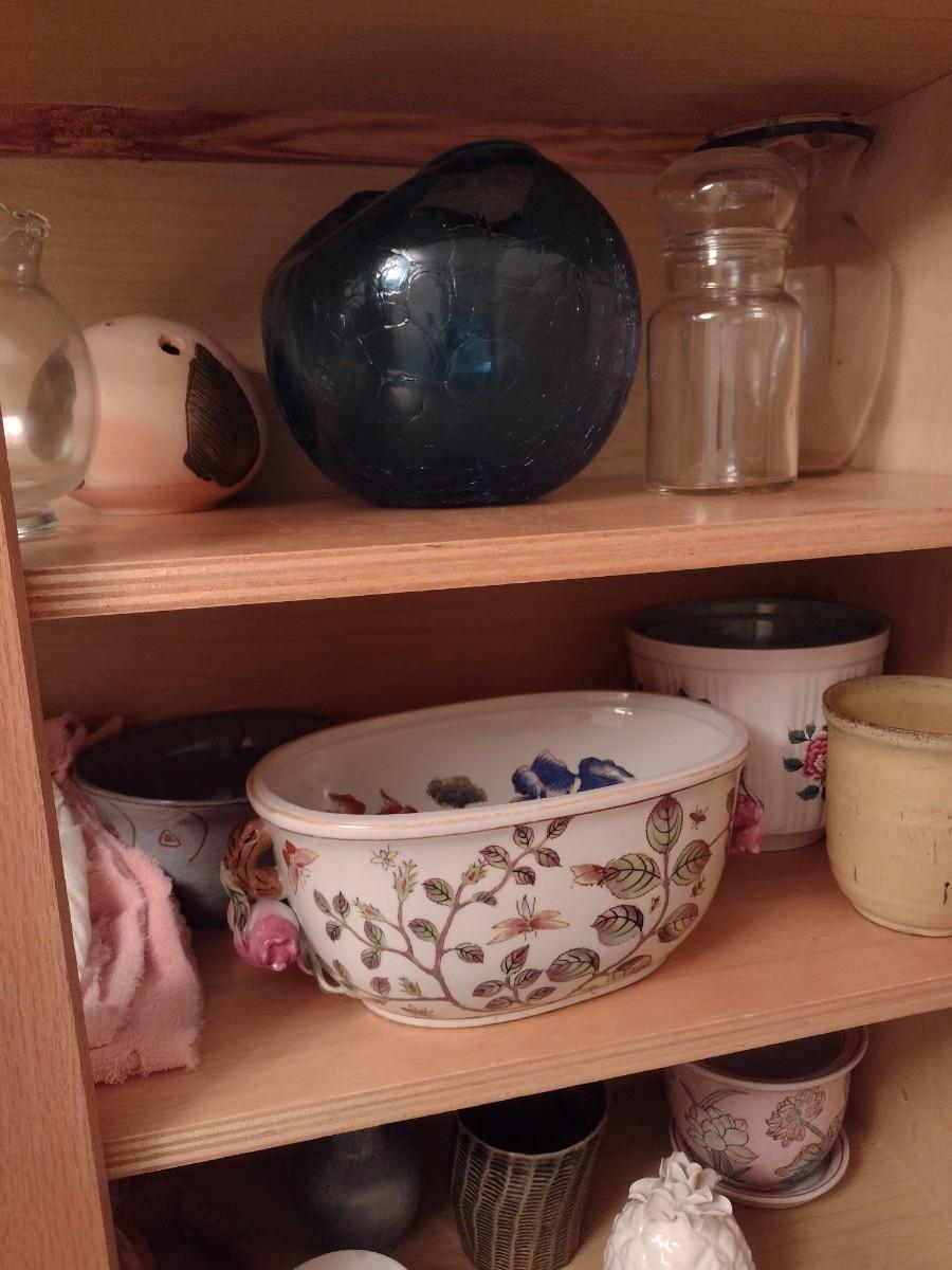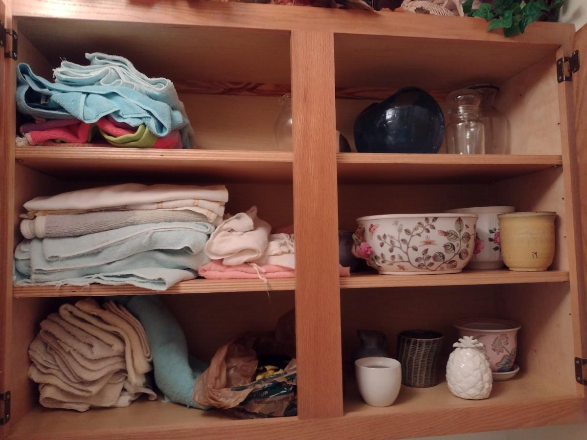Contents of Cabinet includes a Nice Assortment of Glass and Ceramic Planter Pots and Linens