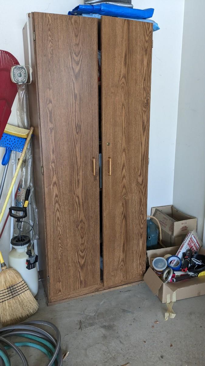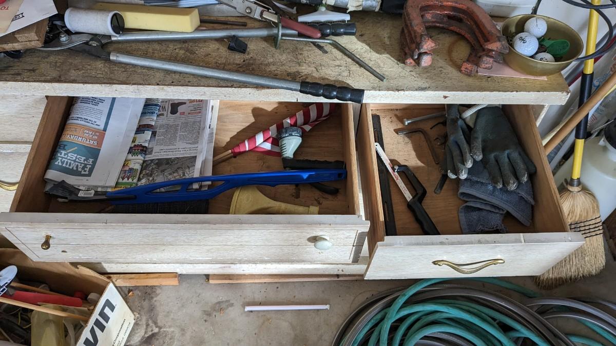 great mid century dresser with A GOB of various garage items. Lots of miscellaneous hardware, tools, cleaners and more! Includes small cabinet and it's contents too! No shipping. Winning bidder responsible for removal of ALL item