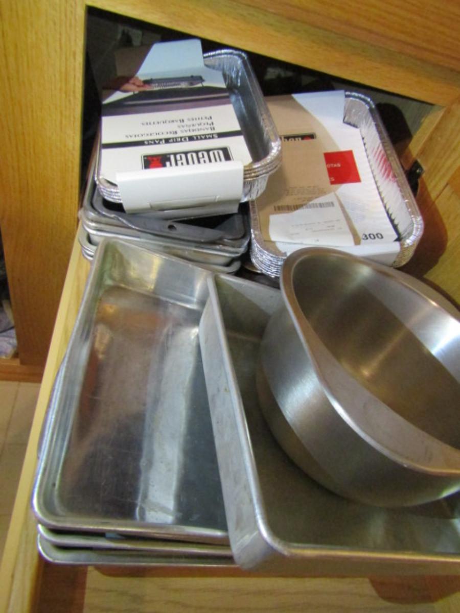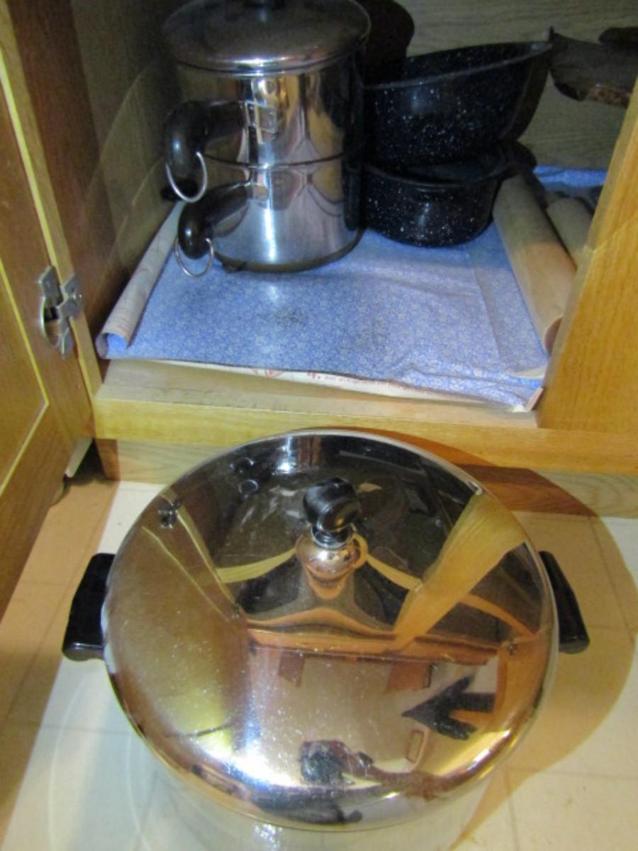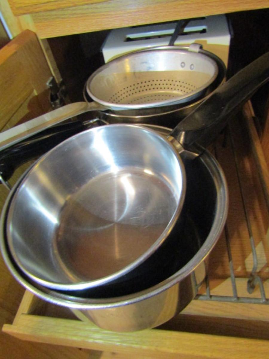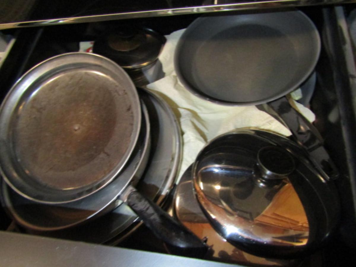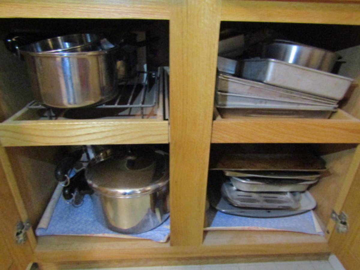 Contents of Kitchen Cabinet (E). Pots, pans, and bake ware.