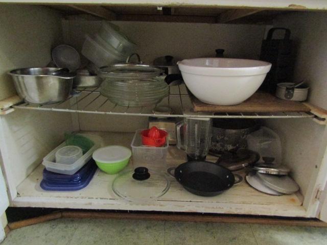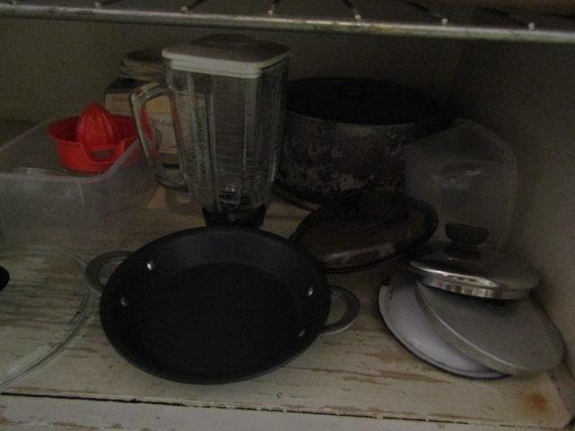 Contents of Kitchen Cabinet (Pots, Pans, Storage Containers, Blender)