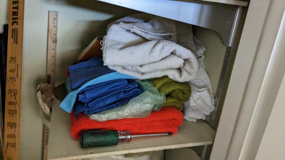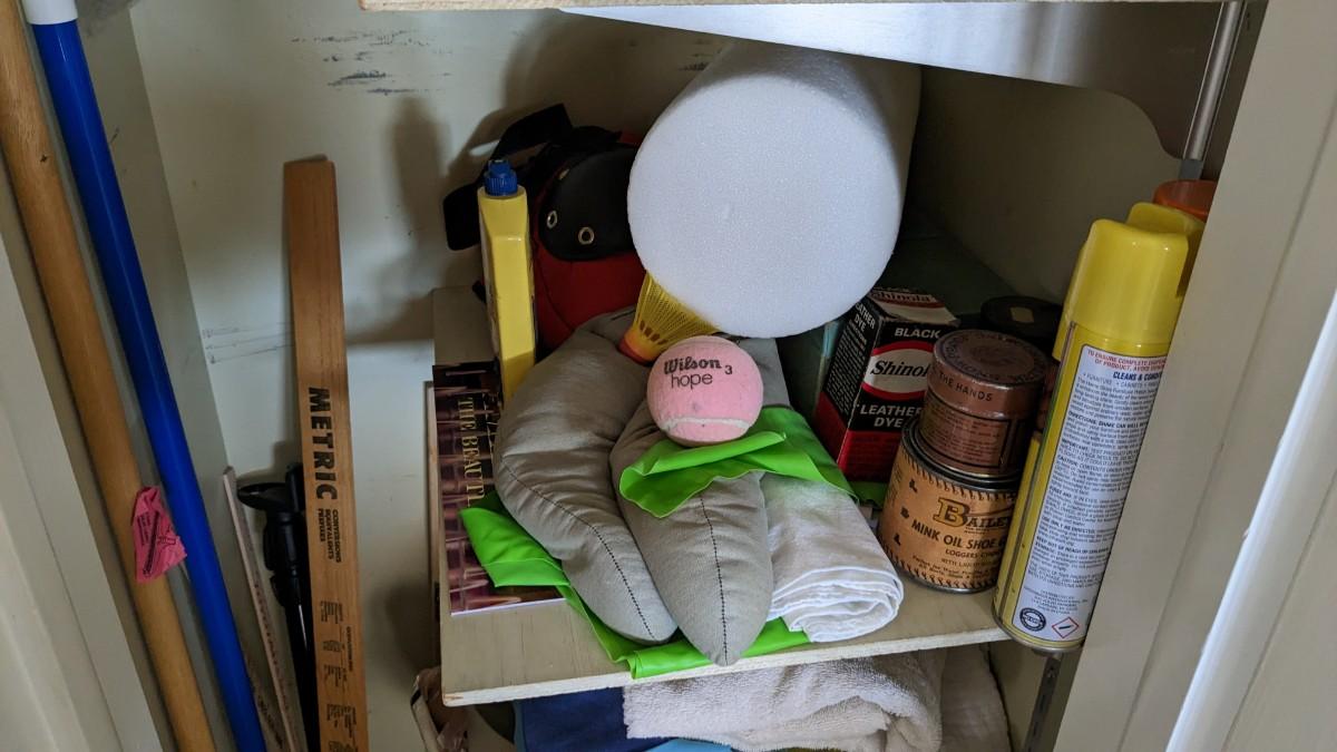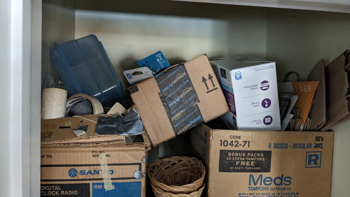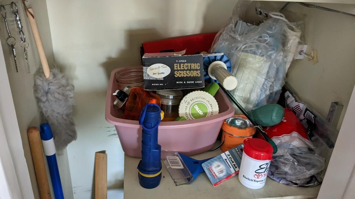 a huge catchall chock full of all sorts of household needs. Includes light bulbs, yard sticks, cleaning items, bags, rags, small tools, tapes, and so much more. No shipping. Winning bidder responsible for removal of all items.