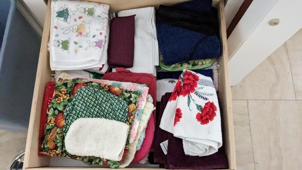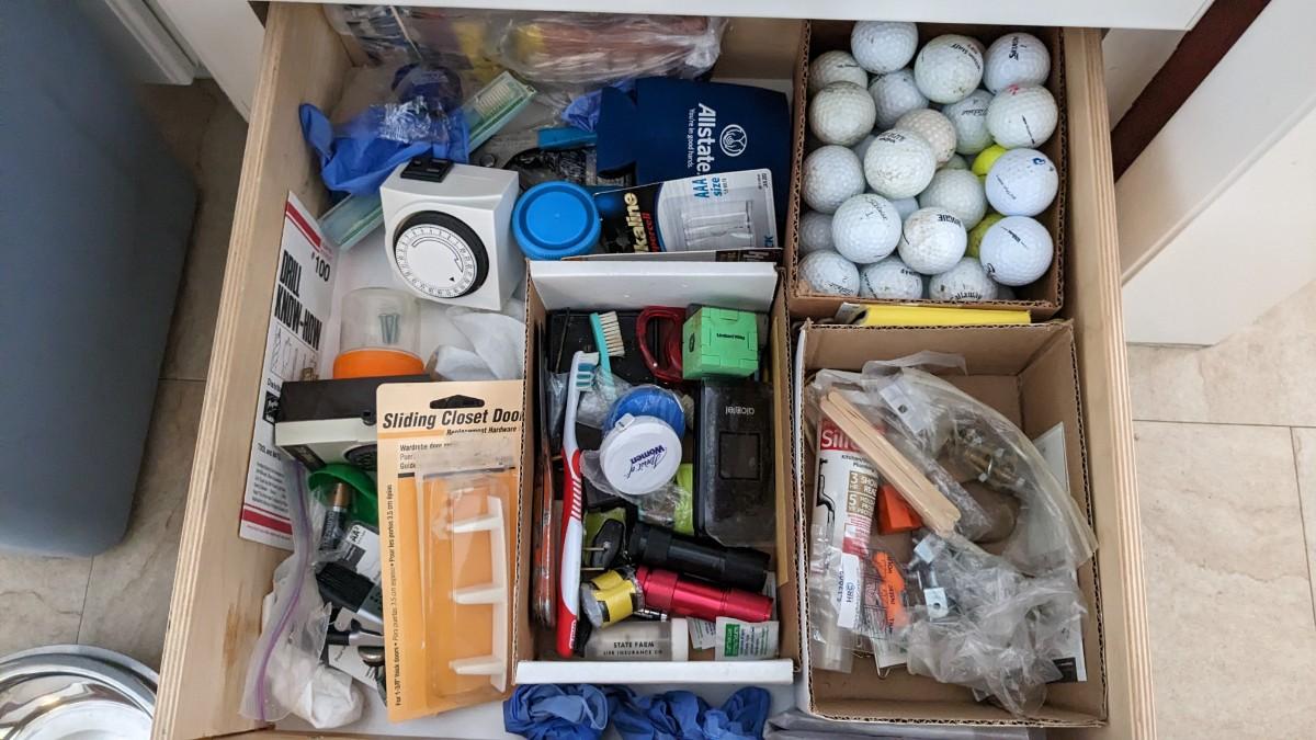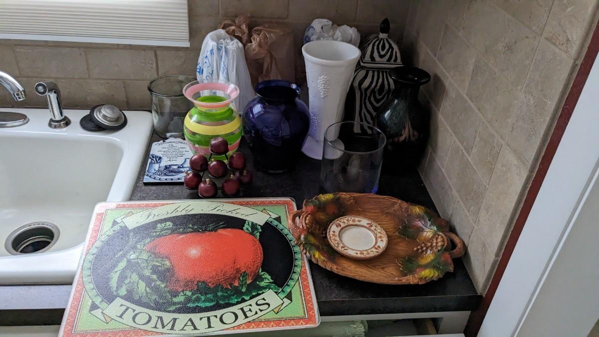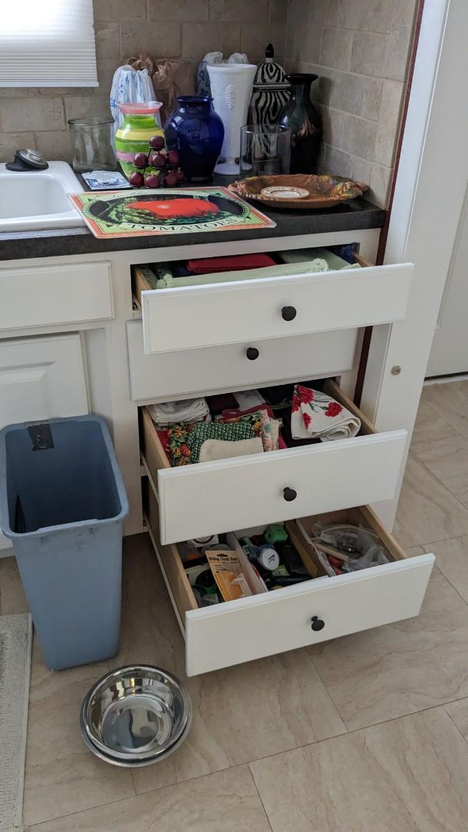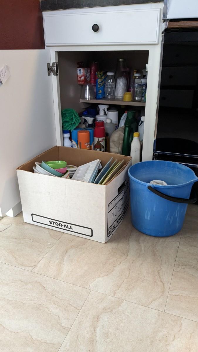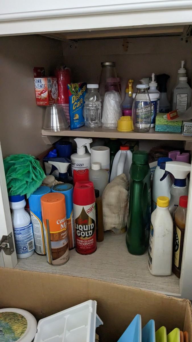 a great stack of new and barely used cleaners and household chemicals, a great catch all drawer full of golf balls, small tools, and various hardware. 2 drawers full of kitchen linens. A collection of vases, a zebra cookie jar with broken handle, a little kitchen decor, and box full of plastic dishes. No shipping. Winning bidder responsible for removal of all items.