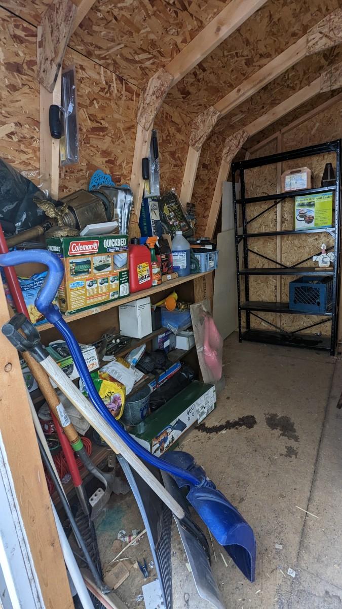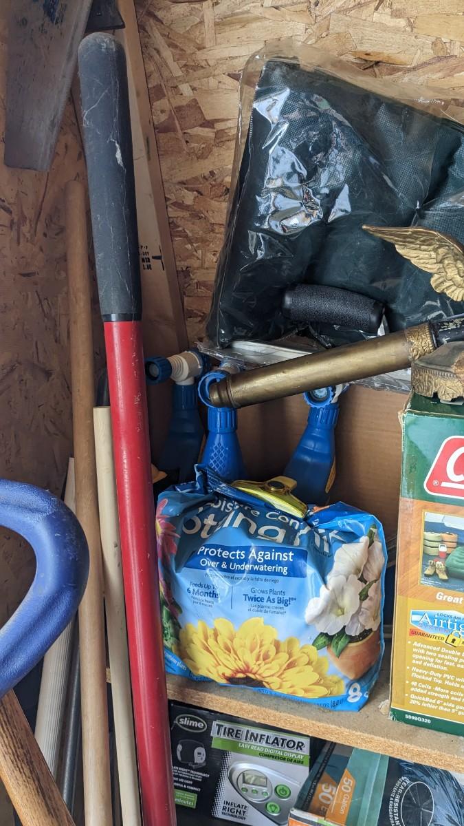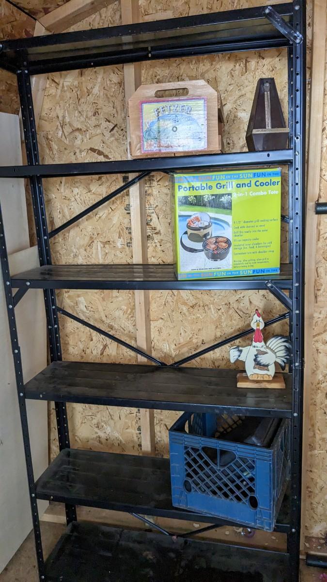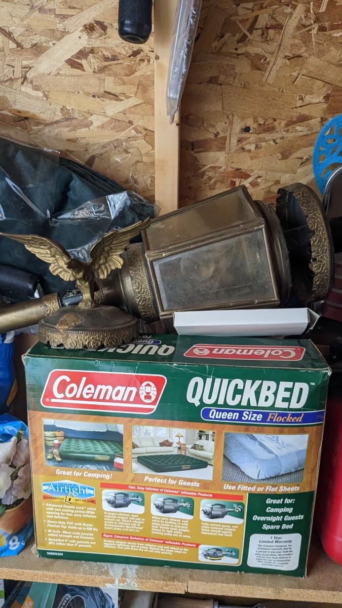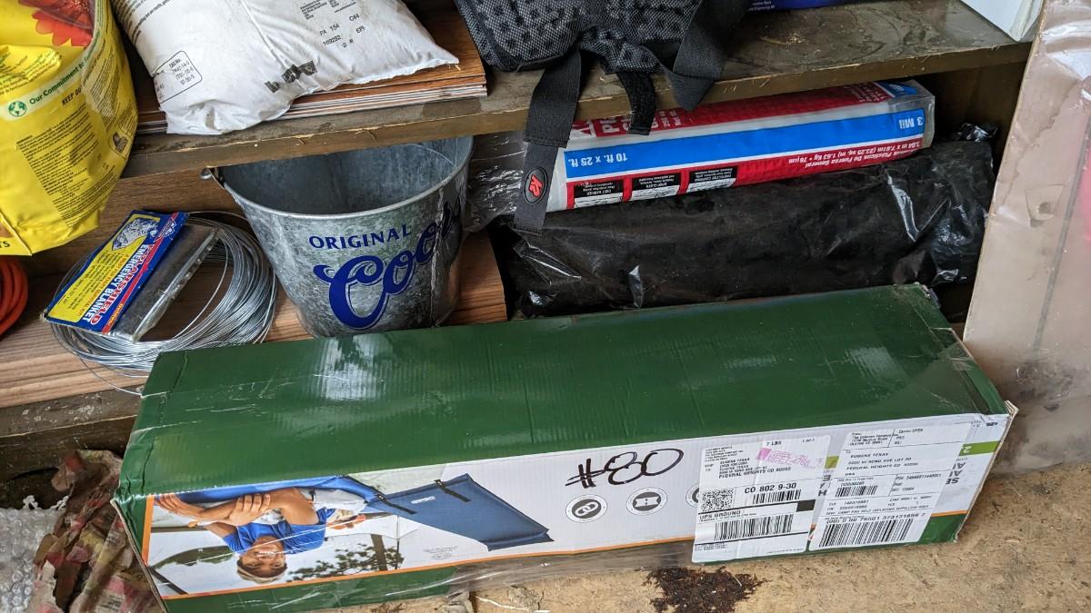 A stacked lot of almost all new, in-package items, yard tools, camping gear, and a super fun street light with federal eagle topper. Also includes 36.25"x11.5"x73 5/8" aluminum garage shelf and a couple of pieces of particle board. No shipping. winning bidder responsible for removal of all items. shed