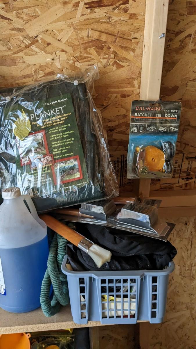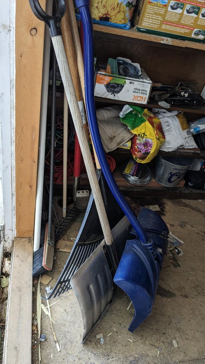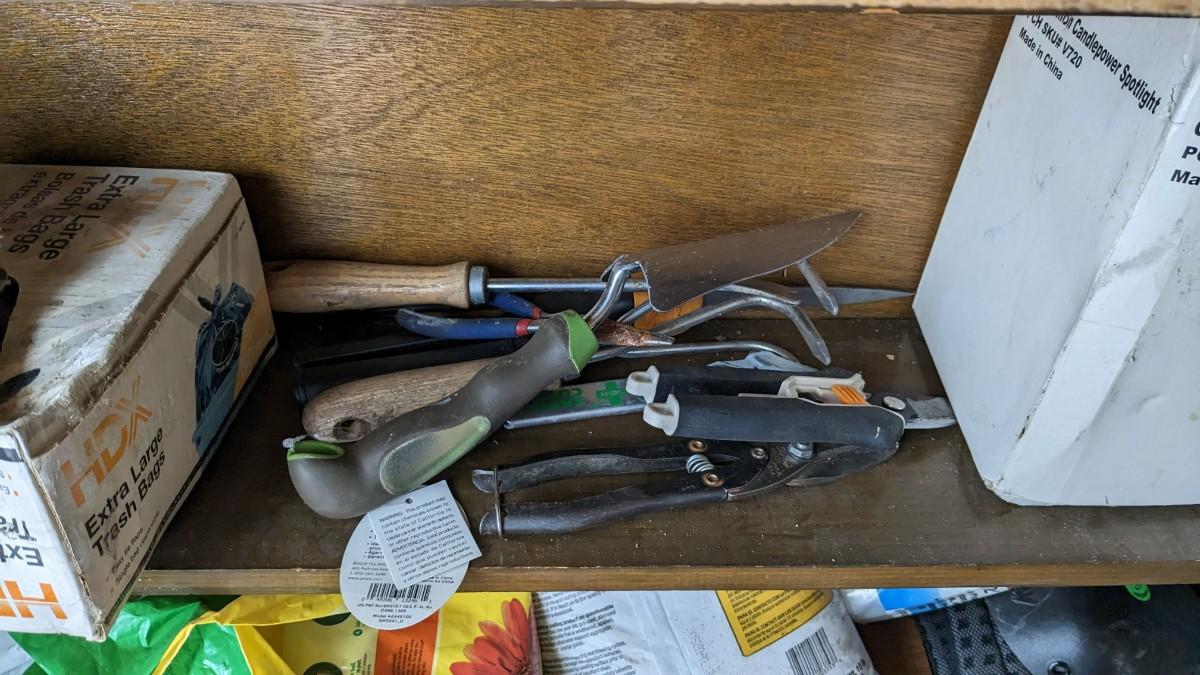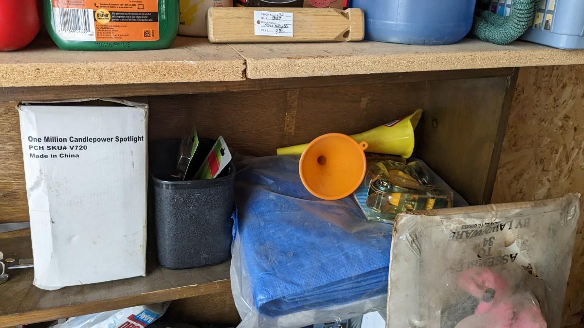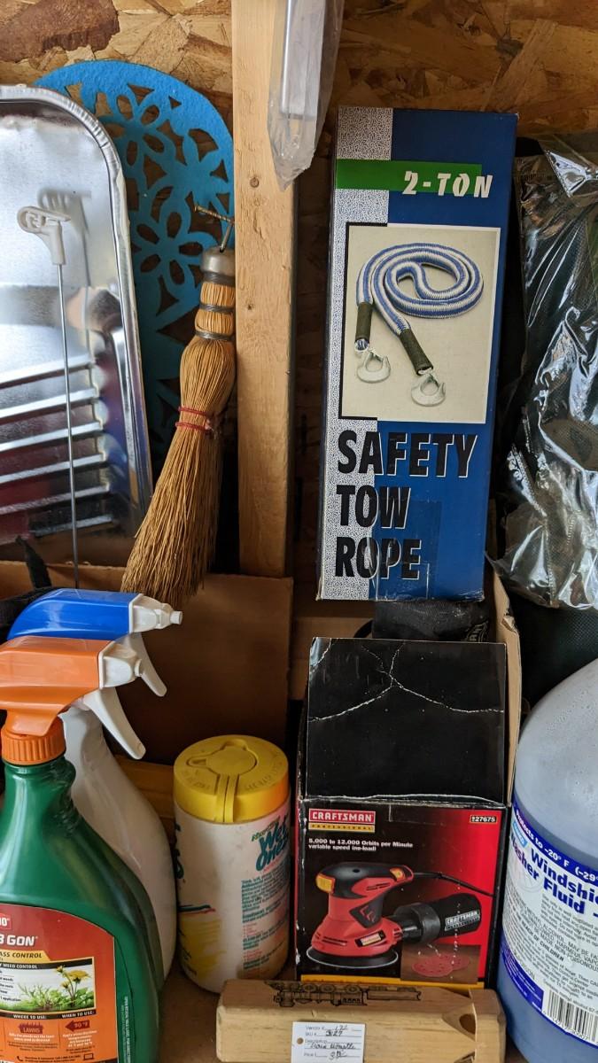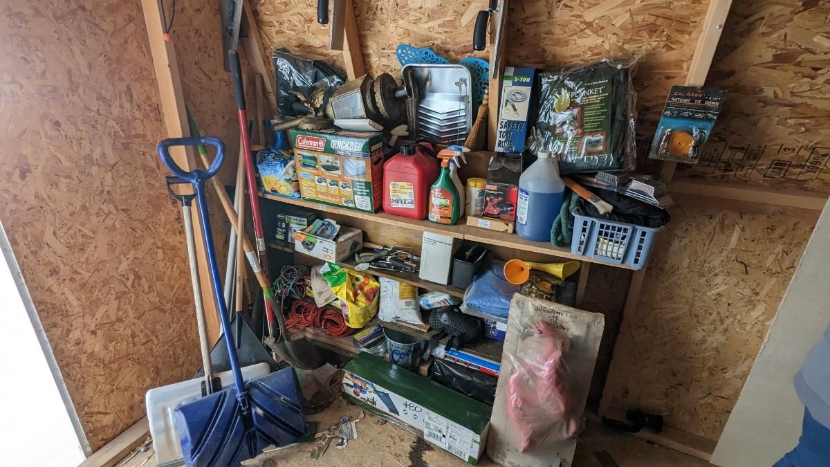 A stacked lot of almost all new, in-package items, yard tools, camping gear, and a super fun street light with federal eagle topper. Also includes 36.25"x11.5"x73 5/8" aluminum garage shelf and a couple of pieces of particle board. No shipping. winning bidder responsible for removal of all items. shed
