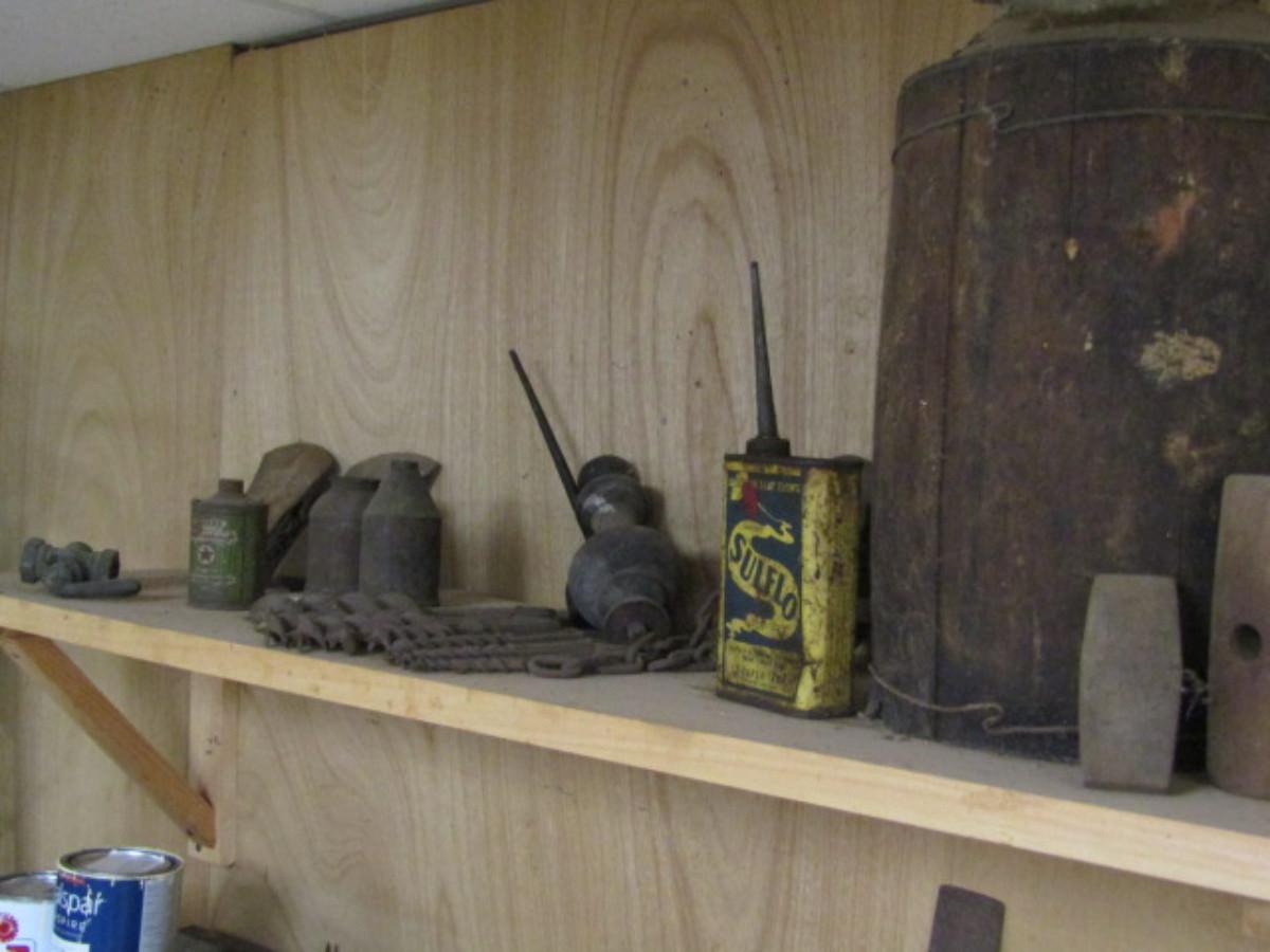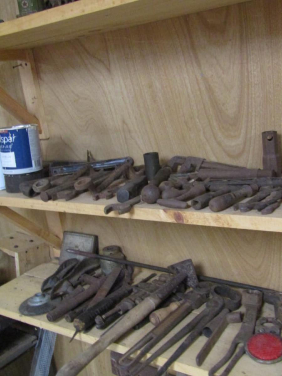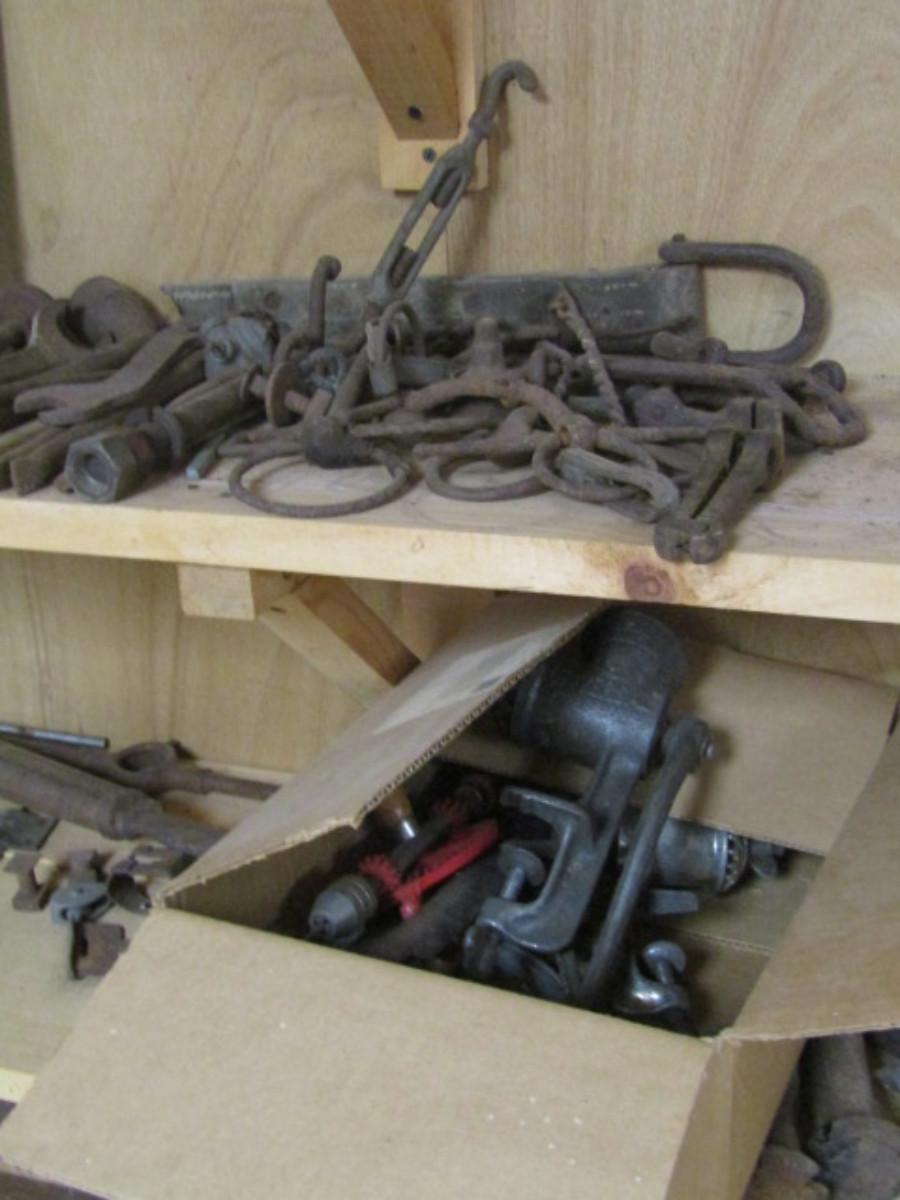 Contents of Shelves- Left Hand Side Only. Hand saws hanging on wall not included. Stored in non-climatized basement so expect item may need to be cleaned from dust, insects, etc.