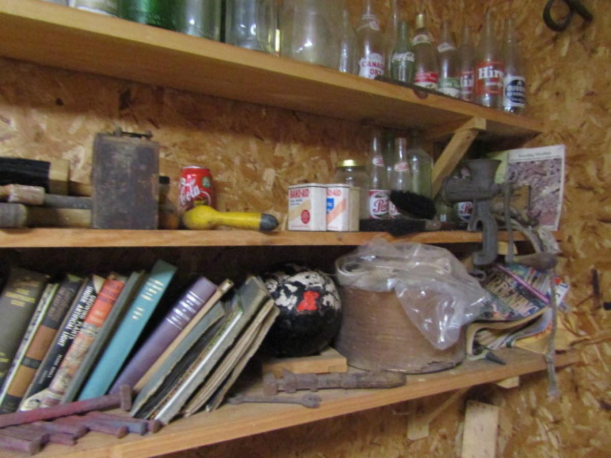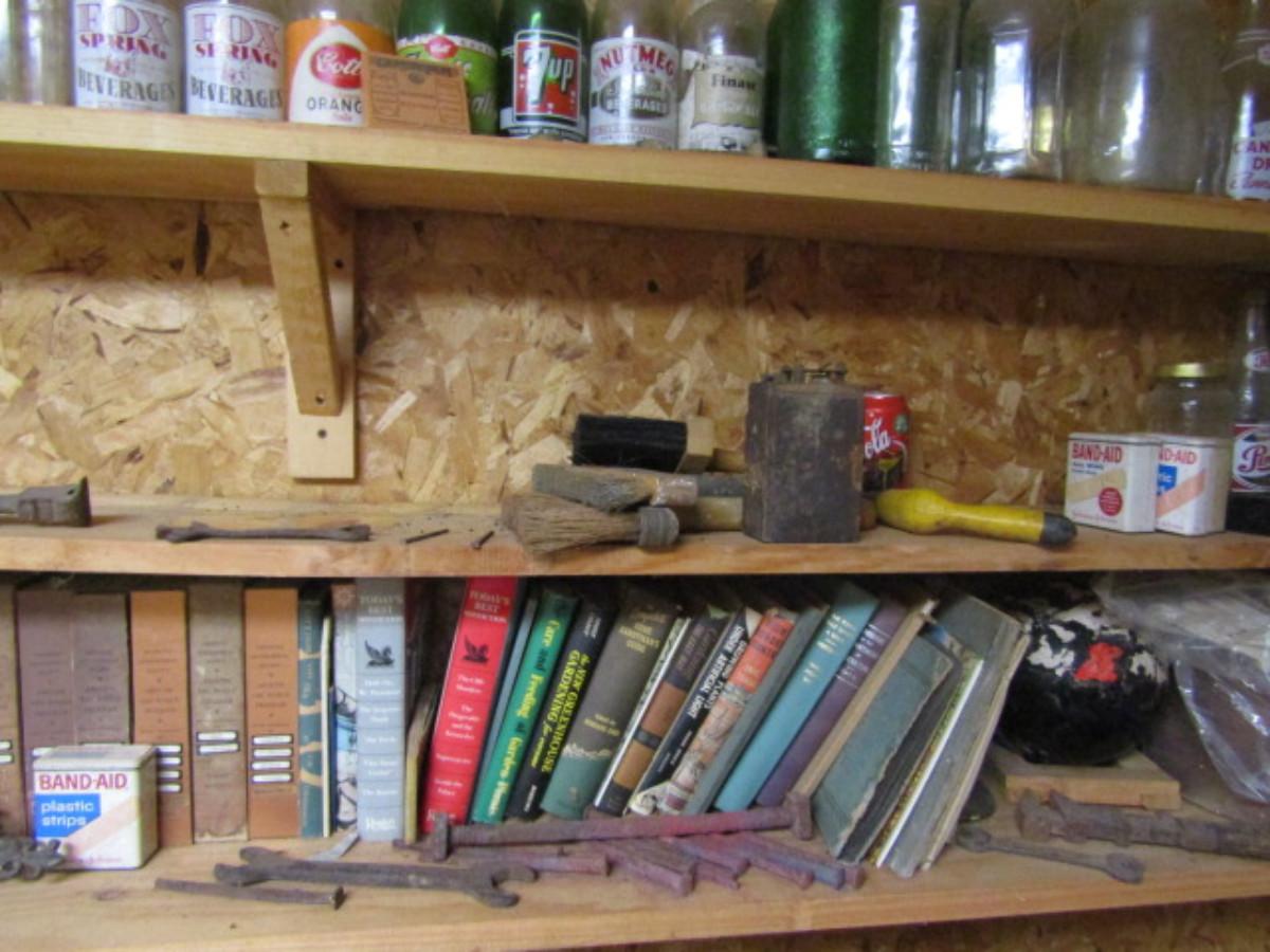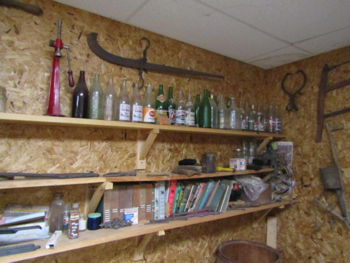 Contents of Shelves- Vintage Bottles and Corker, Assortment of Books, etc.. Only items on shelves convey with this lot- no tools on walls are included. Stored in non-climatized basement so expect item may need to be cleaned from dust, insects, etc.