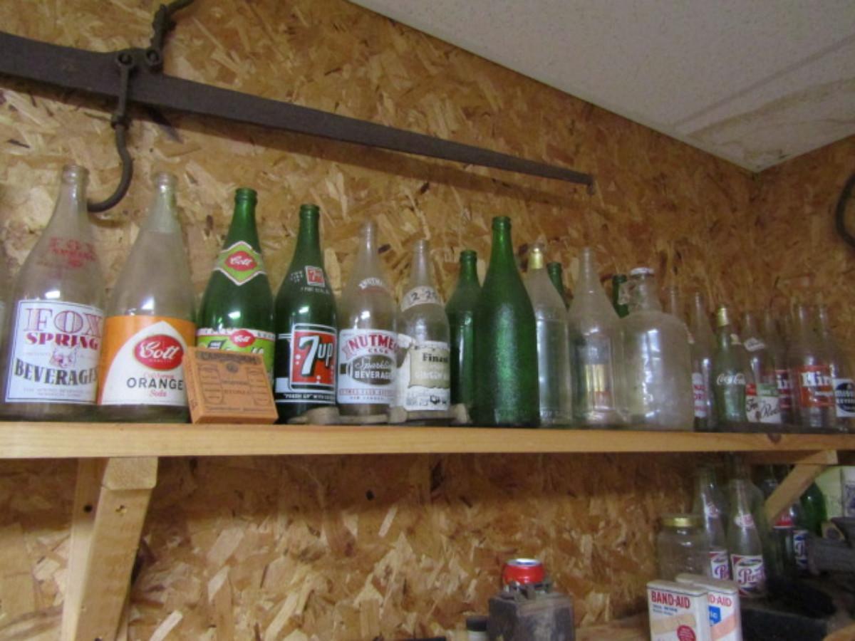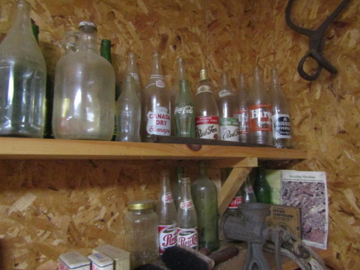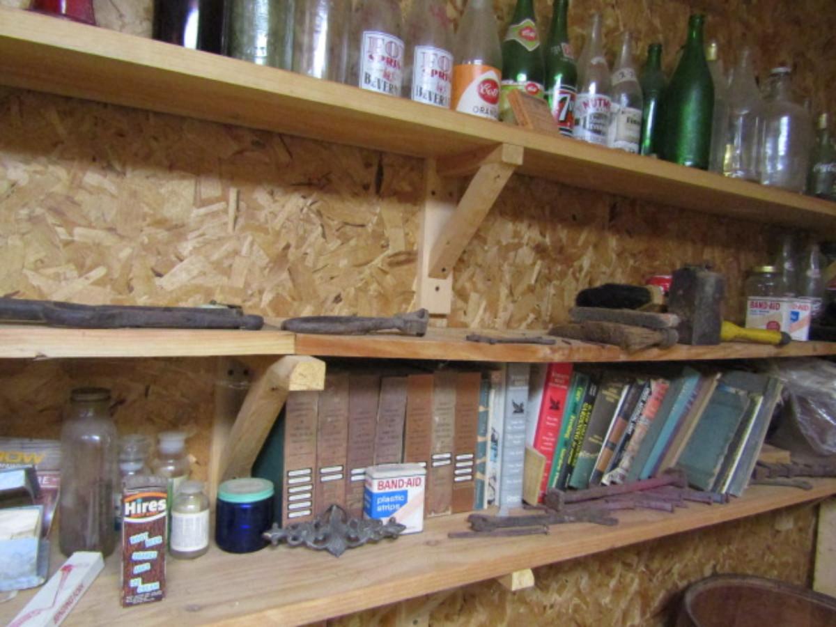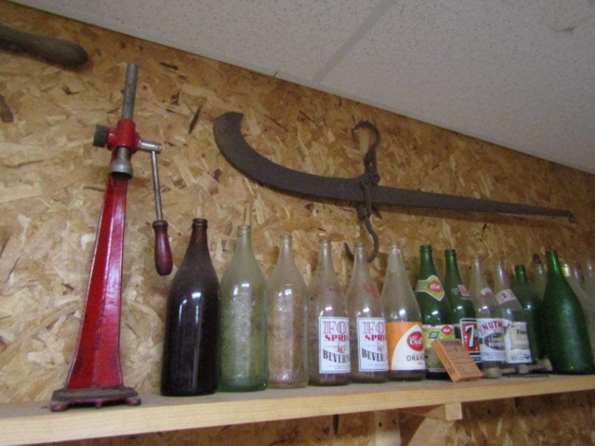 Contents of Shelves- Vintage Bottles and Corker, Assortment of Books, etc.. Only items on shelves convey with this lot- no tools on walls are included. Stored in non-climatized basement so expect item may need to be cleaned from dust, insects, etc.