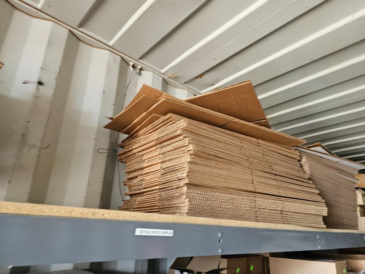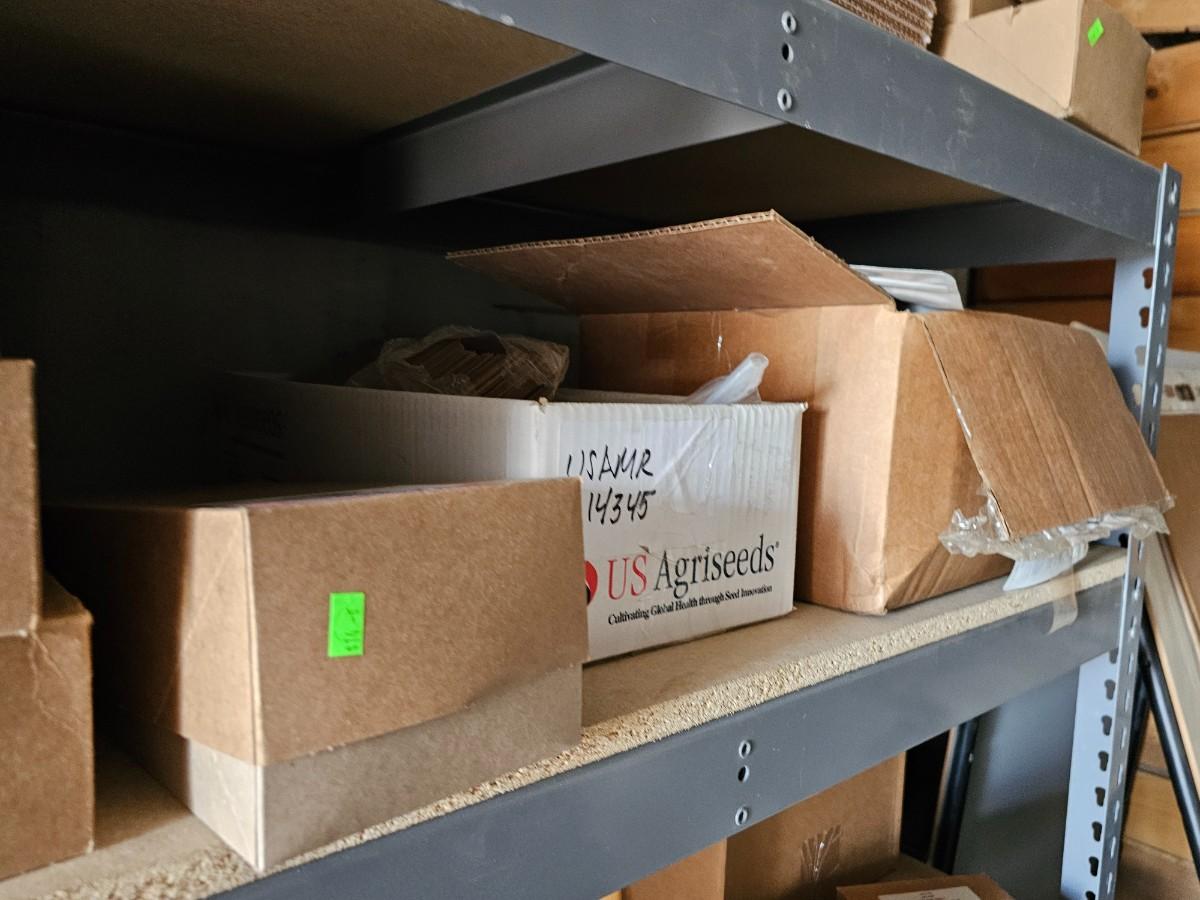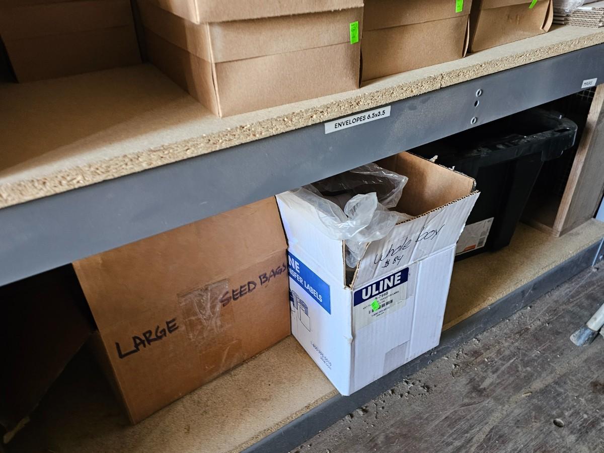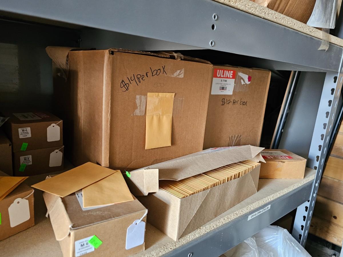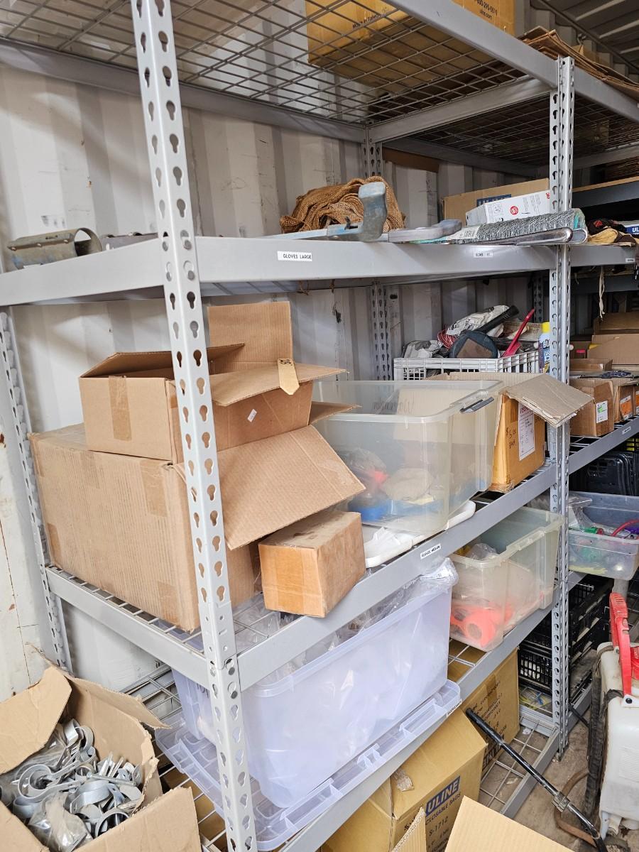 Container #3 tools, heavy metal shelving, fittings, storage bags, shipping boxes, Uline supplies,