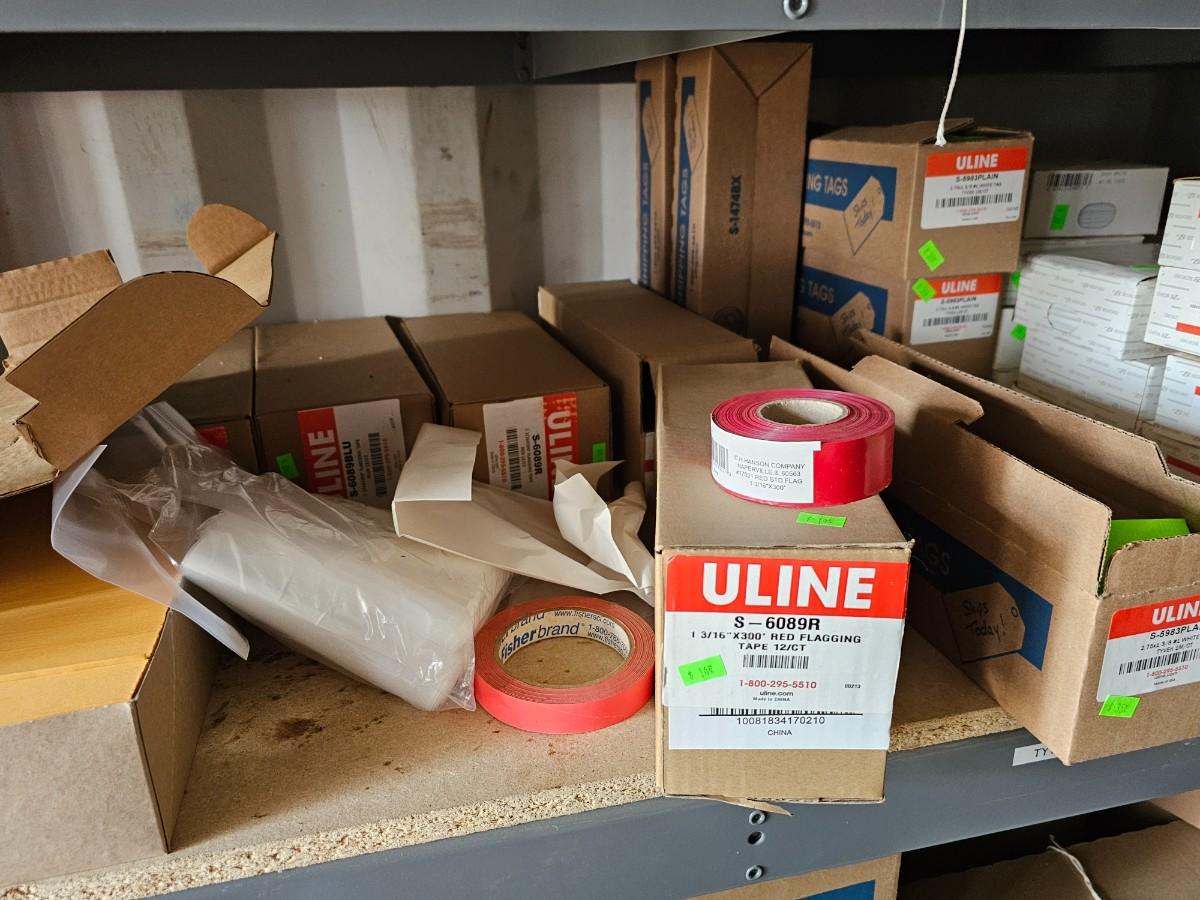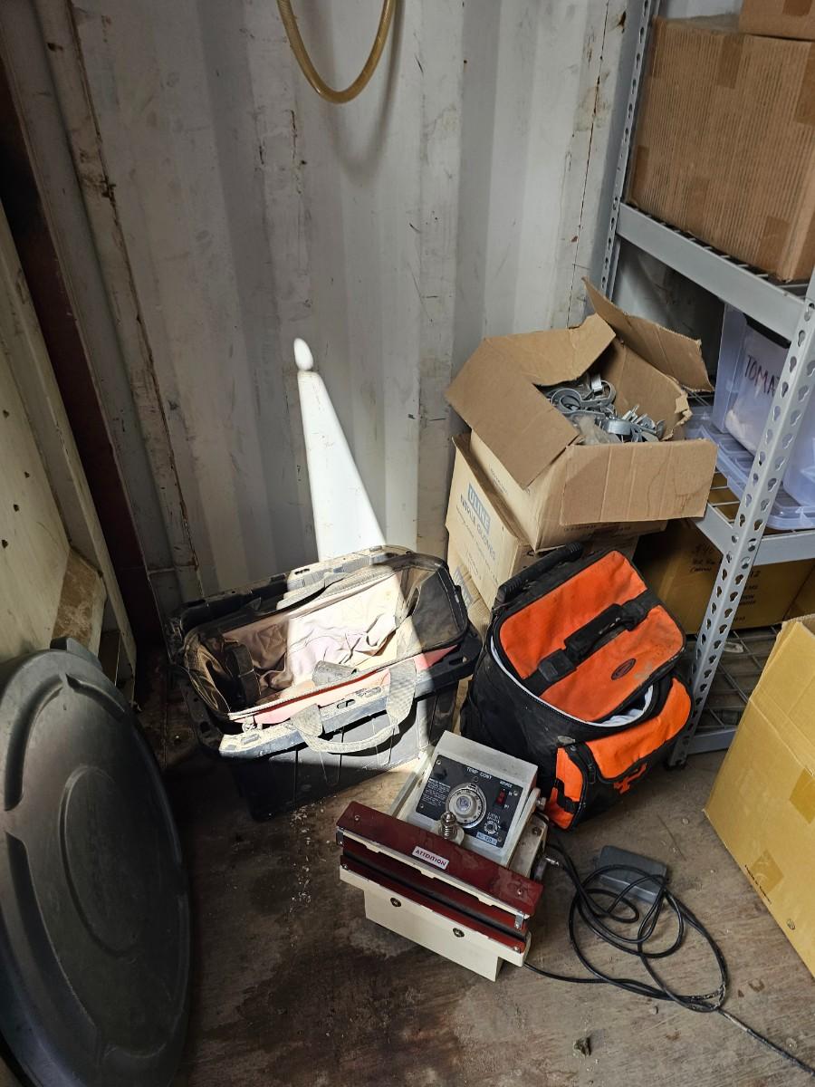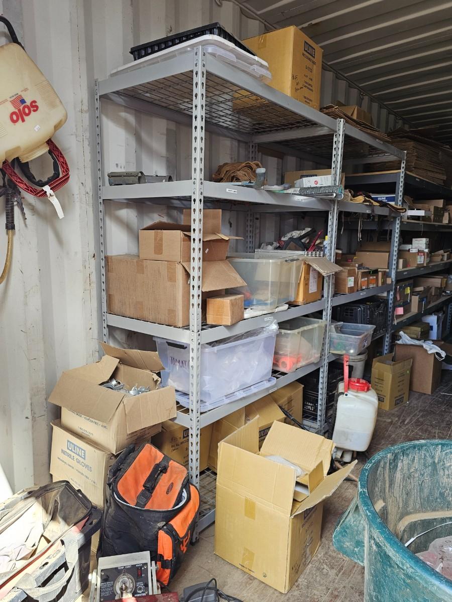 Container #3 tools, heavy metal shelving, fittings, storage bags, shipping boxes, Uline supplies,