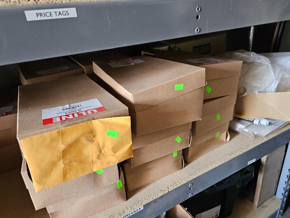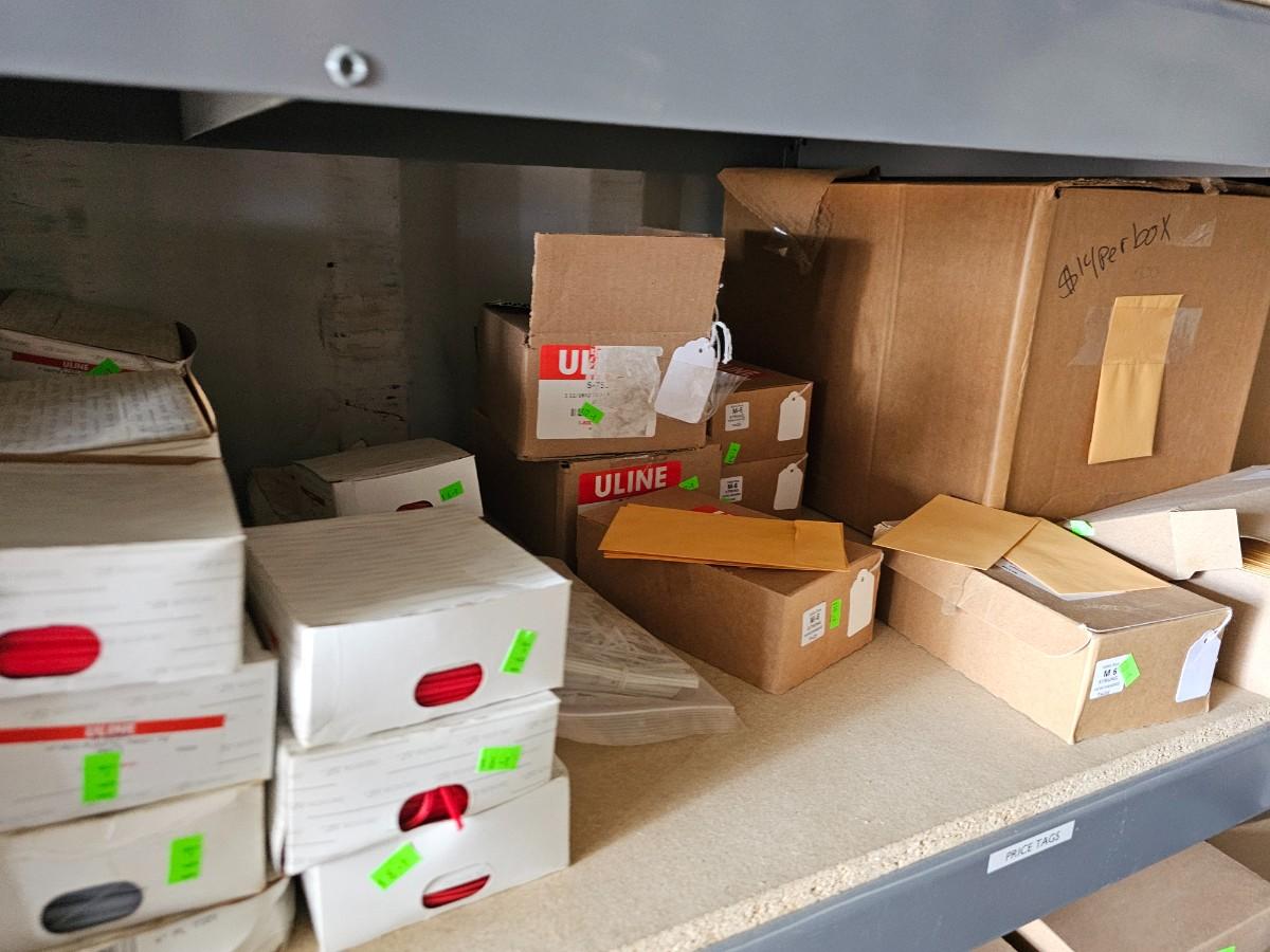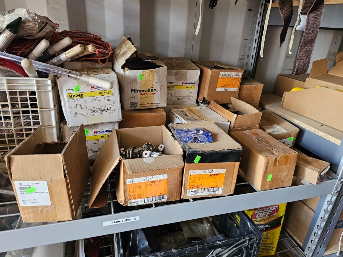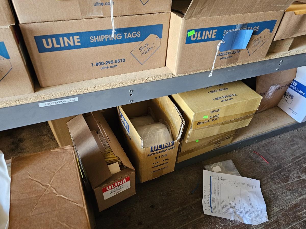 Container #3 tools, heavy metal shelving, fittings, storage bags, shipping boxes, Uline supplies,