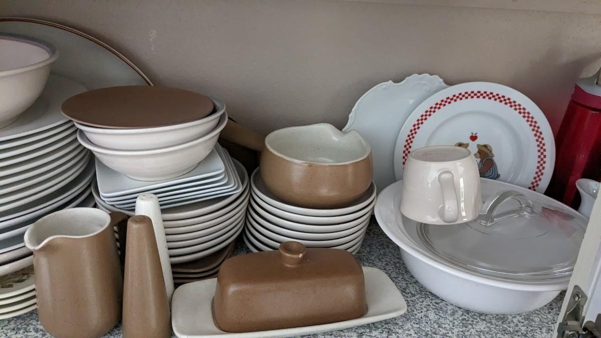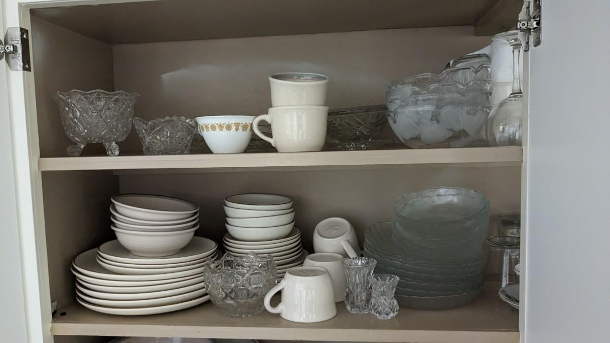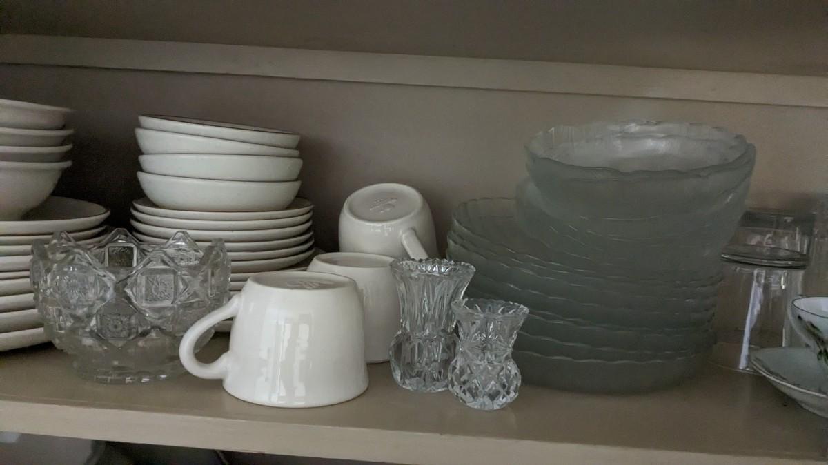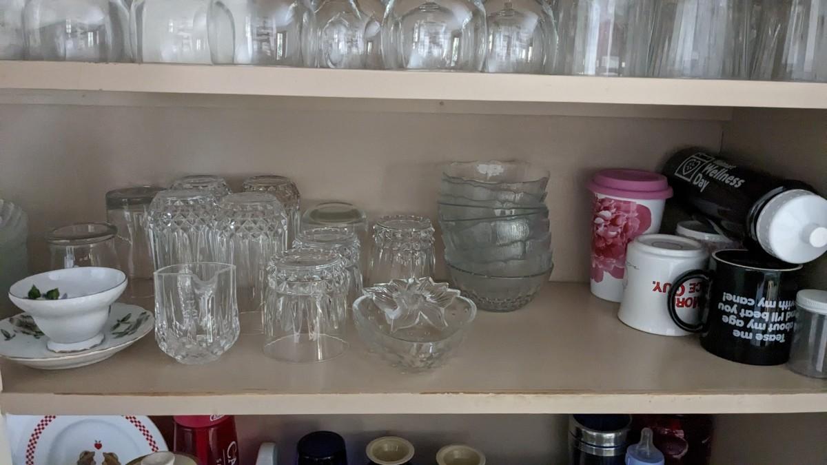 A STACKED assortment of beautiful vintage and contemporary dishes, glasses, cups, mugs, and more! includes Pfaltzgraff, a stunning unmarked stoneware set, cut glass, salad sets, wine glasses, and so much more!! All in great shape! No shipping. Winning bidder responsible for removal of all items.