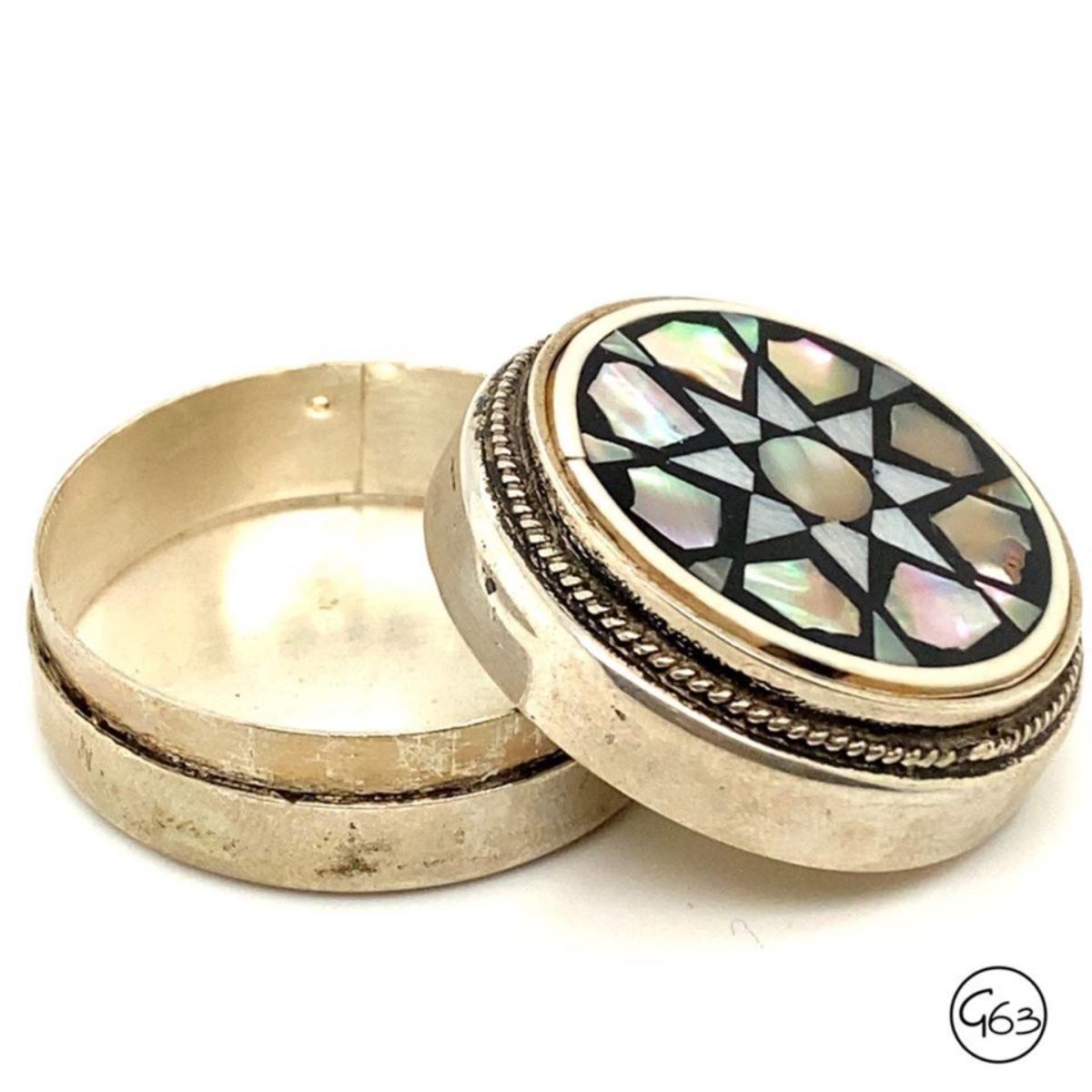 Stamped with pictorial hallmarks. Measures approx. 1.5" diameter, 5/8"H.