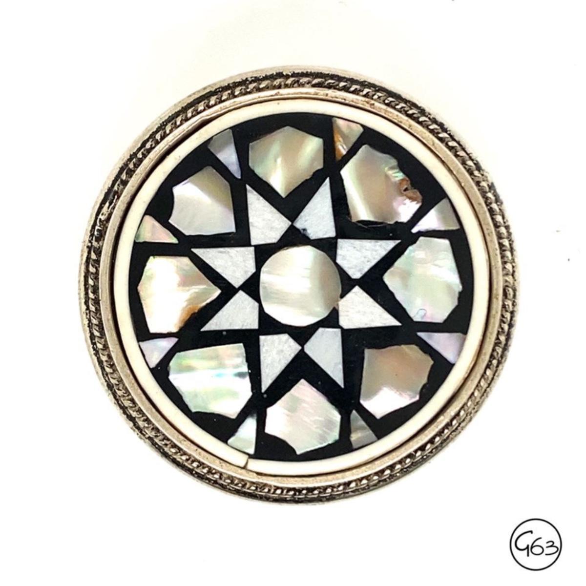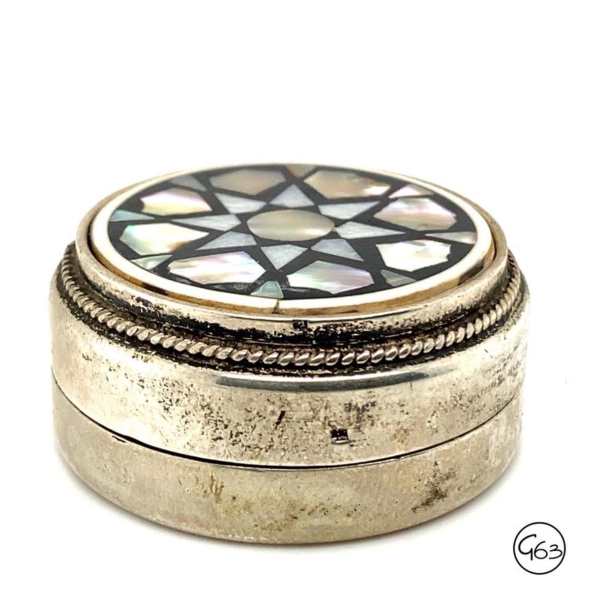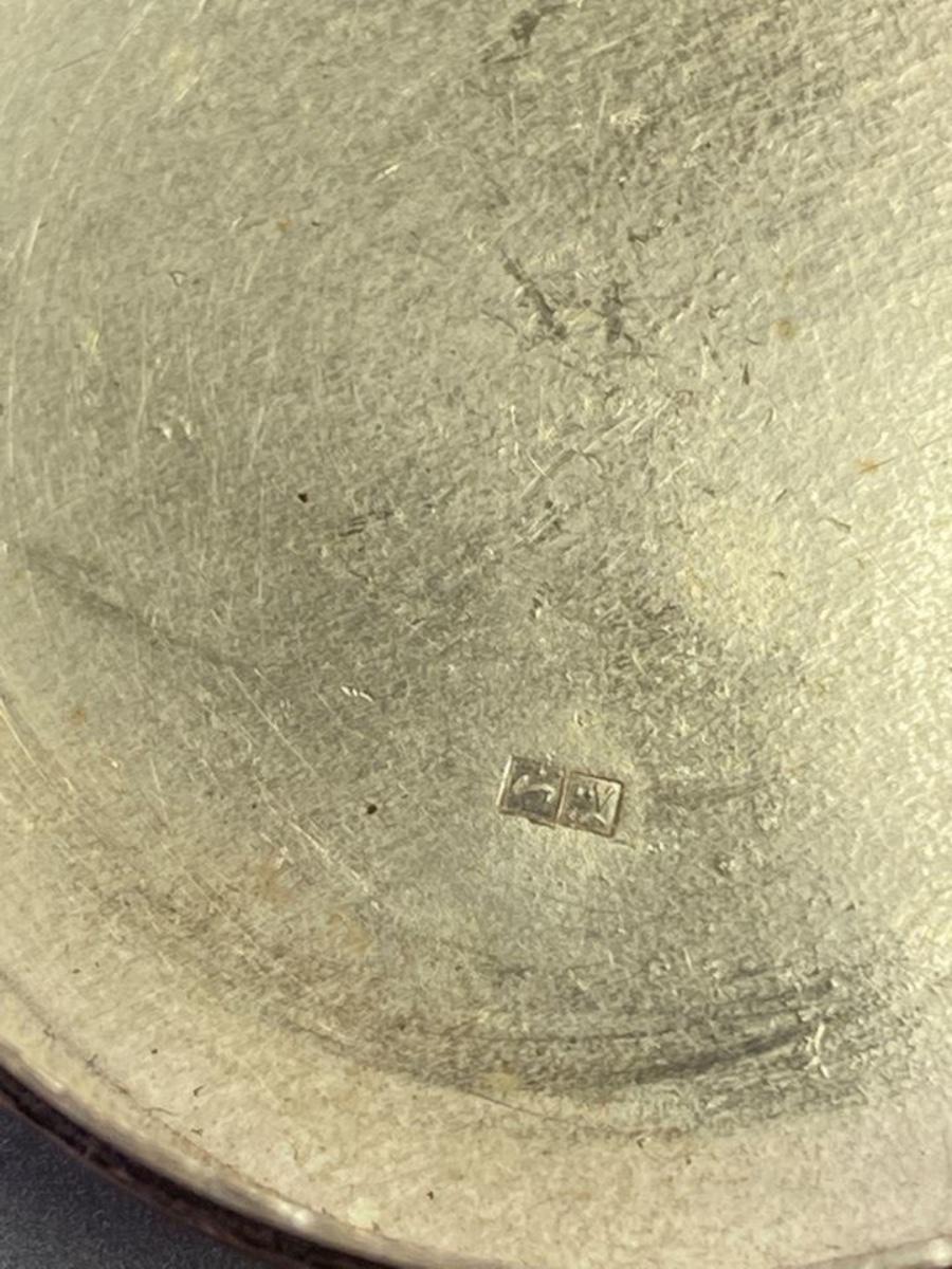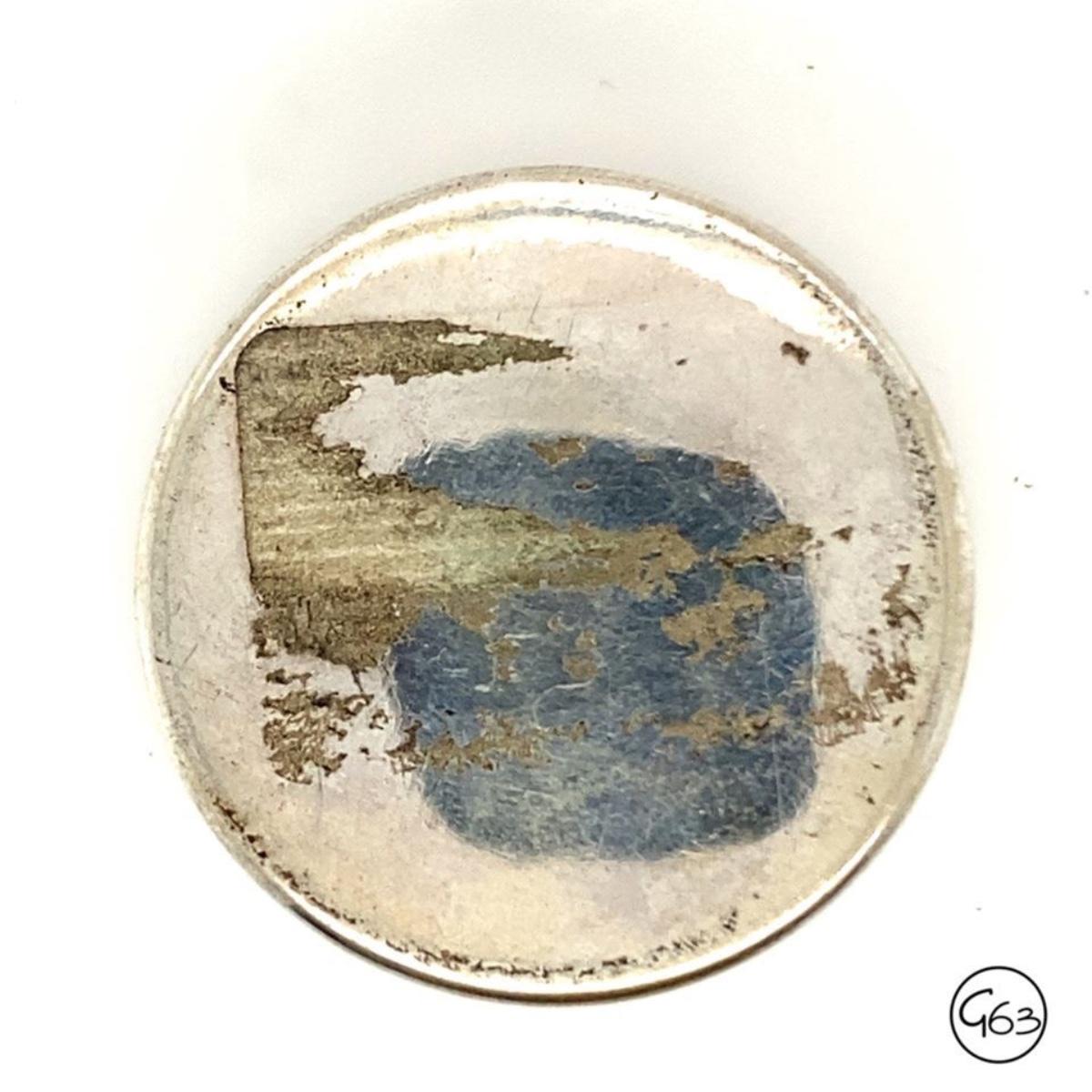 Stamped with pictorial hallmarks. Measures approx. 1.5" diameter, 5/8"H.