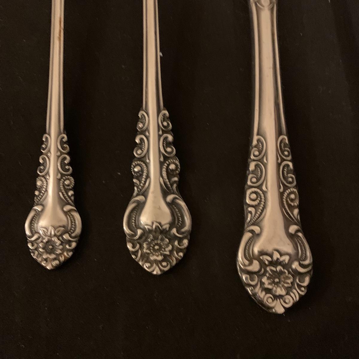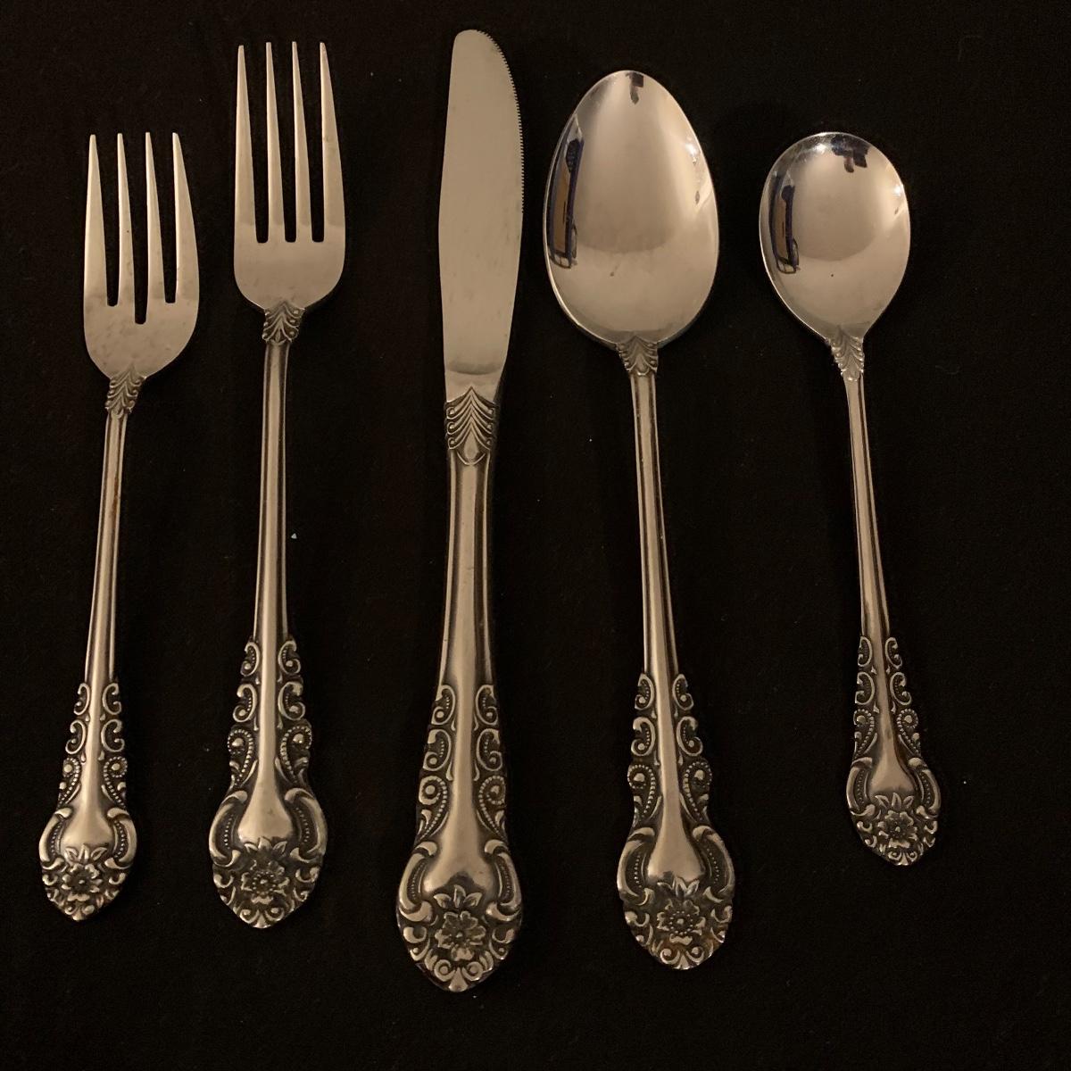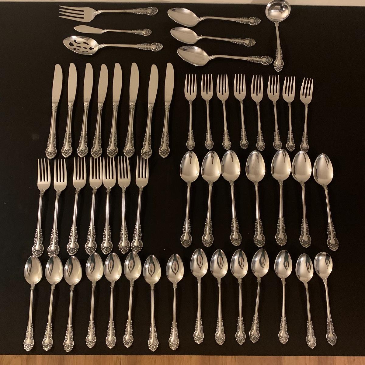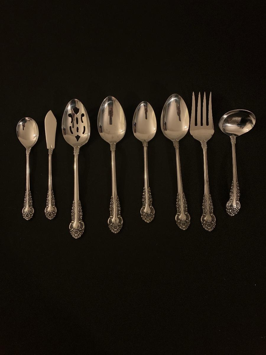 Lot contains 5 piece place settings for six with extras of small spoons and eight serving pieces. Shipping available.