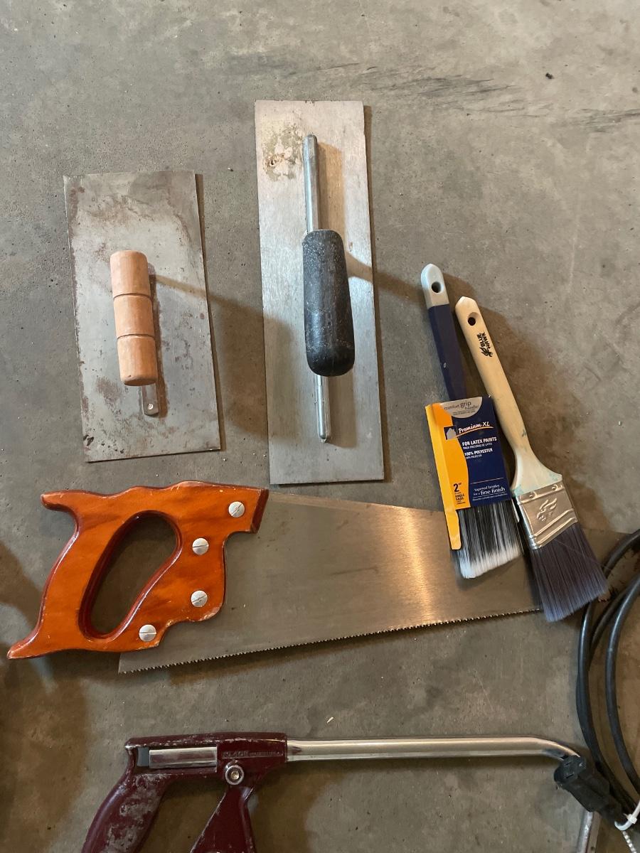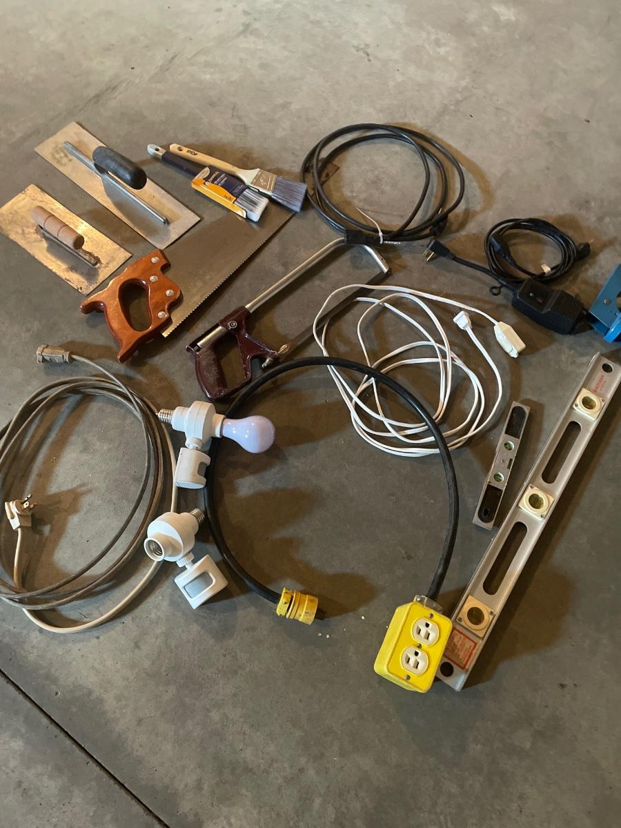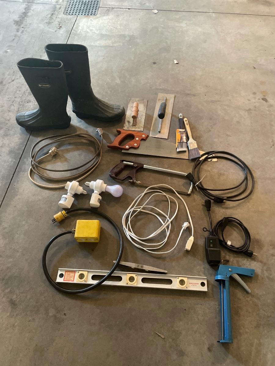Includes Columbia Ribber boots size 10 men’s., extension cords, saws, concrete finishing tools, paint brushes, levels and caulking gun.