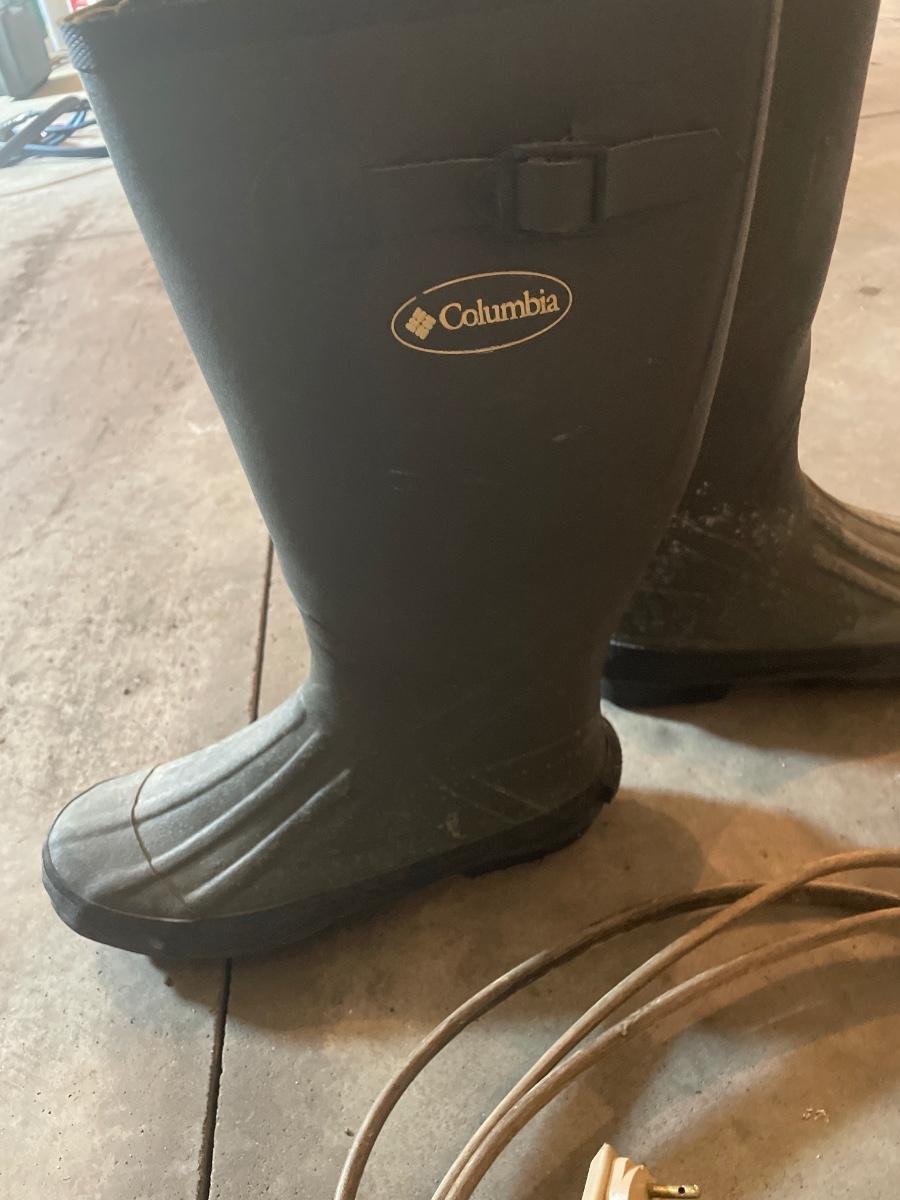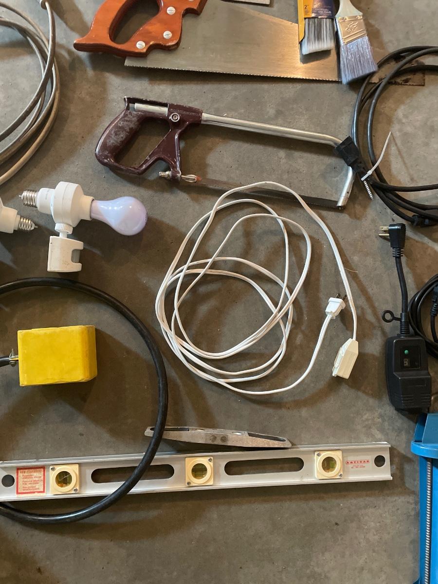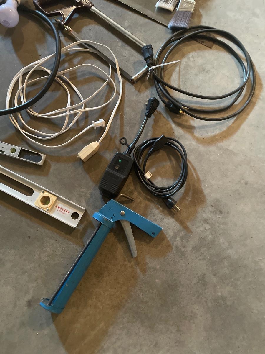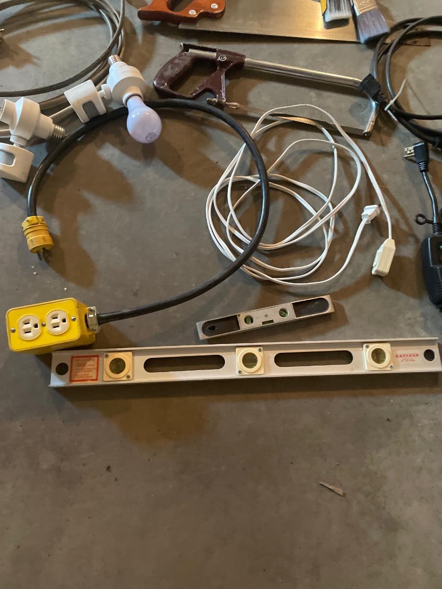 Includes Columbia Ribber boots size 10 men’s., extension cords, saws, concrete finishing tools, paint brushes, levels and caulking gun.