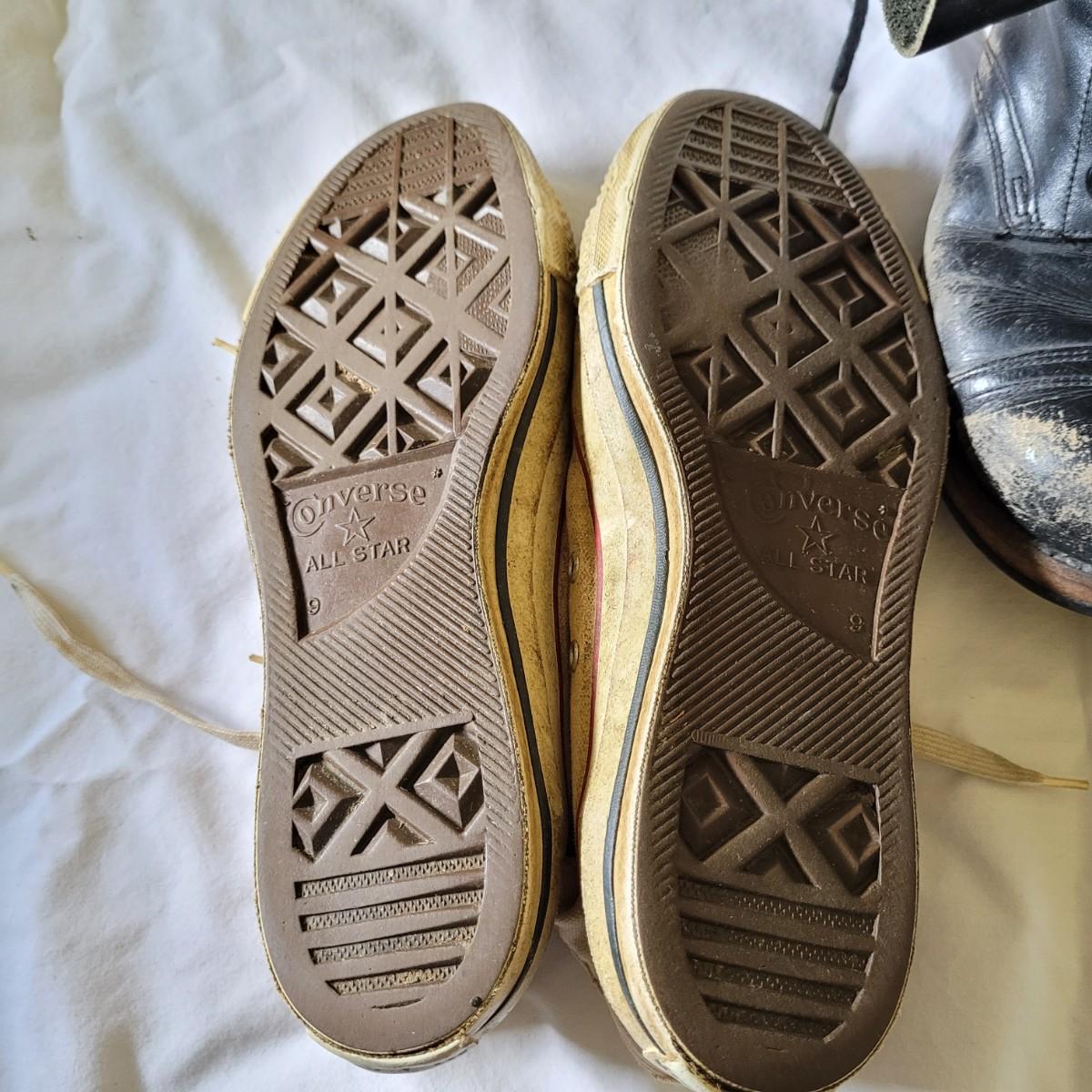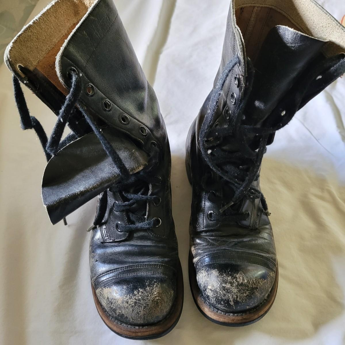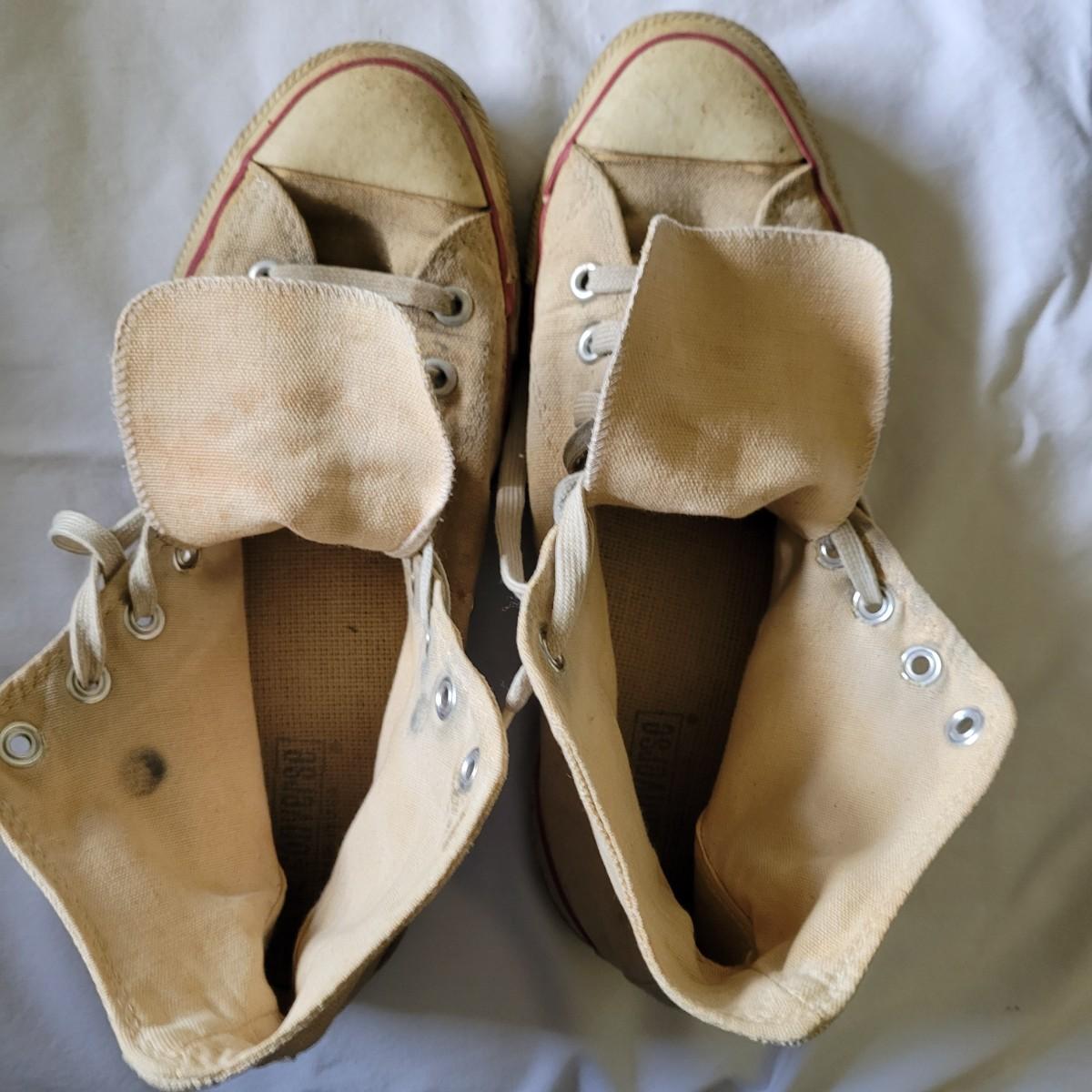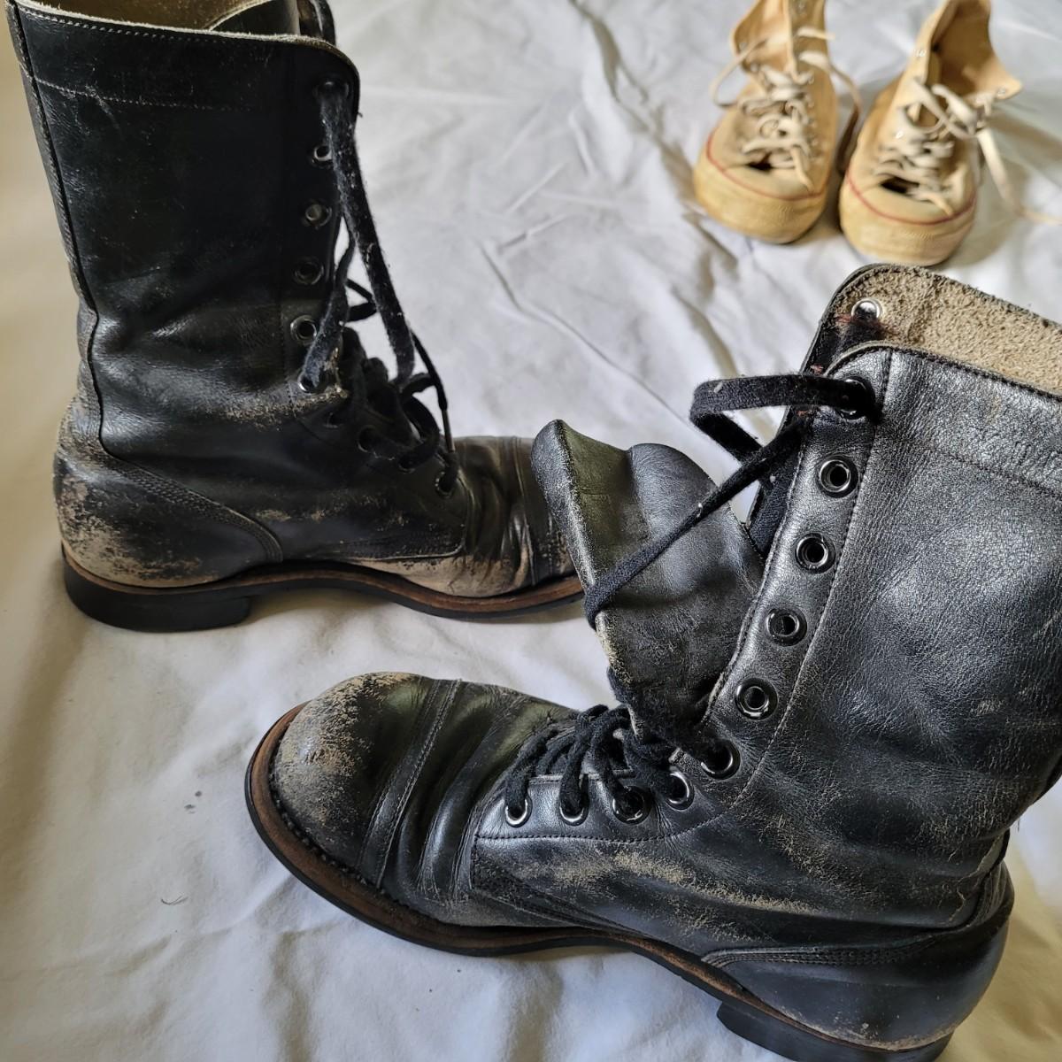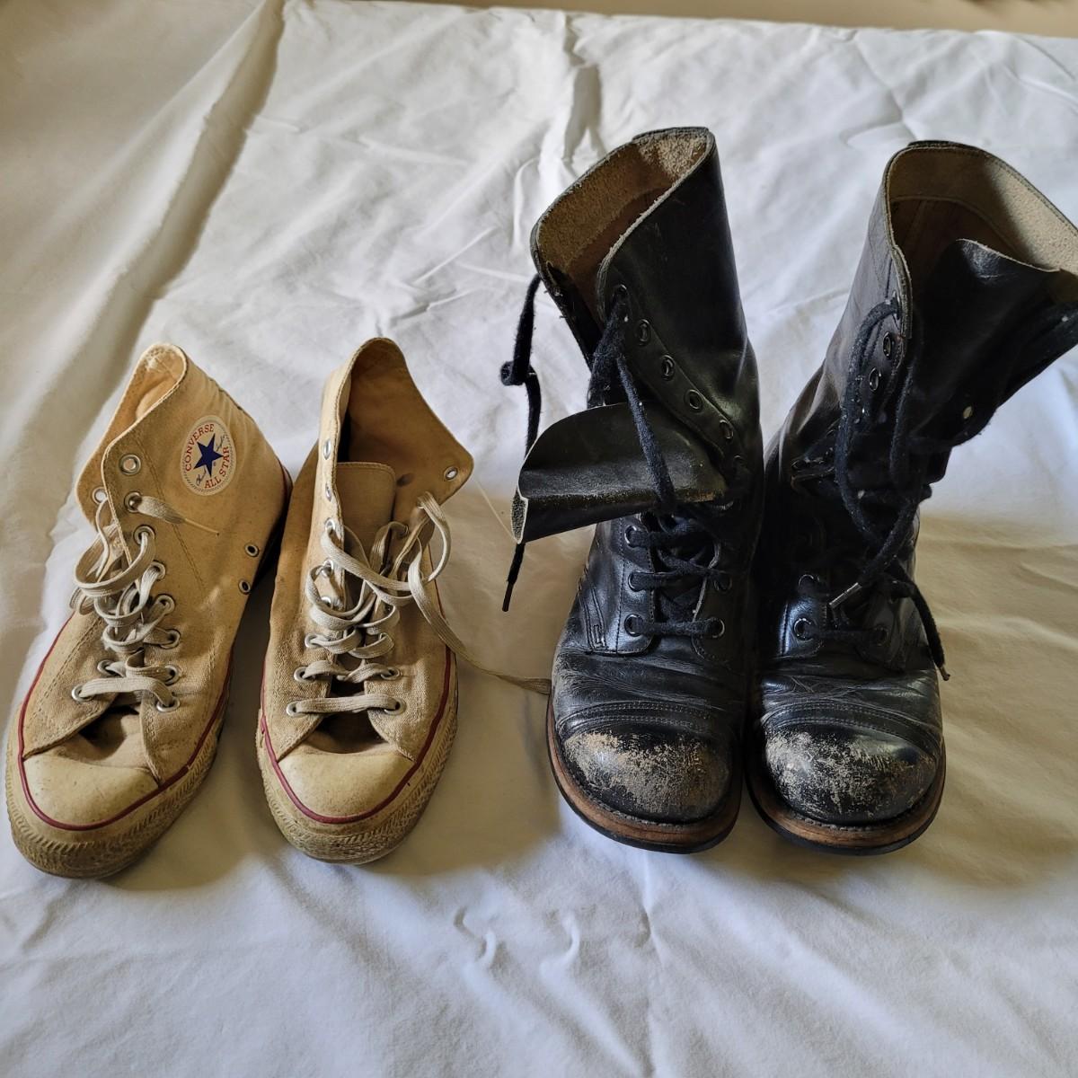 Very used pairs of cream colored classic Converse high tops (size 9) and Endicott Johnson black military boots (size 7.5W). Shipping available.