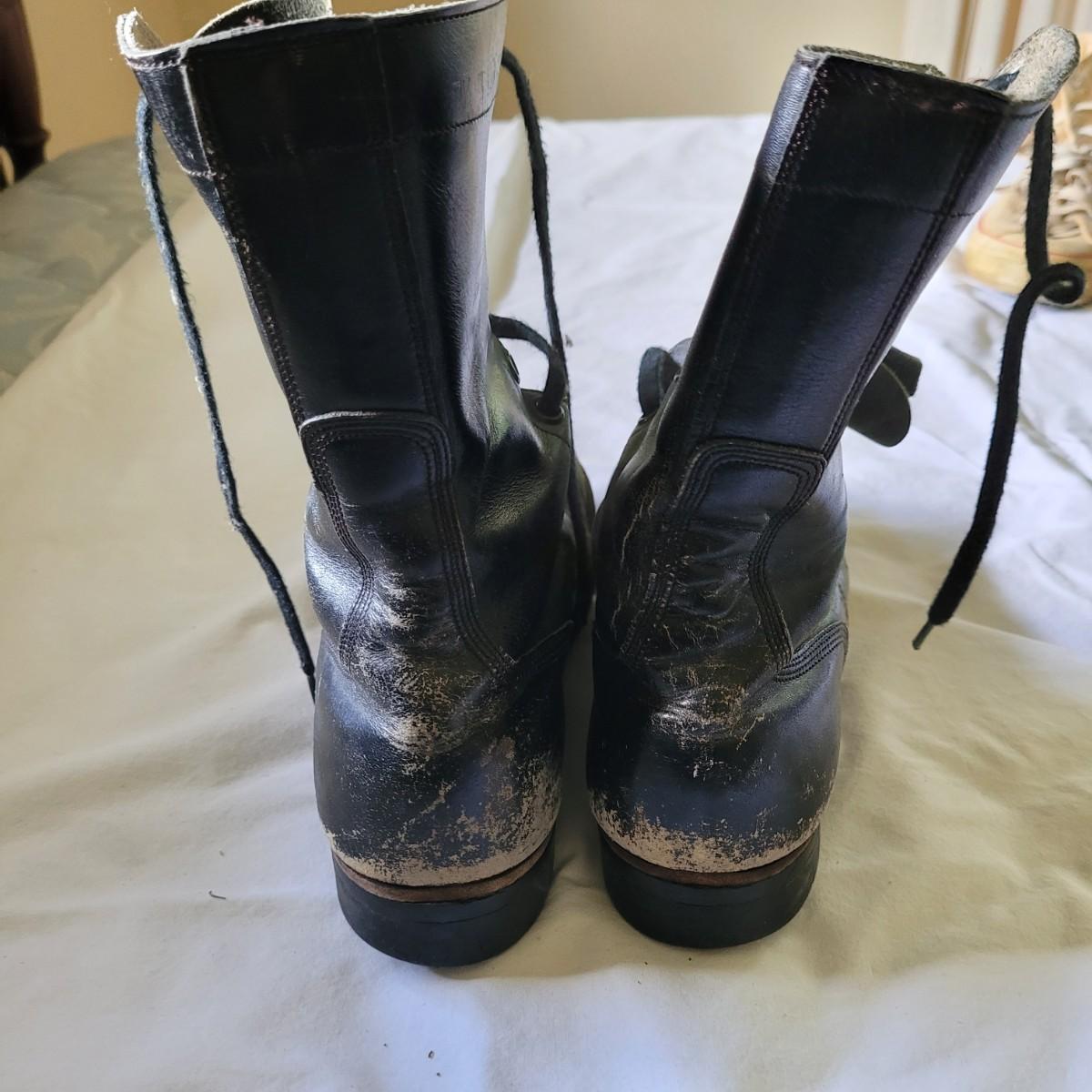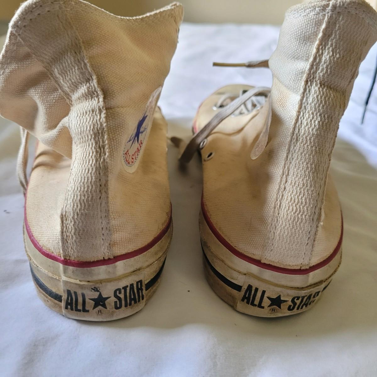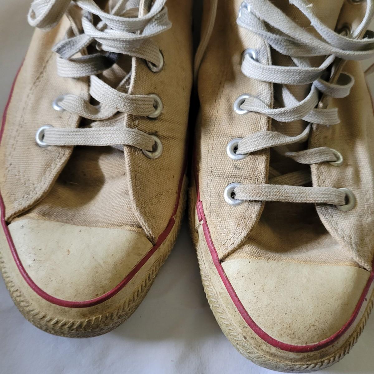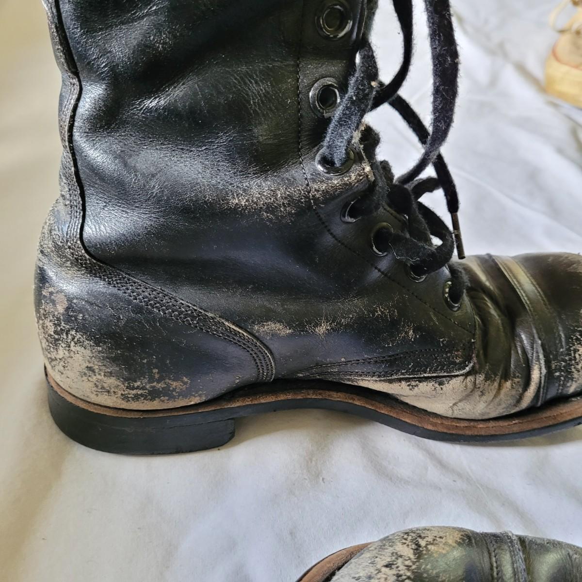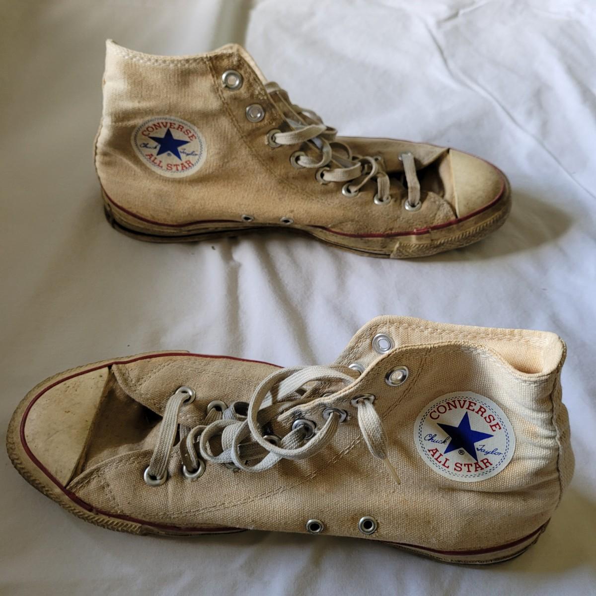 Very used pairs of cream colored classic Converse high tops (size 9) and Endicott Johnson black military boots (size 7.5W). Shipping available.