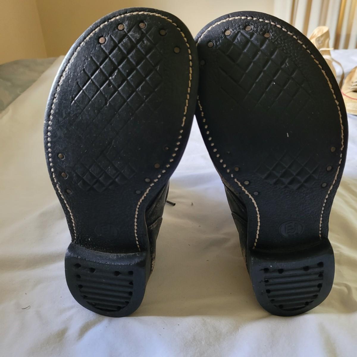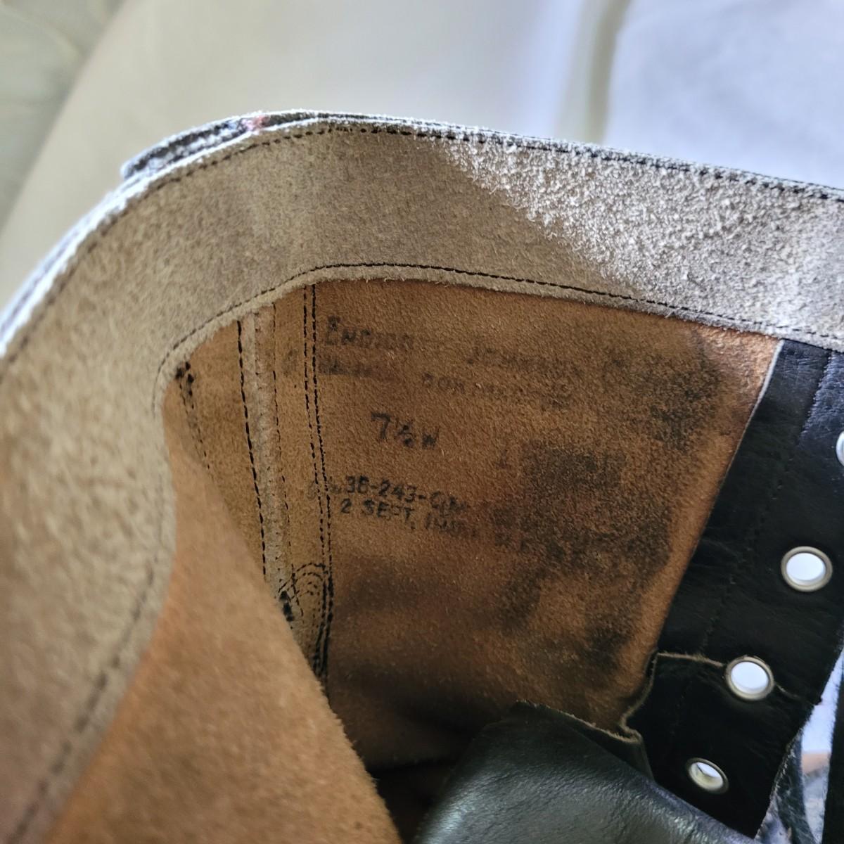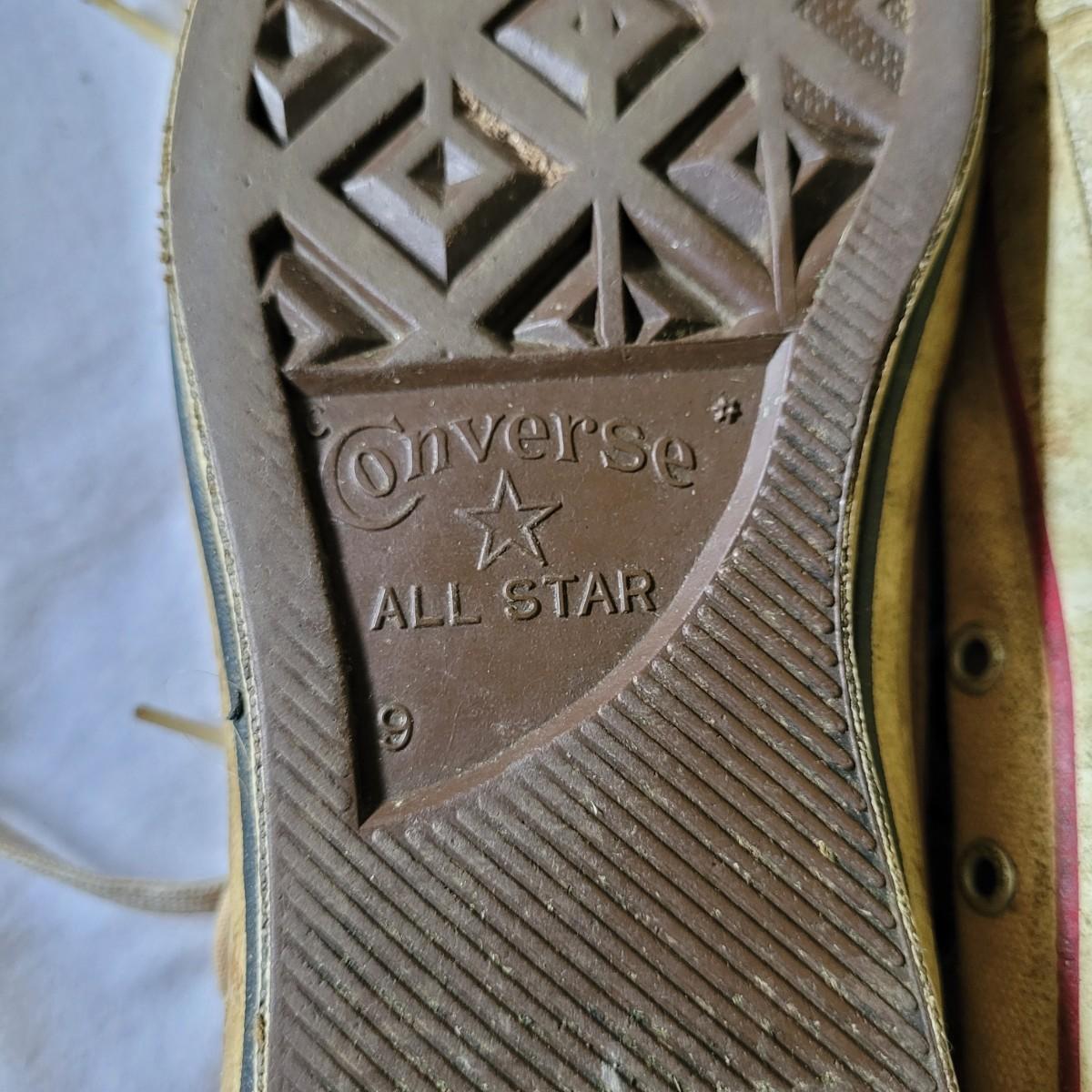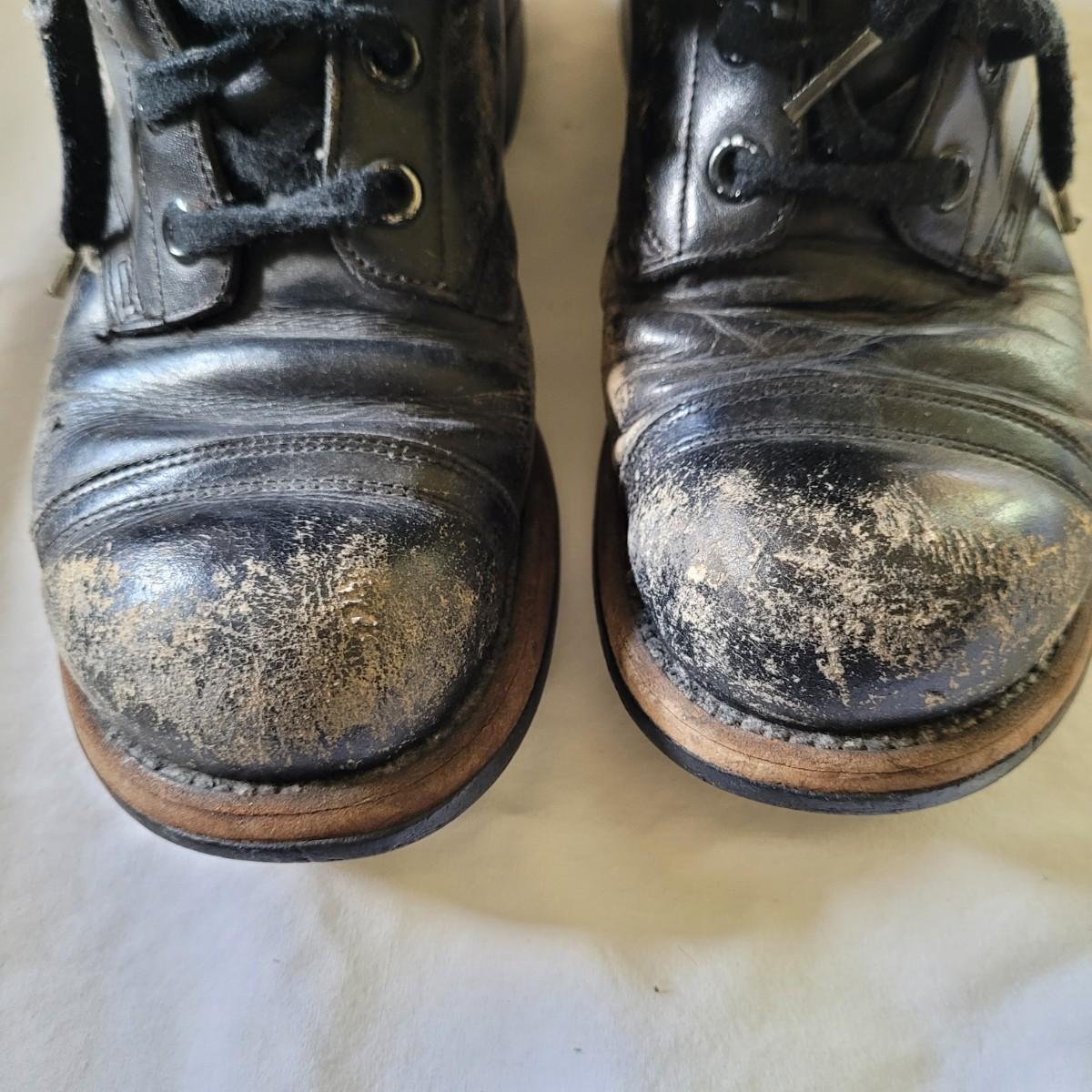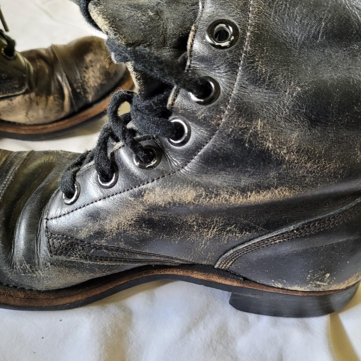 Very used pairs of cream colored classic Converse high tops (size 9) and Endicott Johnson black military boots (size 7.5W). Shipping available.