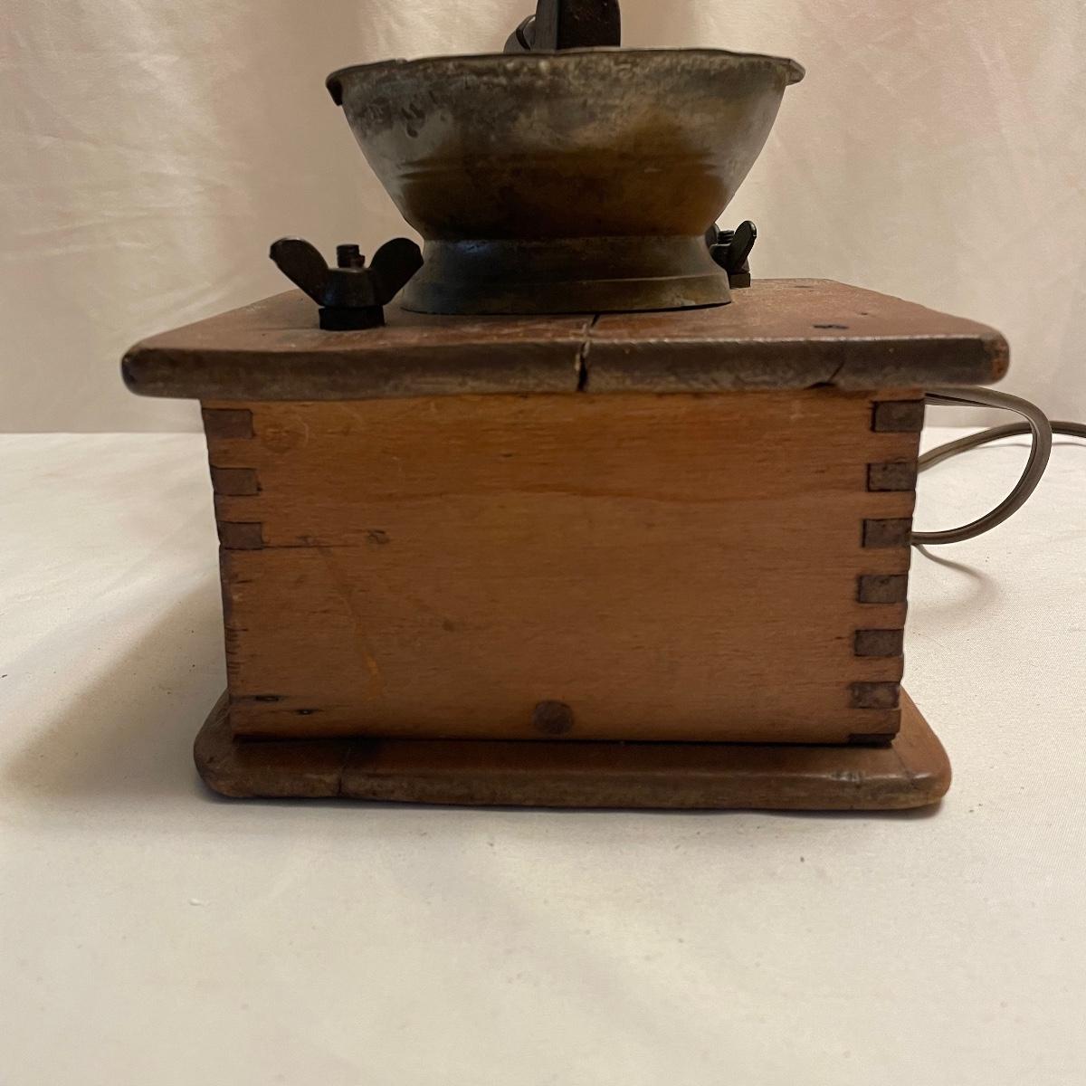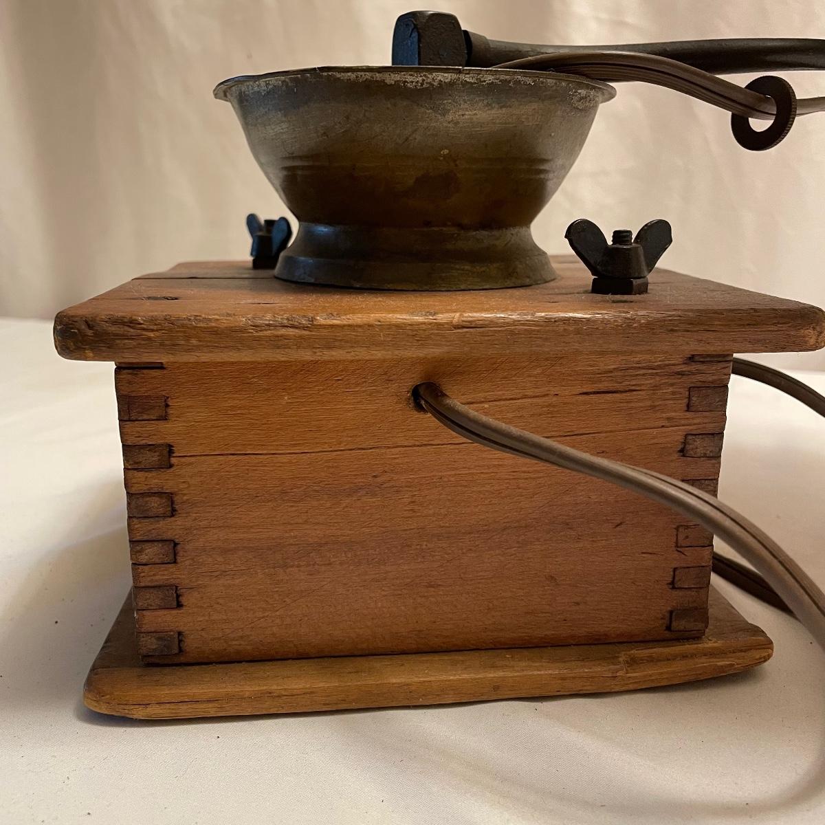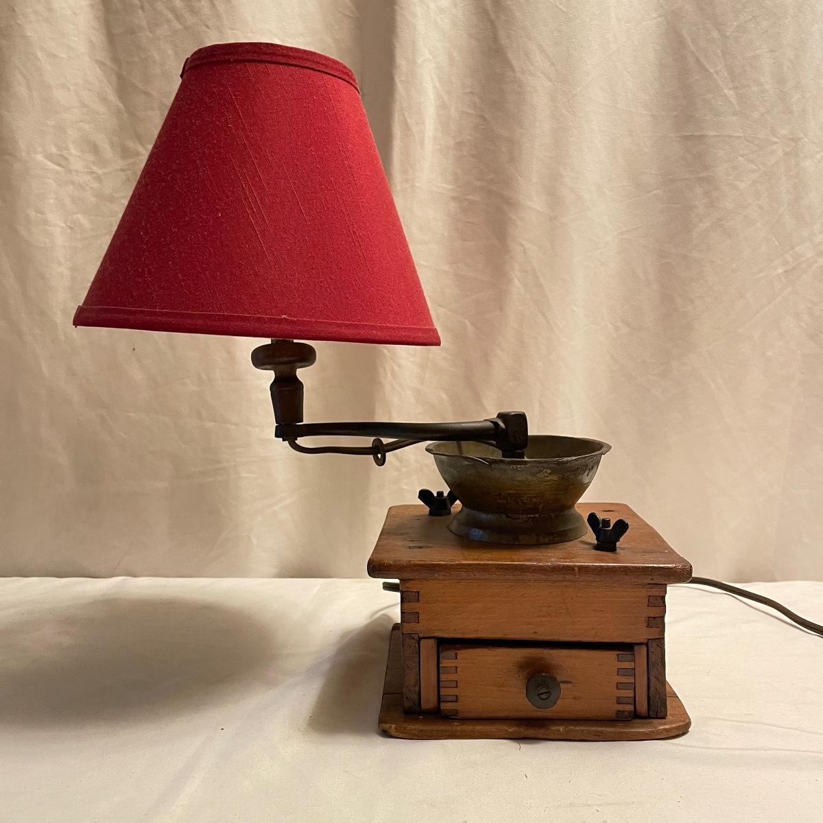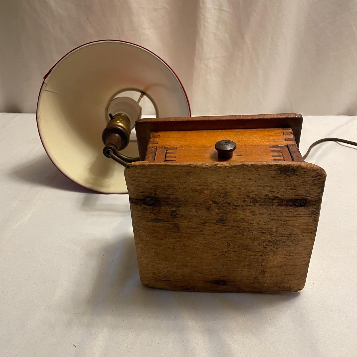 This antique coffee grinder with dovetailed drawer has been cleverly converted into a lamp. A combination of wood and metal. Comes with a dark red lamp shade.