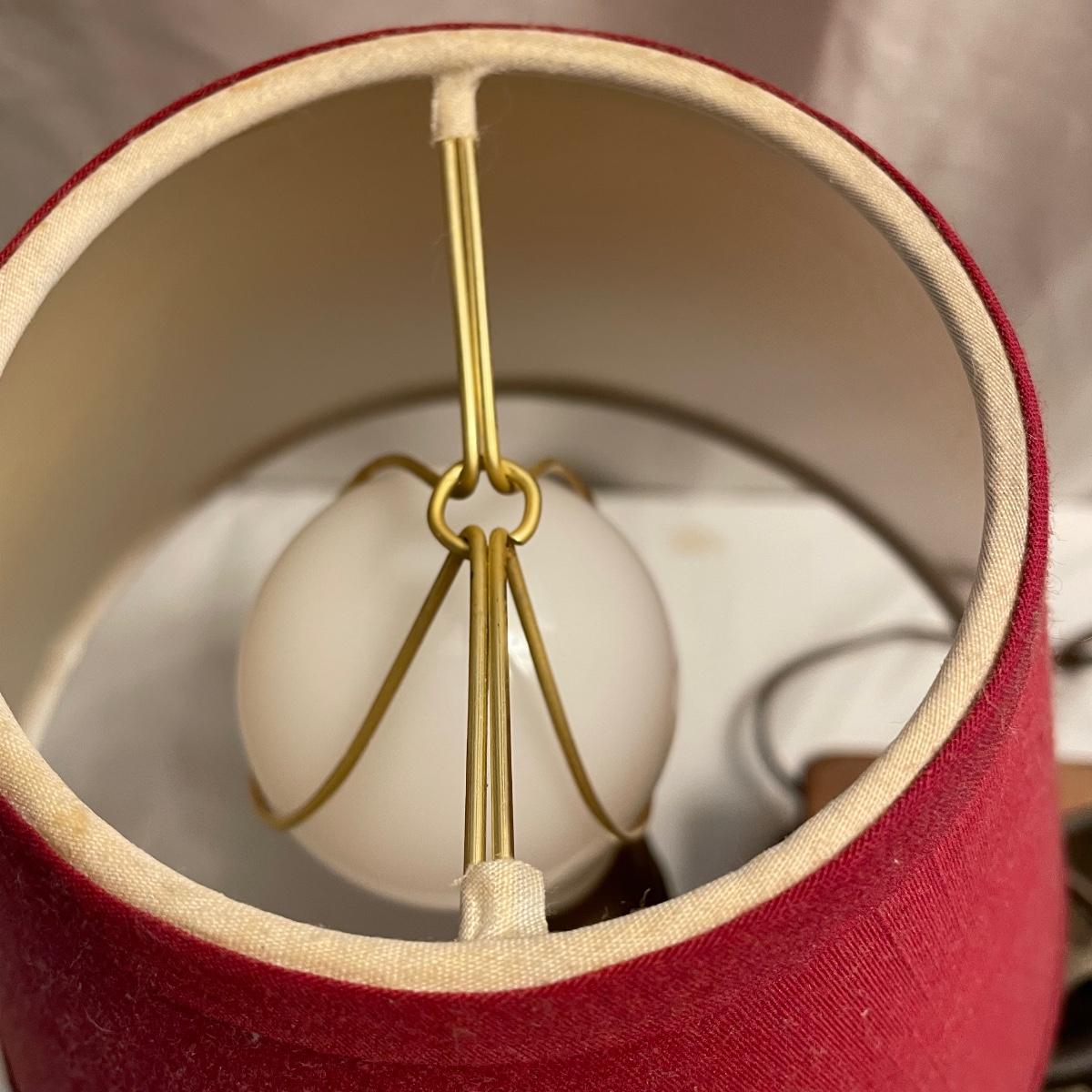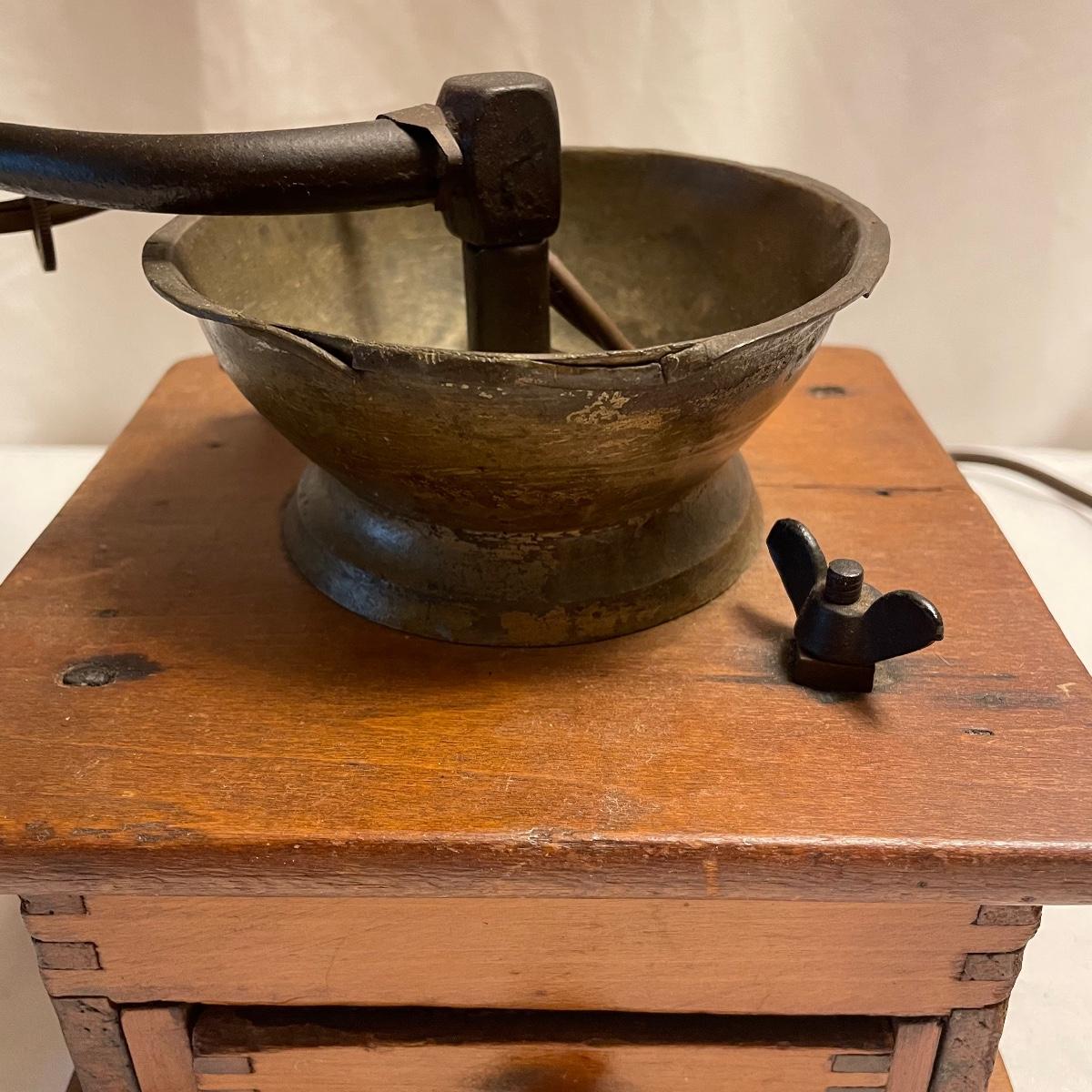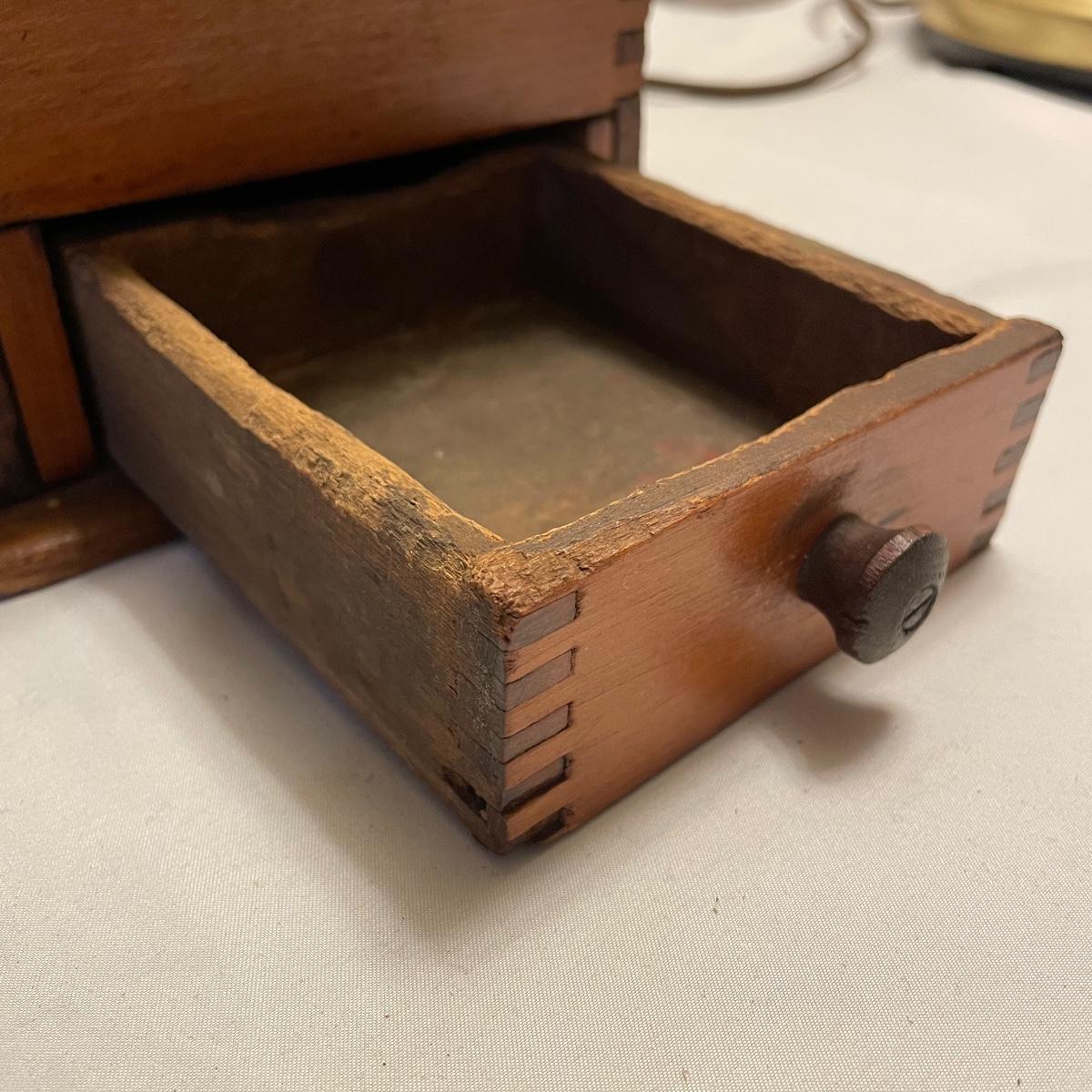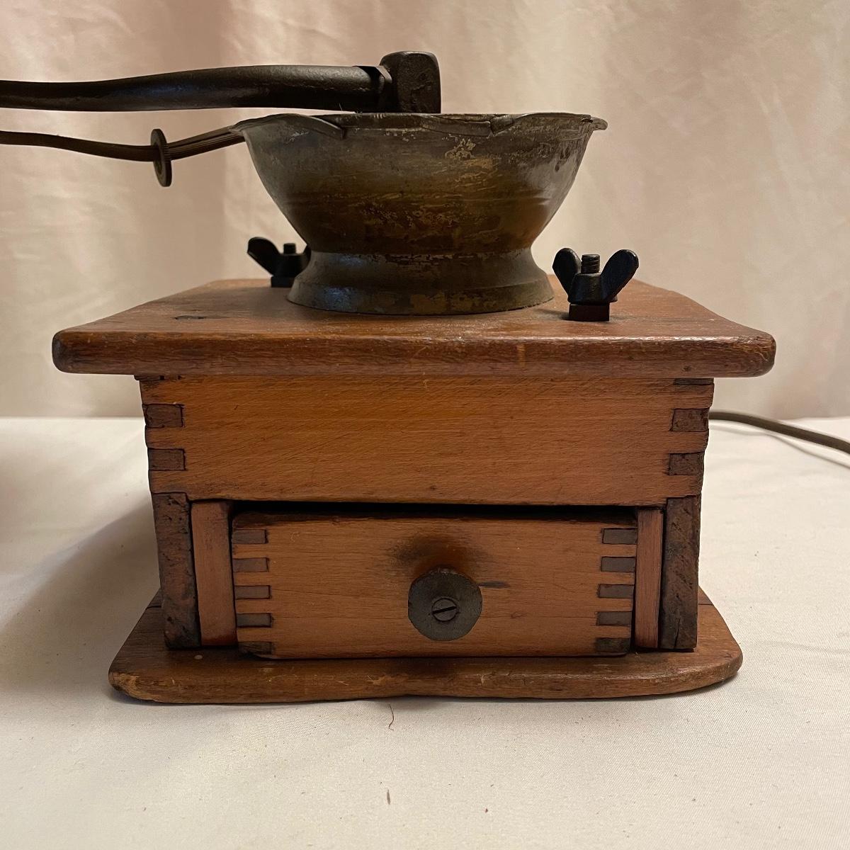 This antique coffee grinder with dovetailed drawer has been cleverly converted into a lamp. A combination of wood and metal. Comes with a dark red lamp shade.