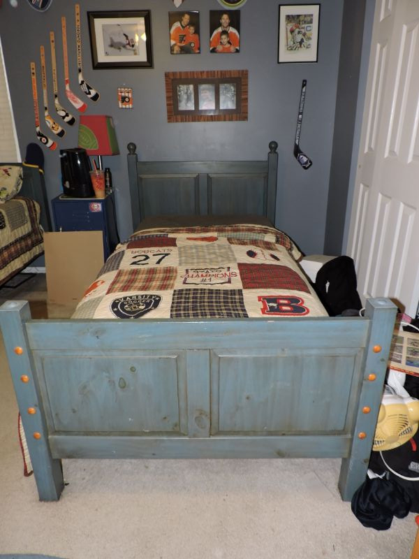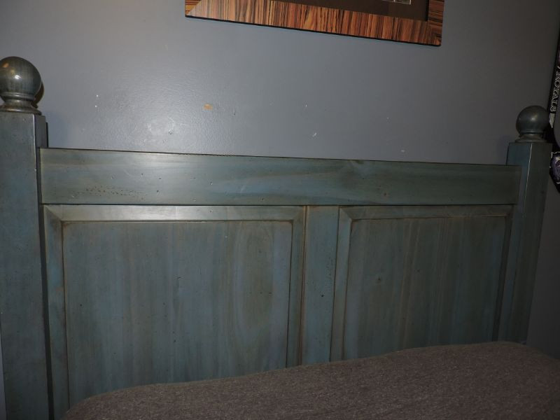 Set of two convertible bunk beds painted a distressed blue. Bedding and mattresses not included. Beds can be used as singles or stacked and secured for bunk beds. Sturdy oak. Headboard is 42”x42” footboard is 42”x28.5”.