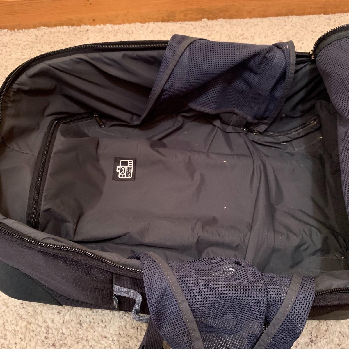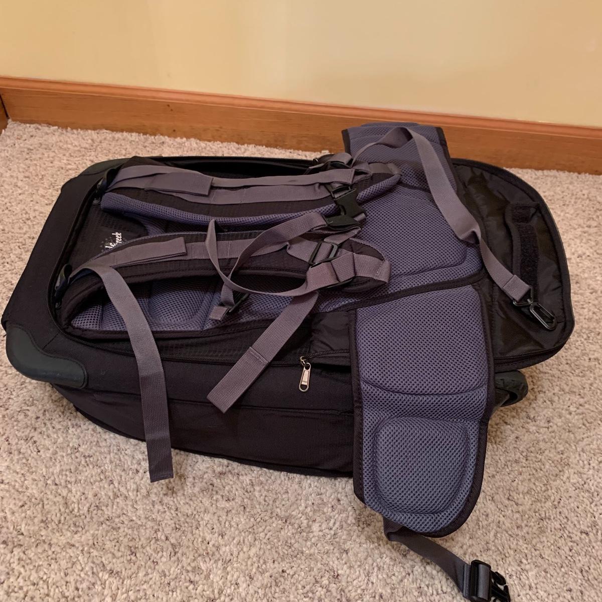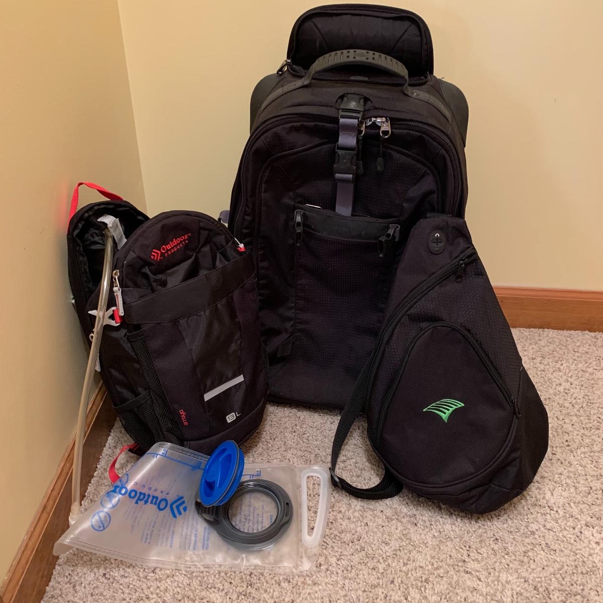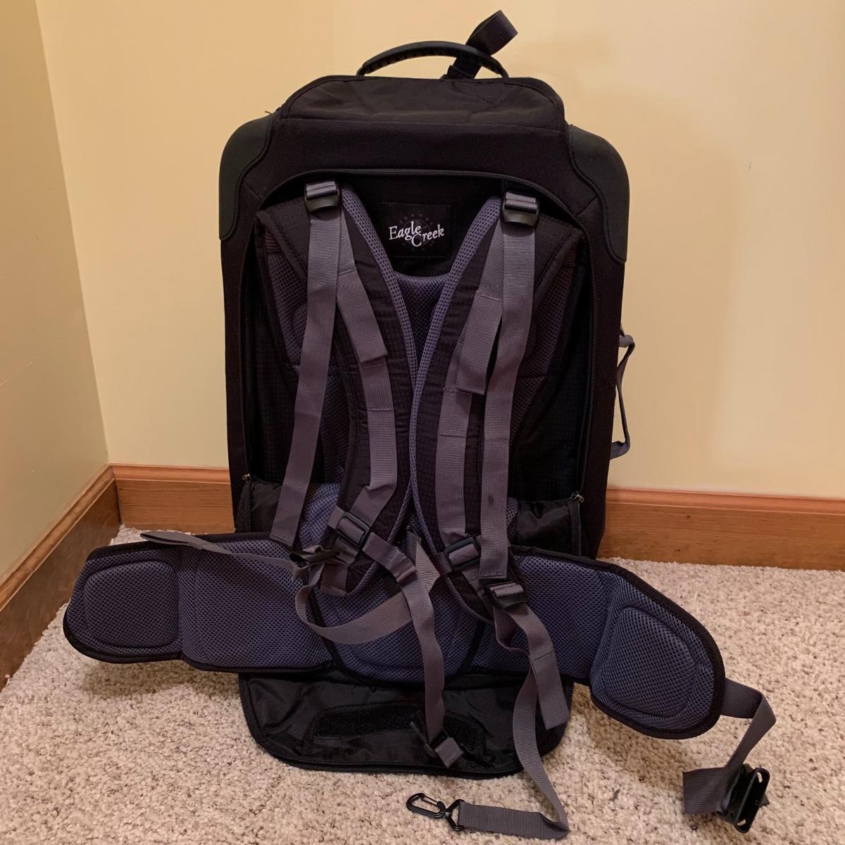This Eagle Creek carry-on sized suitcase can convert from a wheeled rolling bag with a retractable handle into a backpack complete with two shoulder straps and a hip belt. It is used and some scuffs are seen on the bottom and on the wheels. Functionally it is in good condition. Also included is a 13L Outdoor Products Arroyo backpack with a Last Drop system plastic water bladder. It is used, but in good condition. Some water is still in the tube, but it is washable. There is also a single strap sling crossbody C Port and Company bag. It has two pockets and a slot for headphones. Local pickup only.