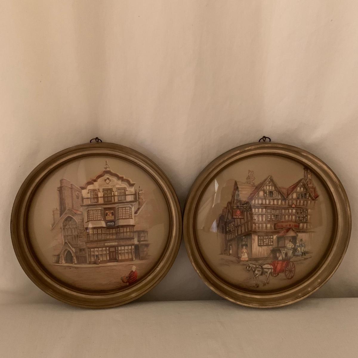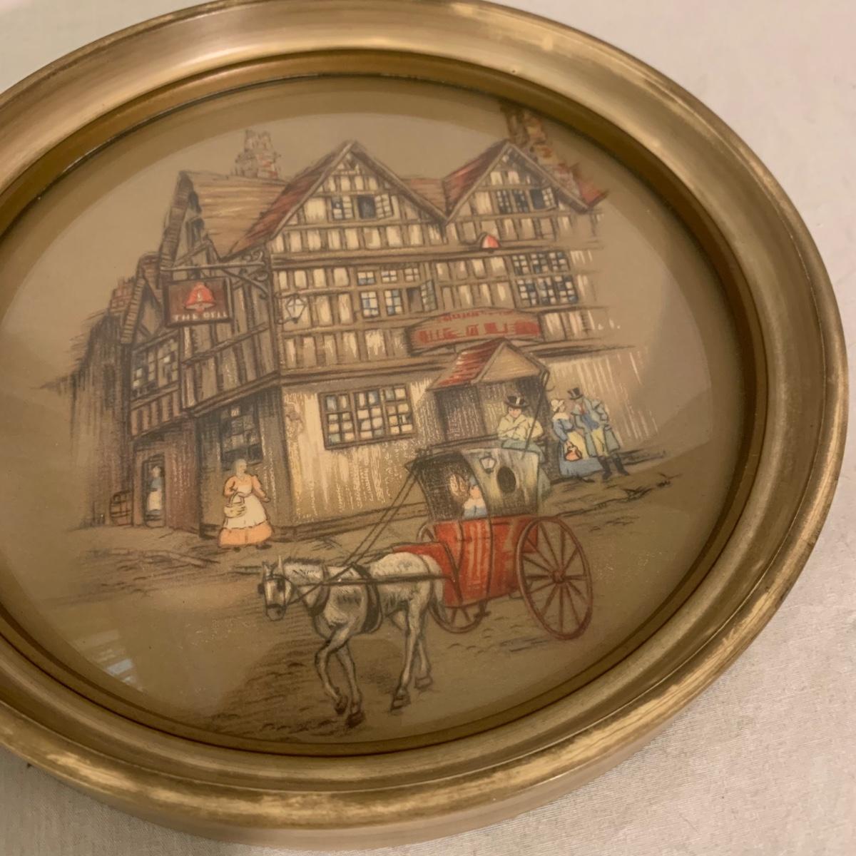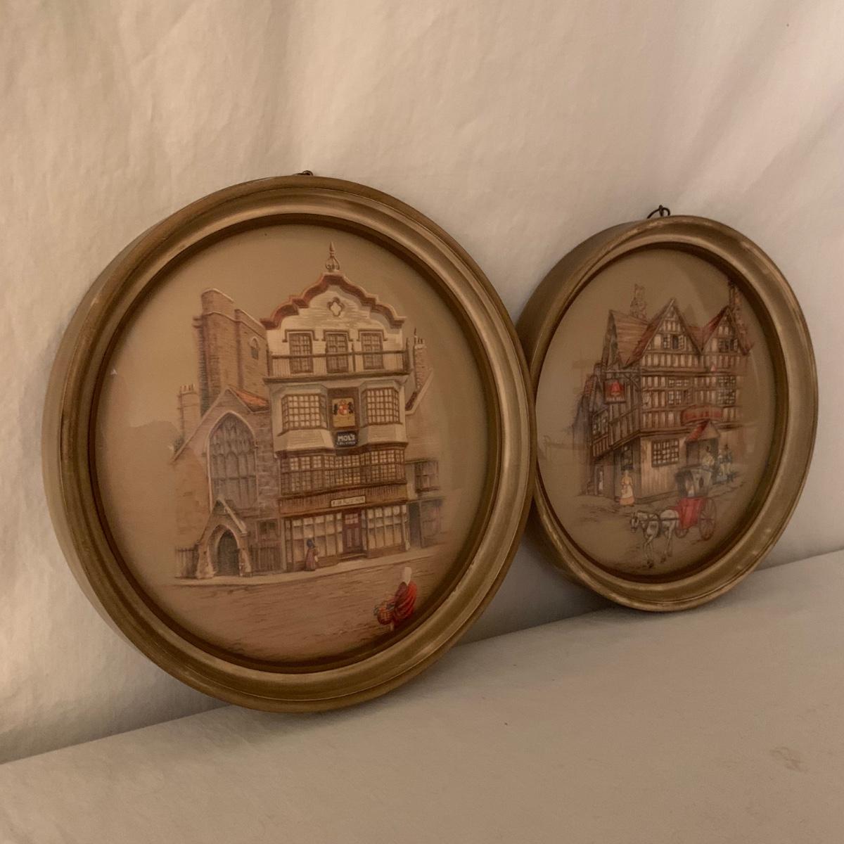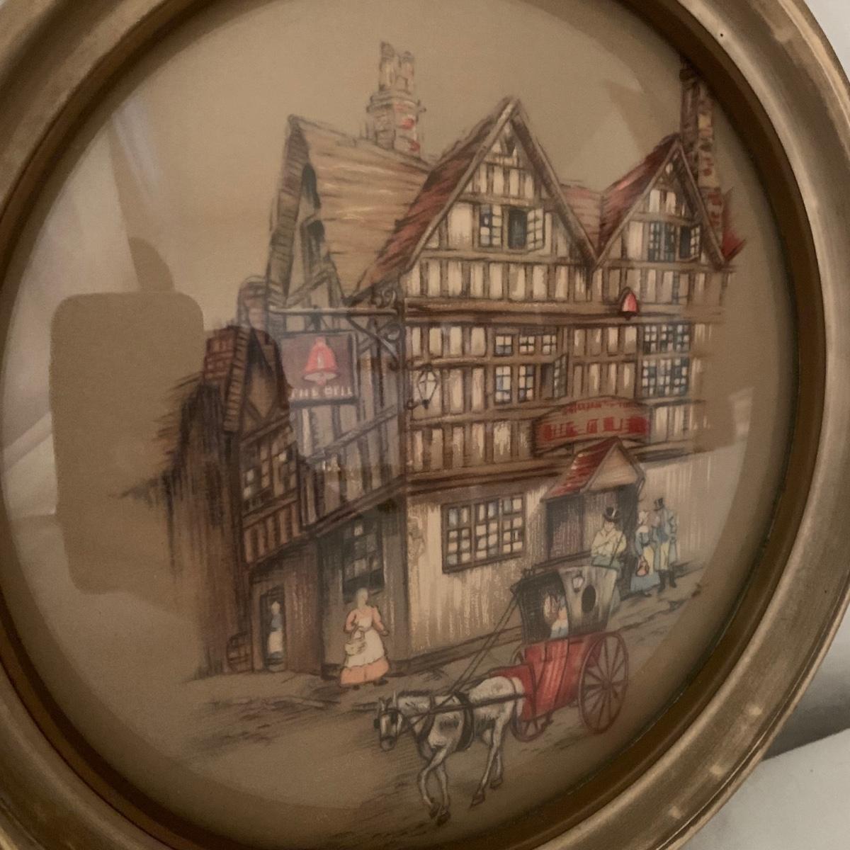 Two framed art prints from Peter Watson Studio featuring old fashioned city scenes. The prints are in 9”D frames and are behind a layer of convex bubble glass. The frames are likely painted wood. They are in good condition. The paint has a bit of a distressed look on the edge of one of them. Each frame has a hook on top to hang. They both have a small crack where the hook is. Shipping available.