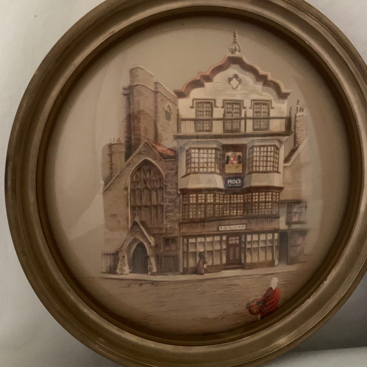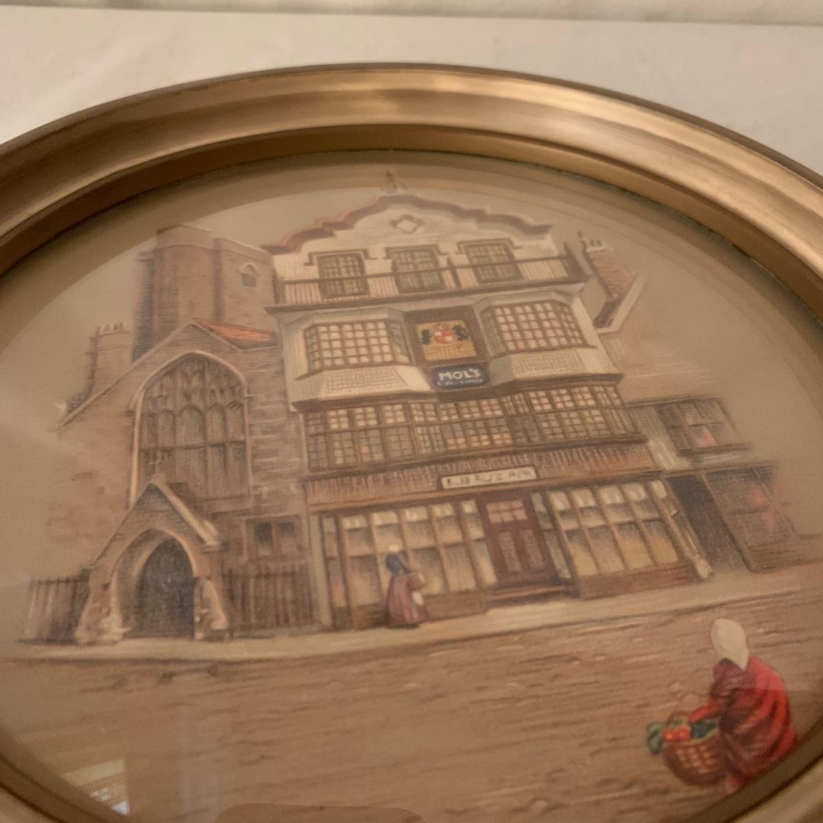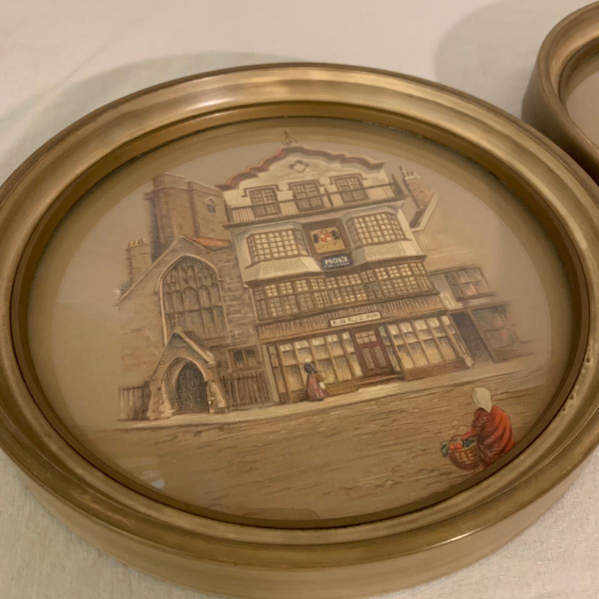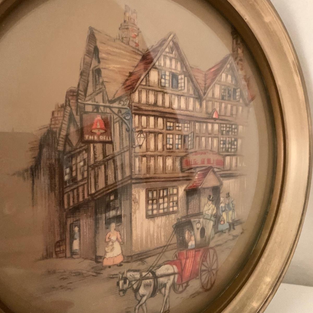 Two framed art prints from Peter Watson Studio featuring old fashioned city scenes. The prints are in 9”D frames and are behind a layer of convex bubble glass. The frames are likely painted wood. They are in good condition. The paint has a bit of a distressed look on the edge of one of them. Each frame has a hook on top to hang. They both have a small crack where the hook is. Shipping available.
