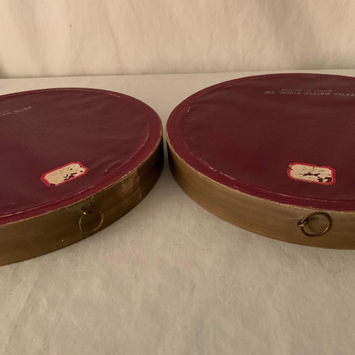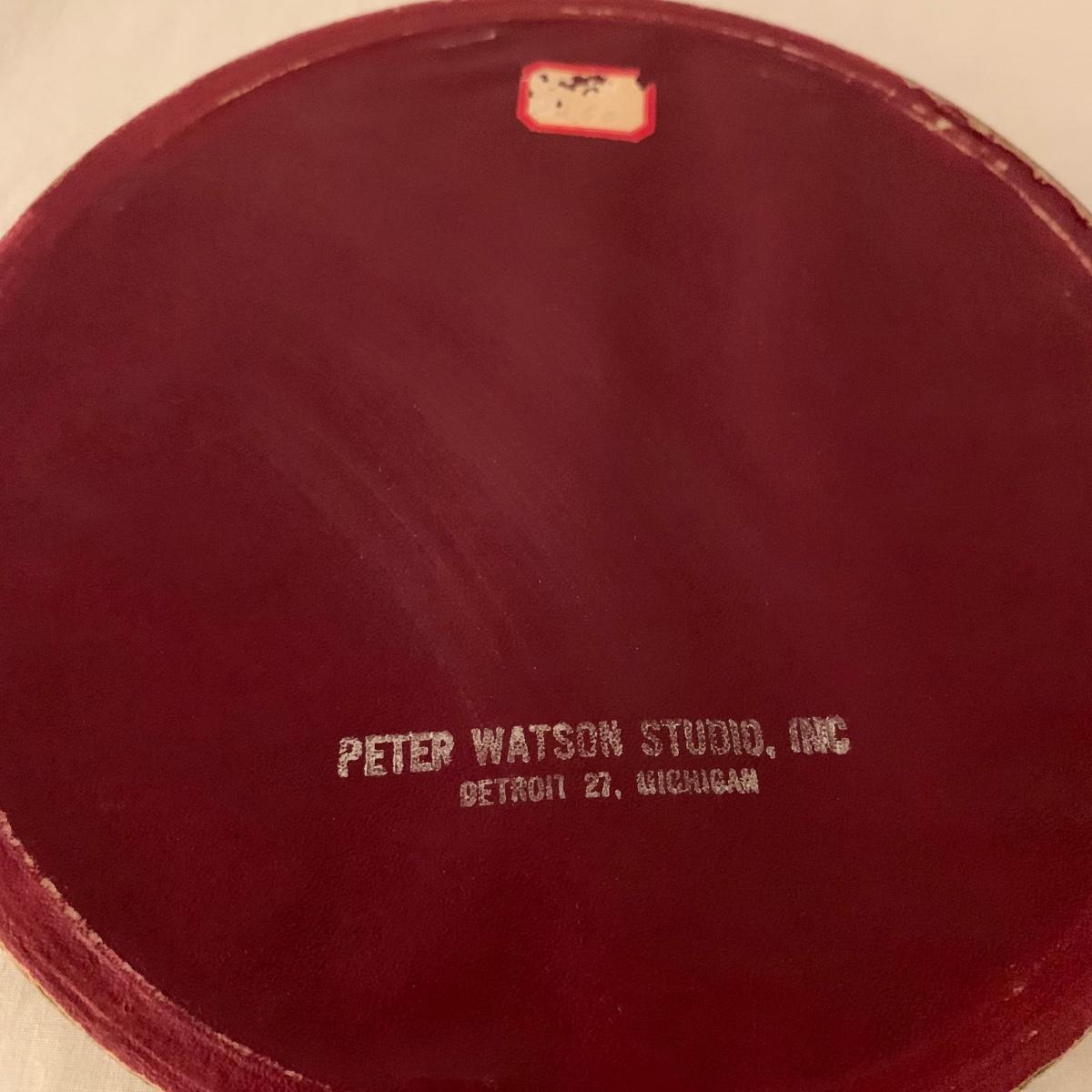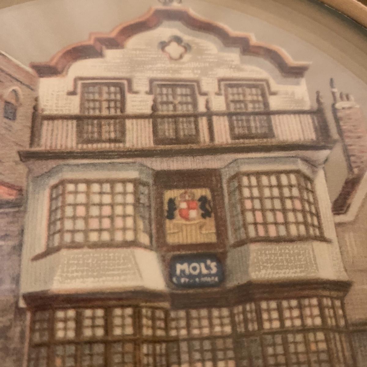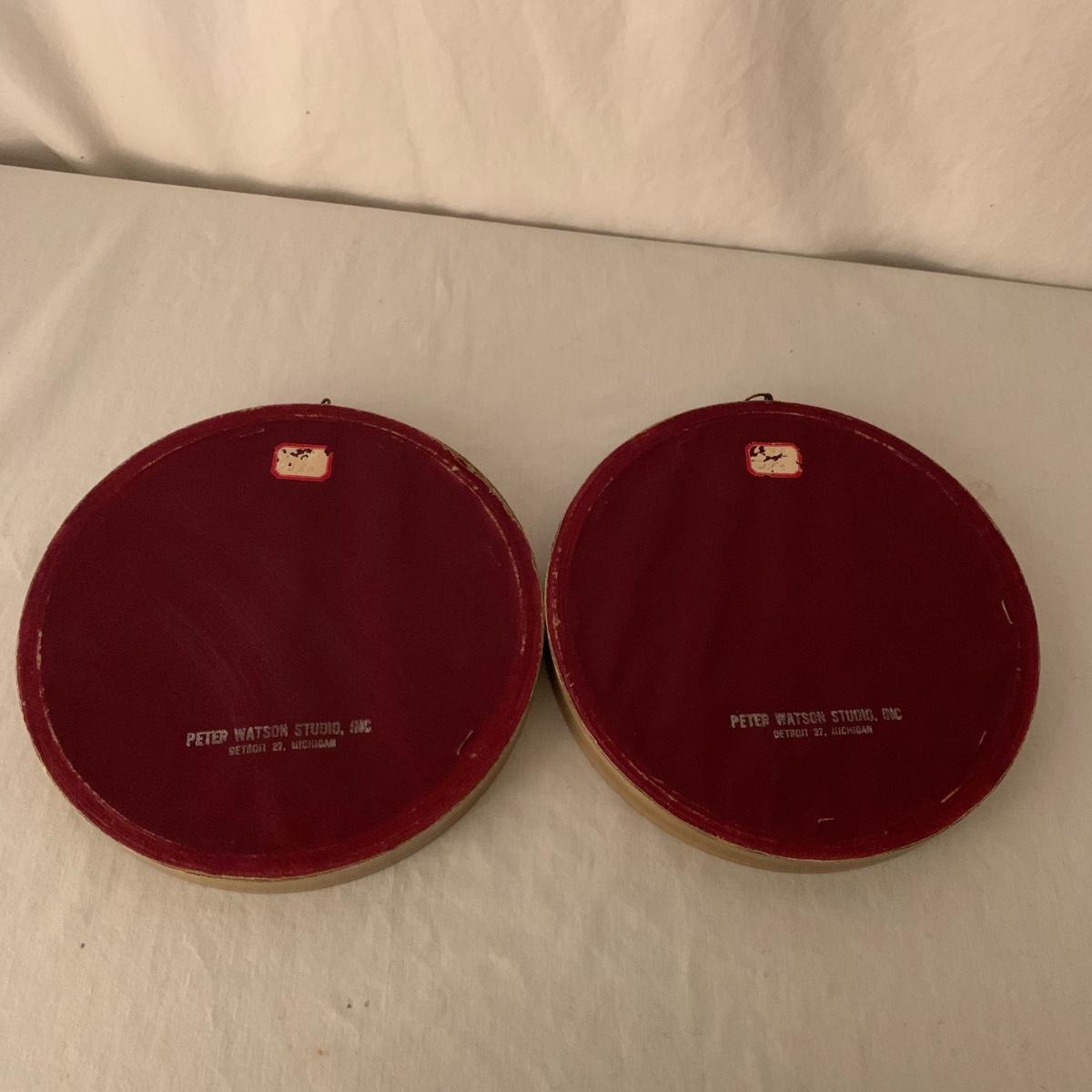 Two framed art prints from Peter Watson Studio featuring old fashioned city scenes. The prints are in 9”D frames and are behind a layer of convex bubble glass. The frames are likely painted wood. They are in good condition. The paint has a bit of a distressed look on the edge of one of them. Each frame has a hook on top to hang. They both have a small crack where the hook is. Shipping available.