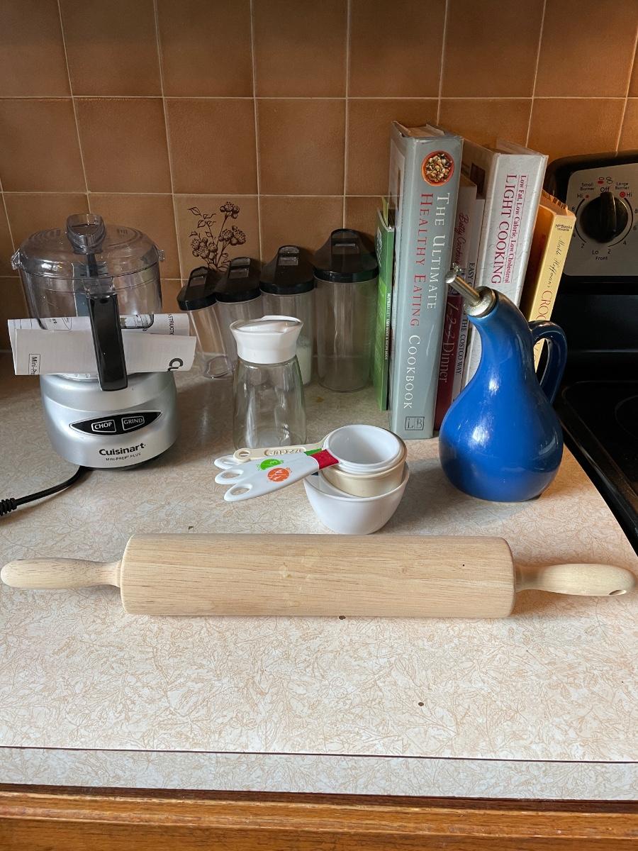 COOK BOOKS, MEASURING CUPS, ROLLING PIN, AND MUCH MORE