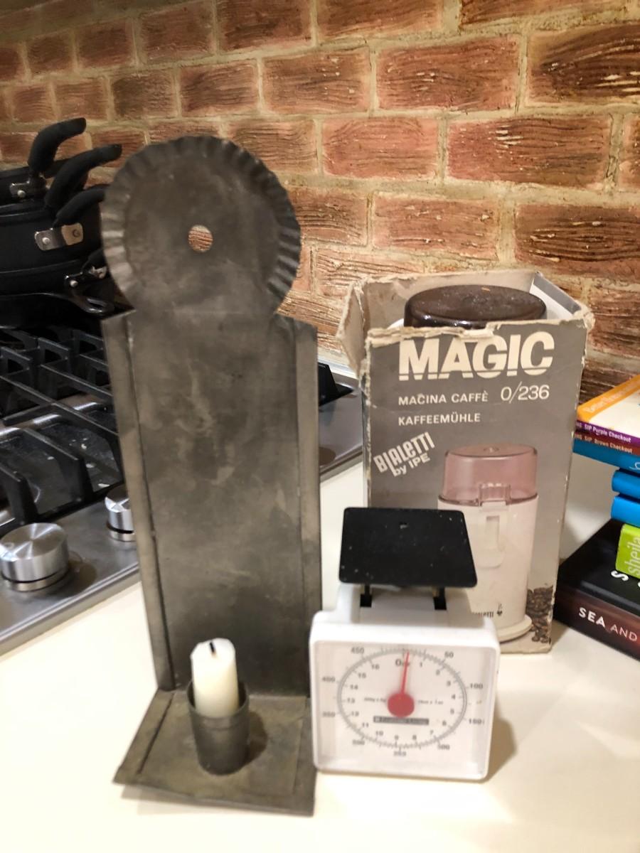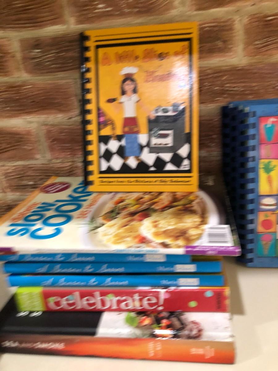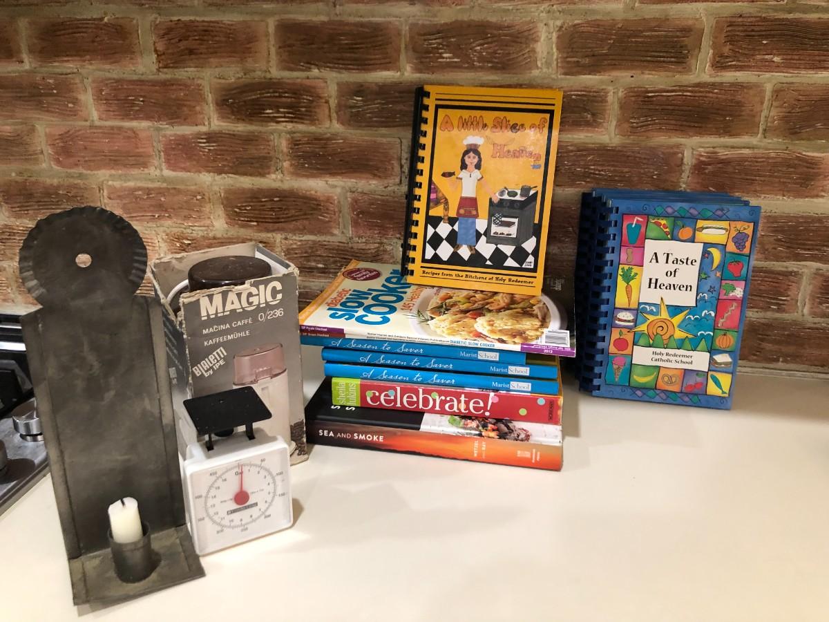 Assortment of cookbooks includes 3 copies of "A Season to Savor" and 3 copies of "A Taste of Heaven" which would make great gifts! Also includes "Sea and Smoke" cookbook, BH&G diatetic Slow Cooker cookbook, Magic coffee Grinder, kitchen scale, and tin candle holder