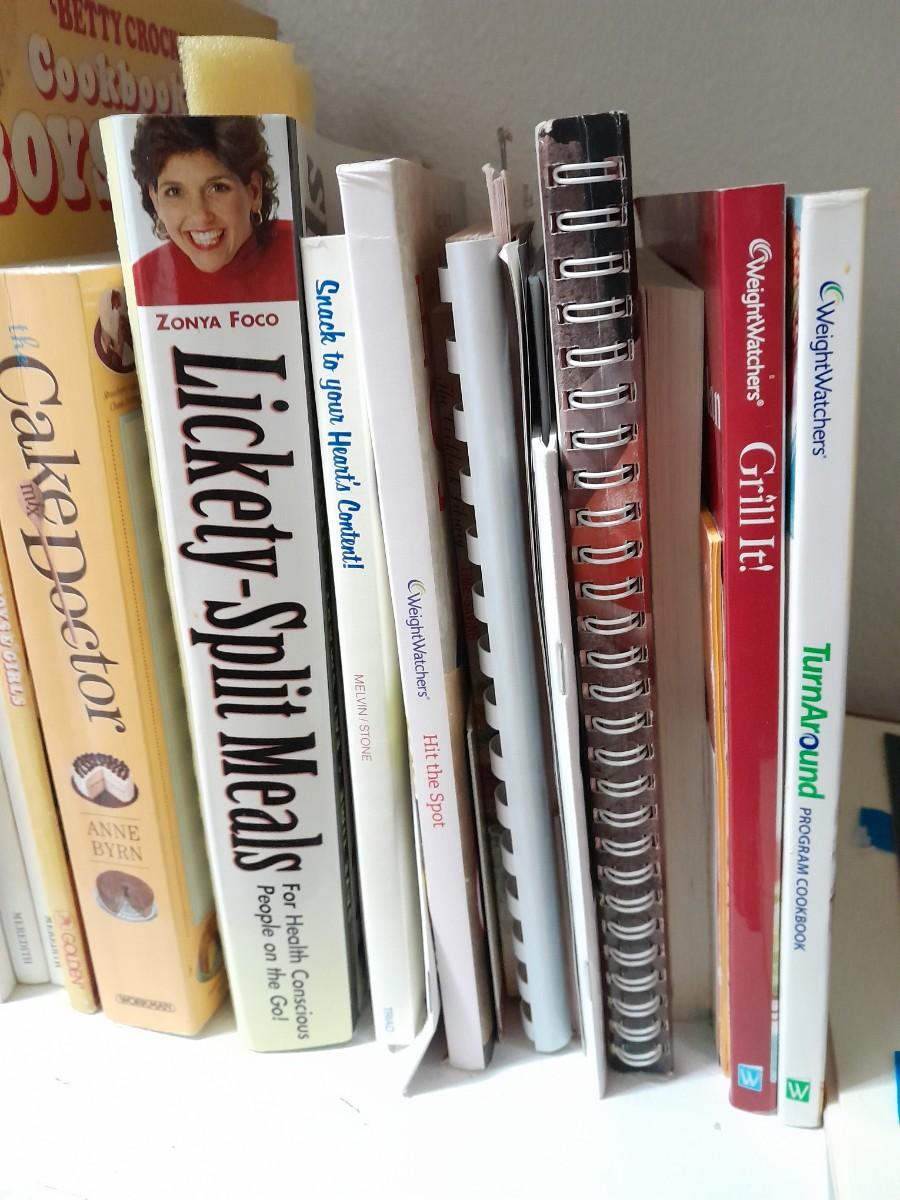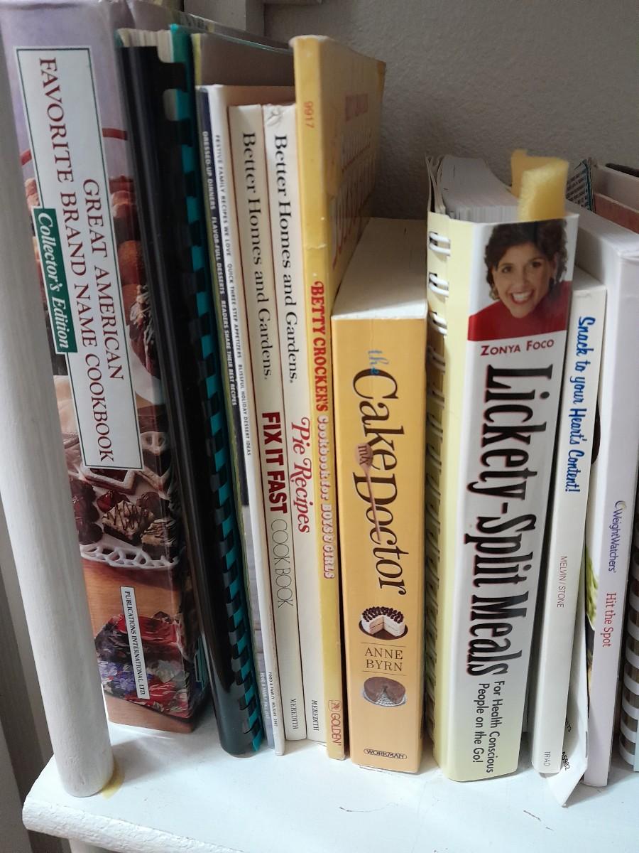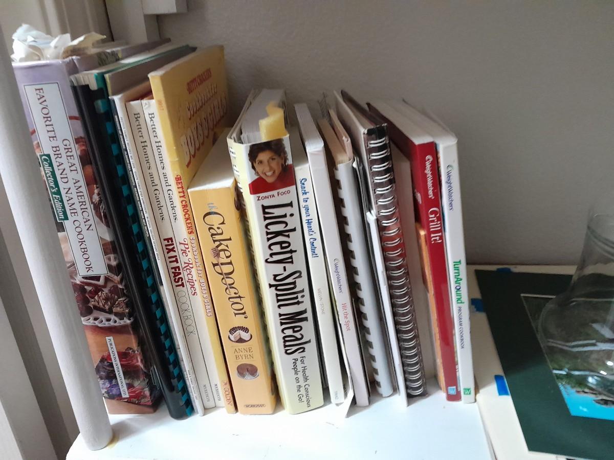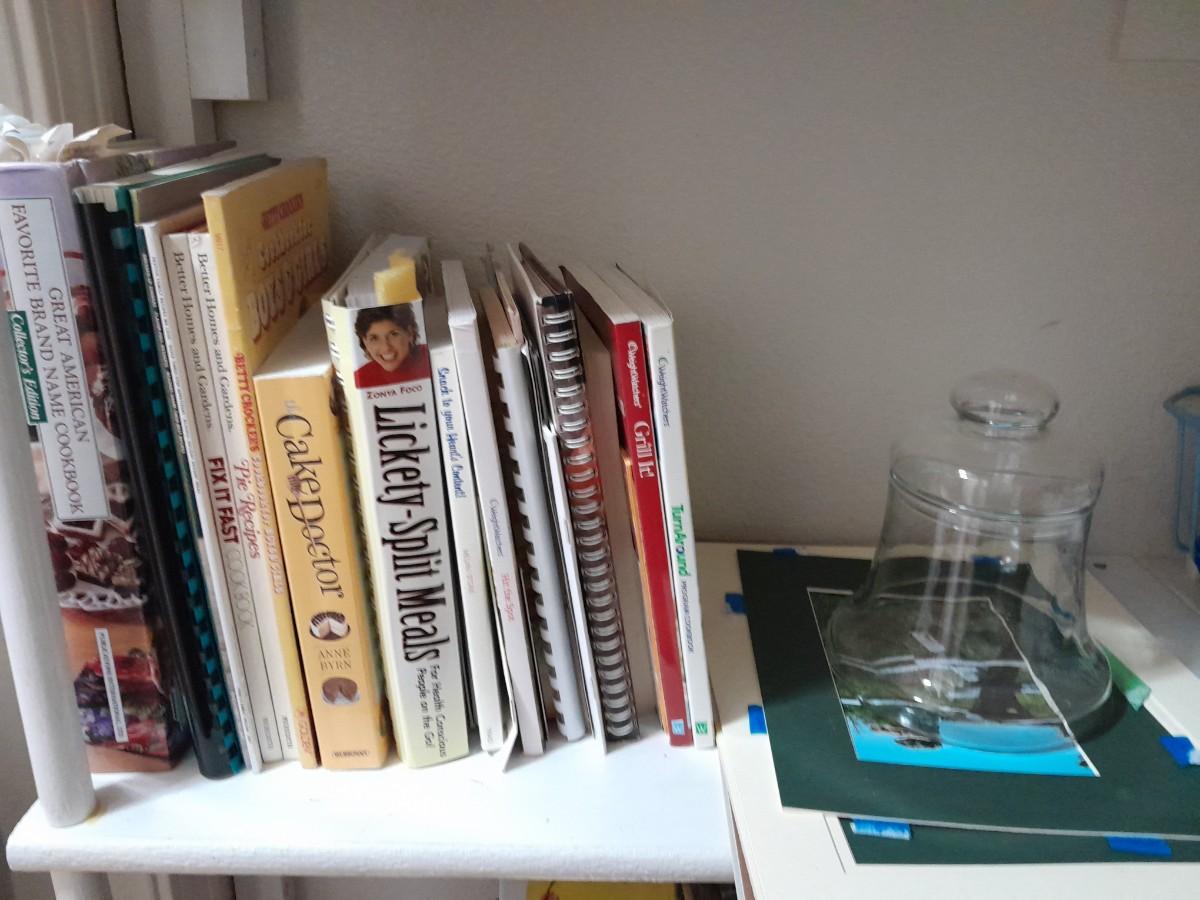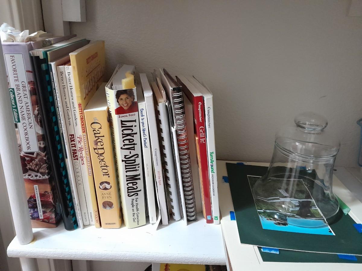 COOK BOOKS, PHOTOS AND A GLASS DISH WITH LID