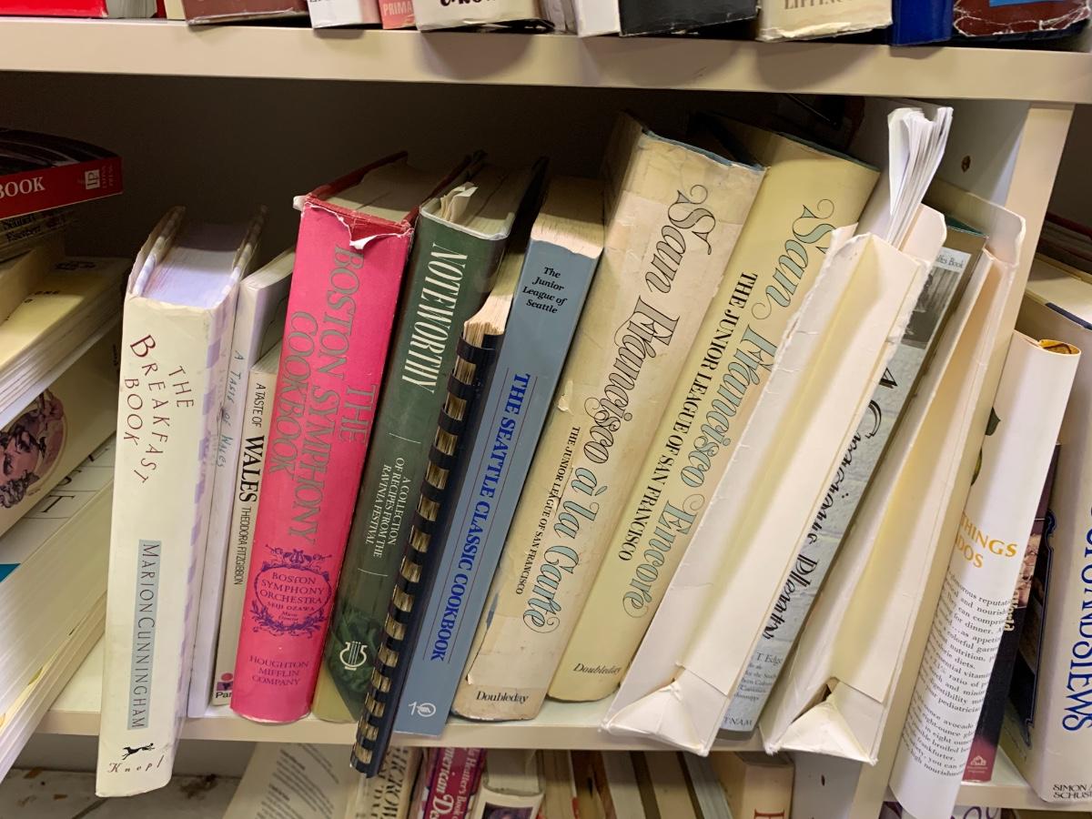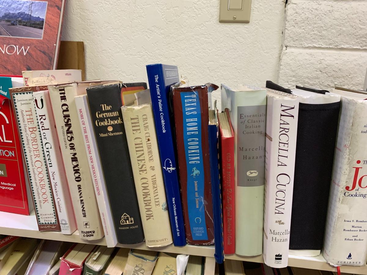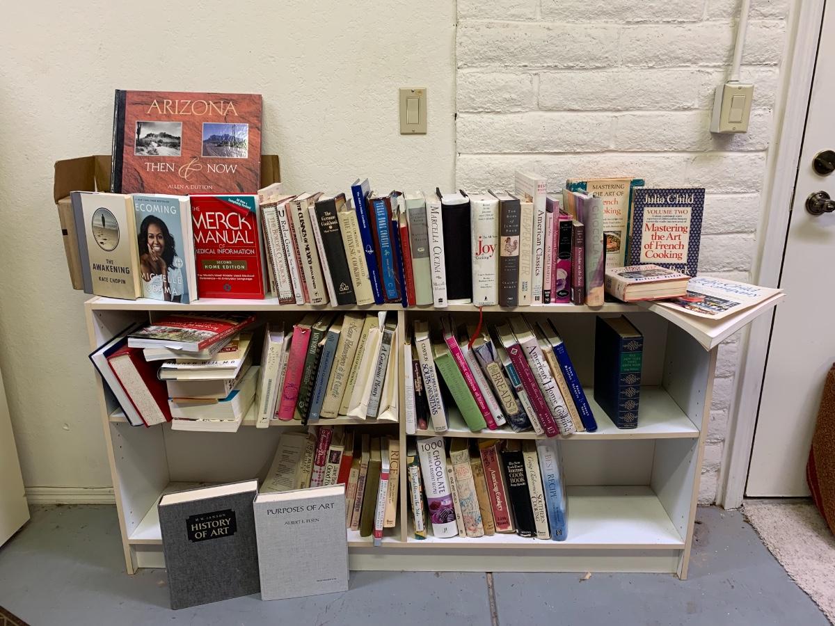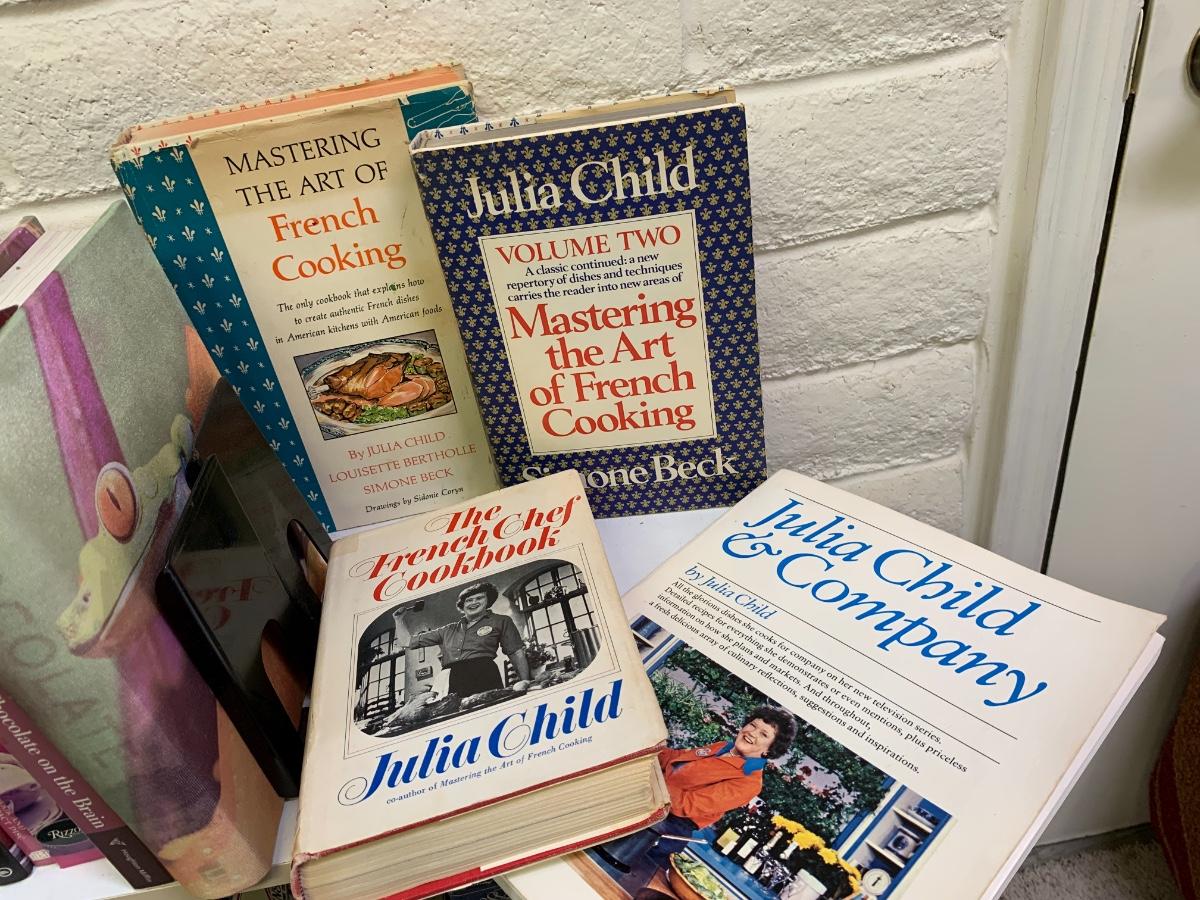 Book lot AND the shelf they are on. Includes, mostly cookbooks, but some other music, art and misc books. Vintage French cookbooks and Julia Child. Classic Joy of Cooking. Arizona Then and Now coffee Table book.