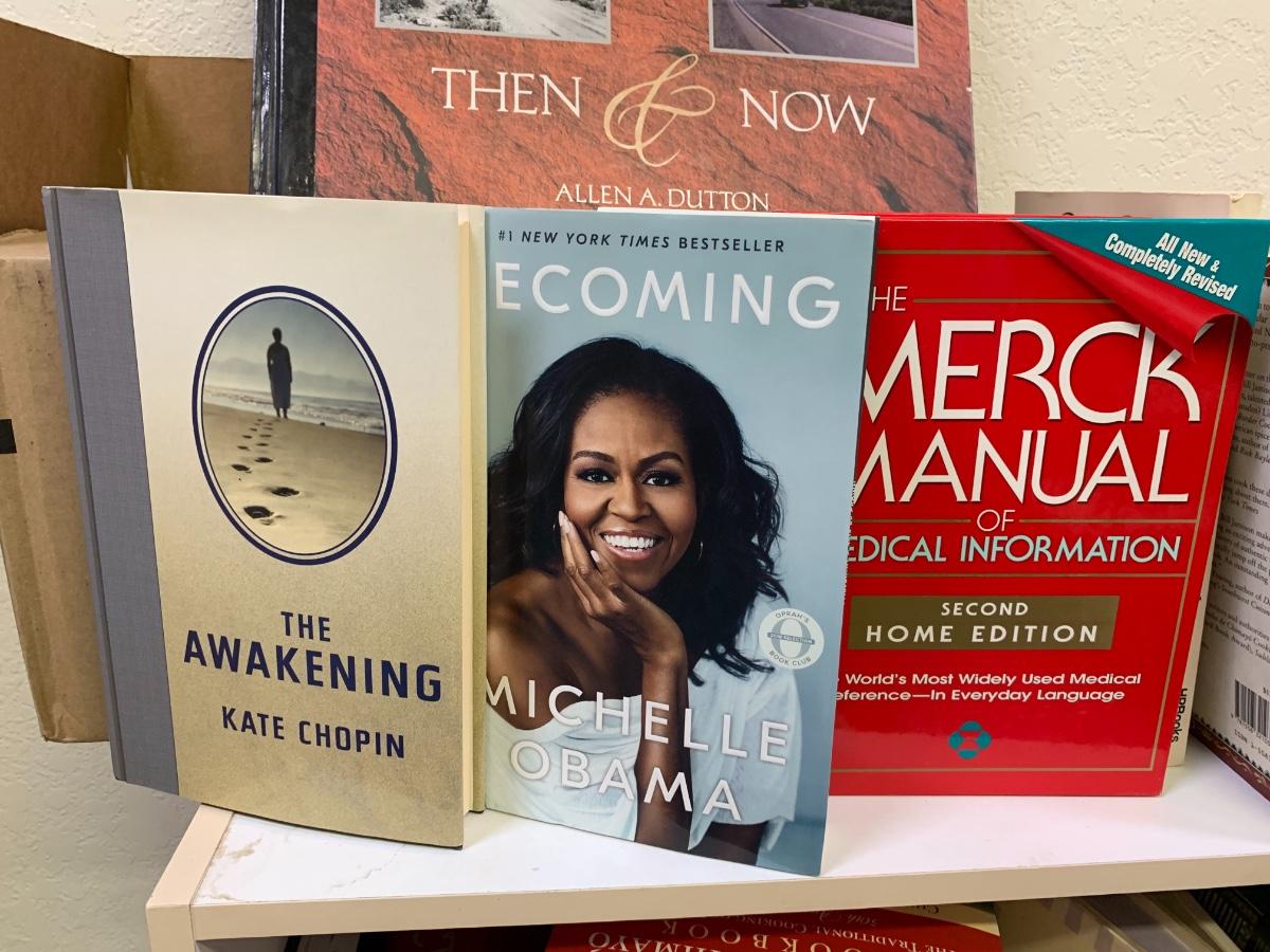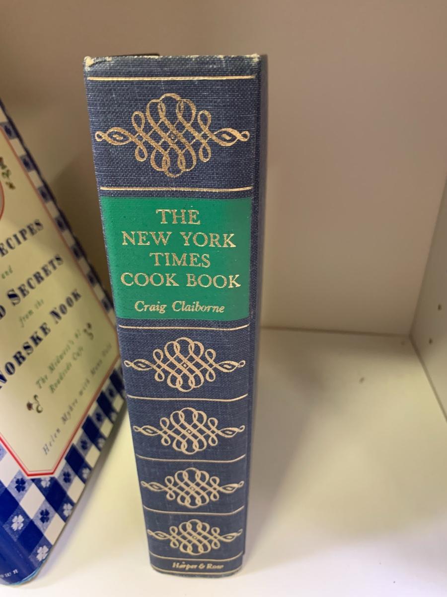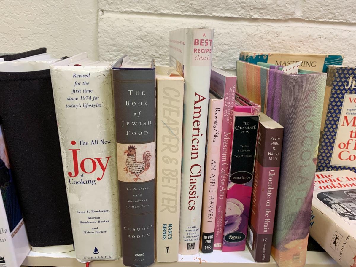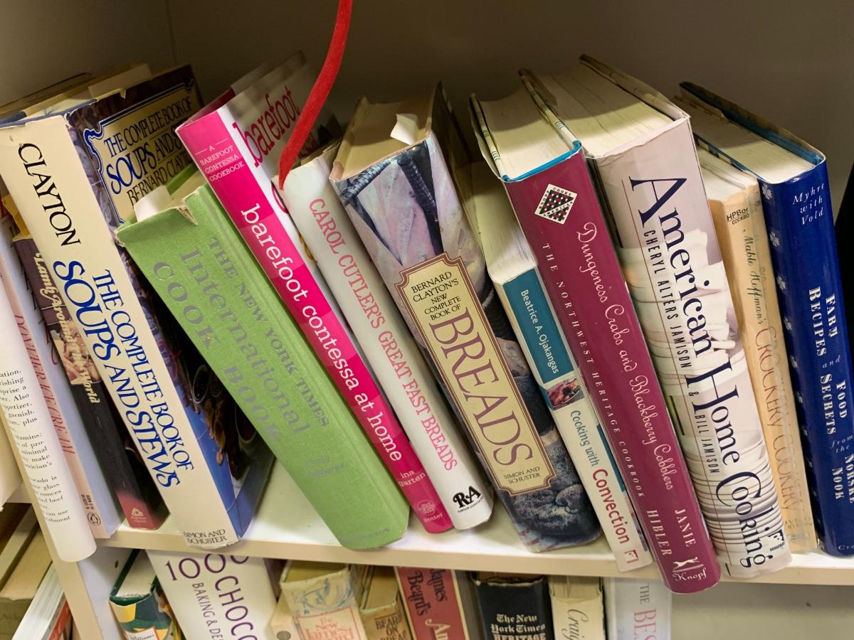 Book lot AND the shelf they are on. Includes, mostly cookbooks, but some other music, art and misc books. Vintage French cookbooks and Julia Child. Classic Joy of Cooking. Arizona Then and Now coffee Table book.