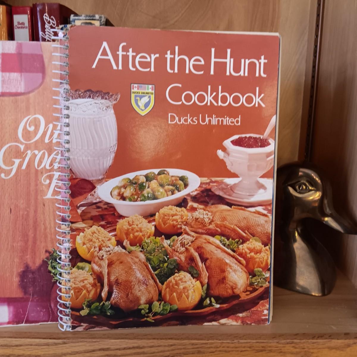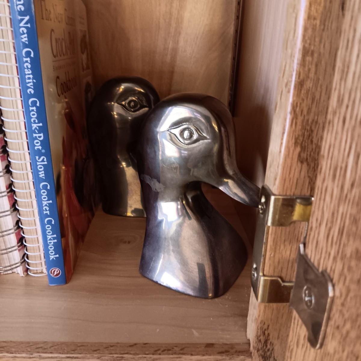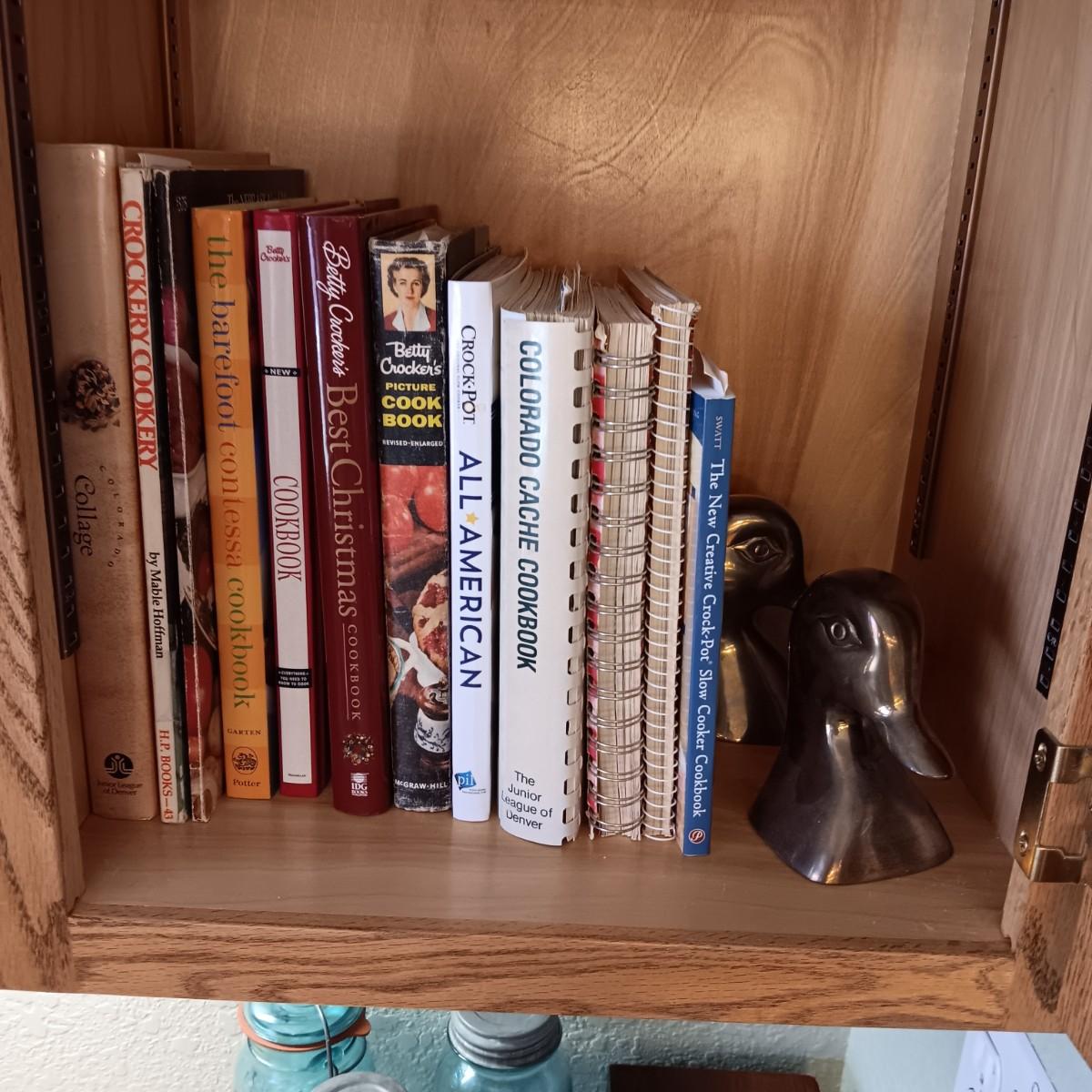COOKBOOKS AND A PAIR OF BRASS DUCK BOOKENDS