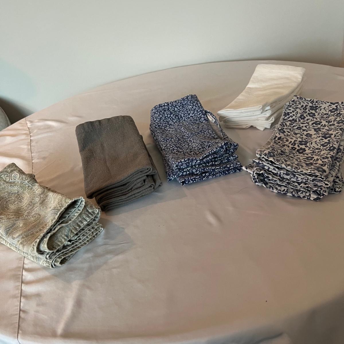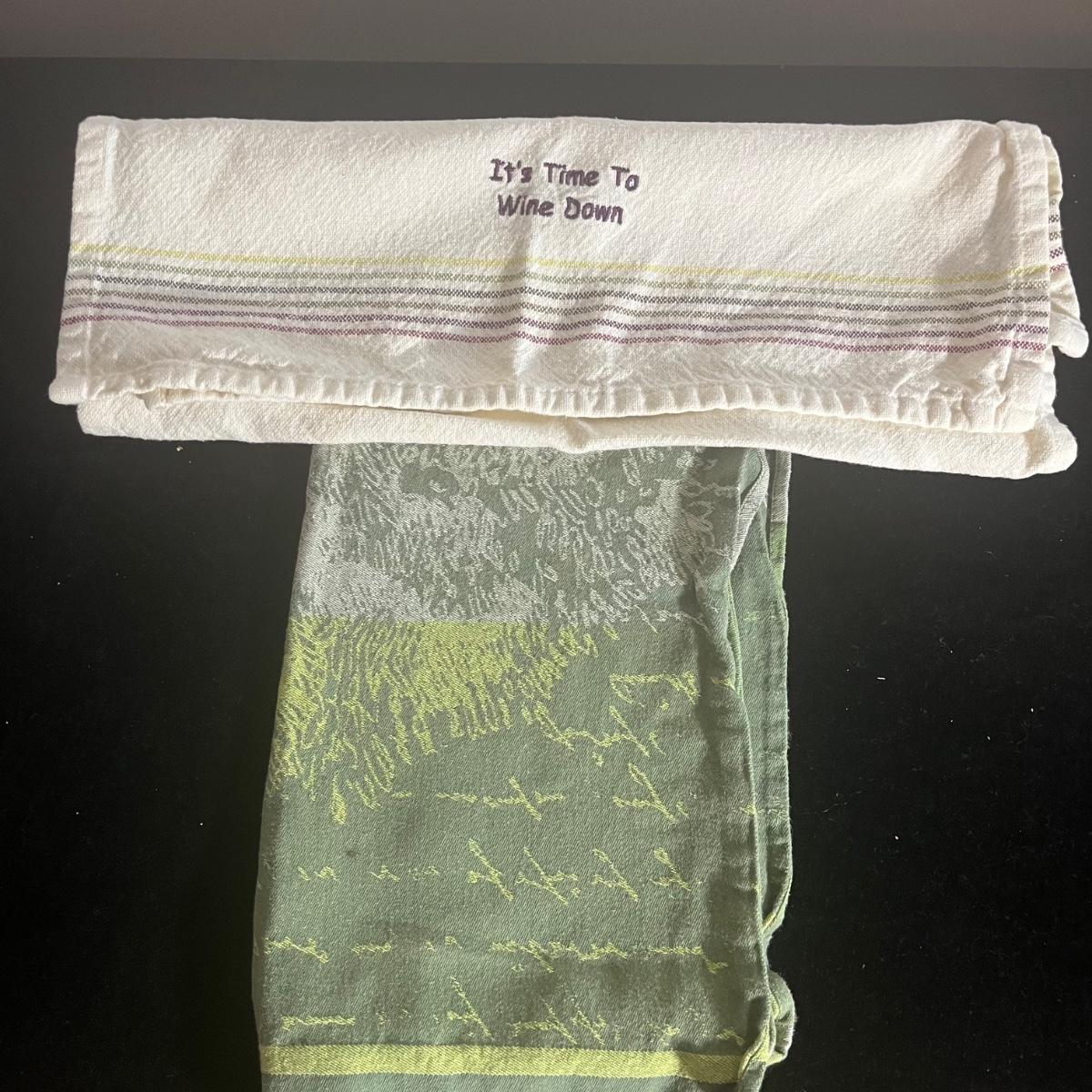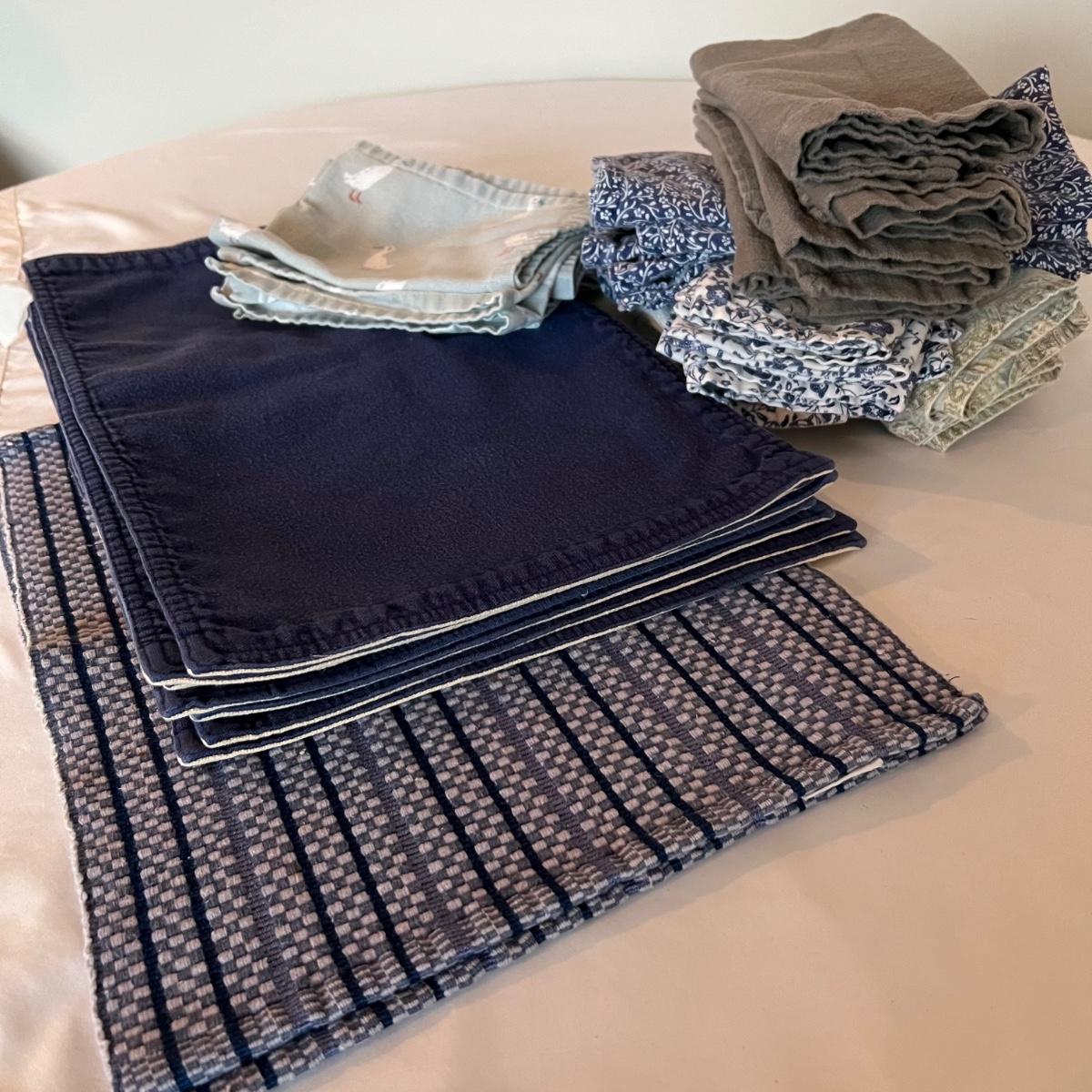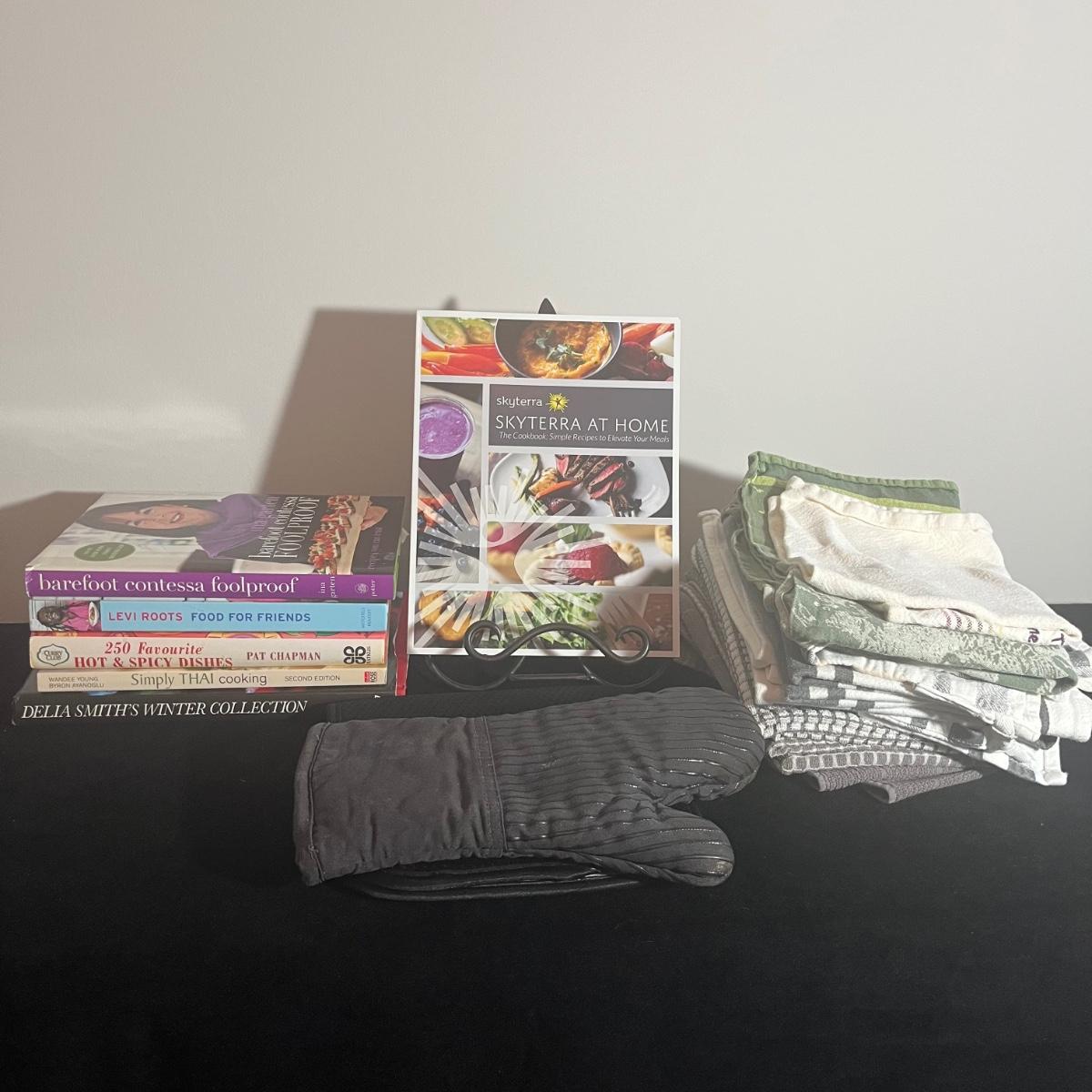 Lot includes a selection of cookbooks, Metal cookbook holder, 12+ dish towels, cotton napkins, placemats and an oven mitt. Dish towels measure 16” x 24”.
