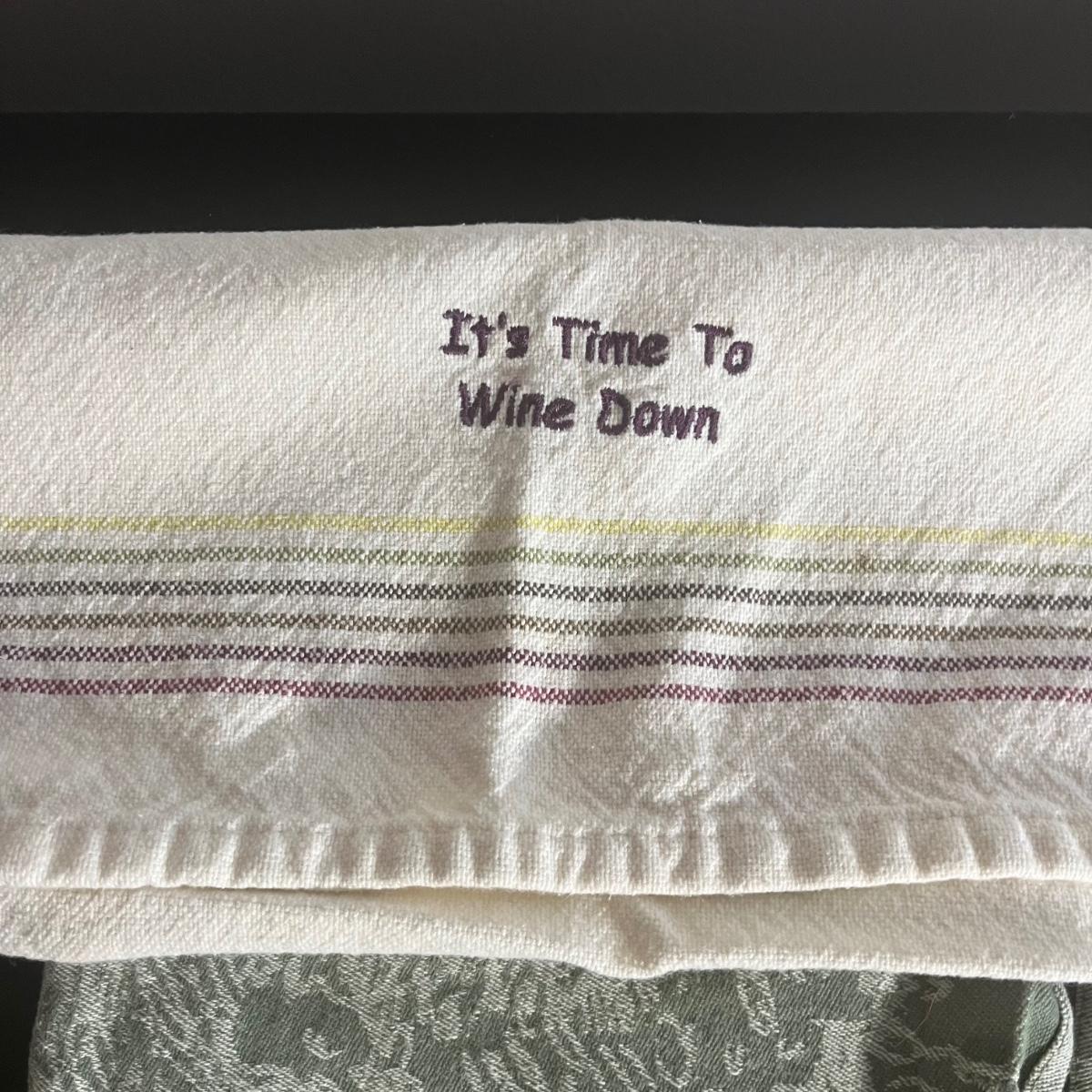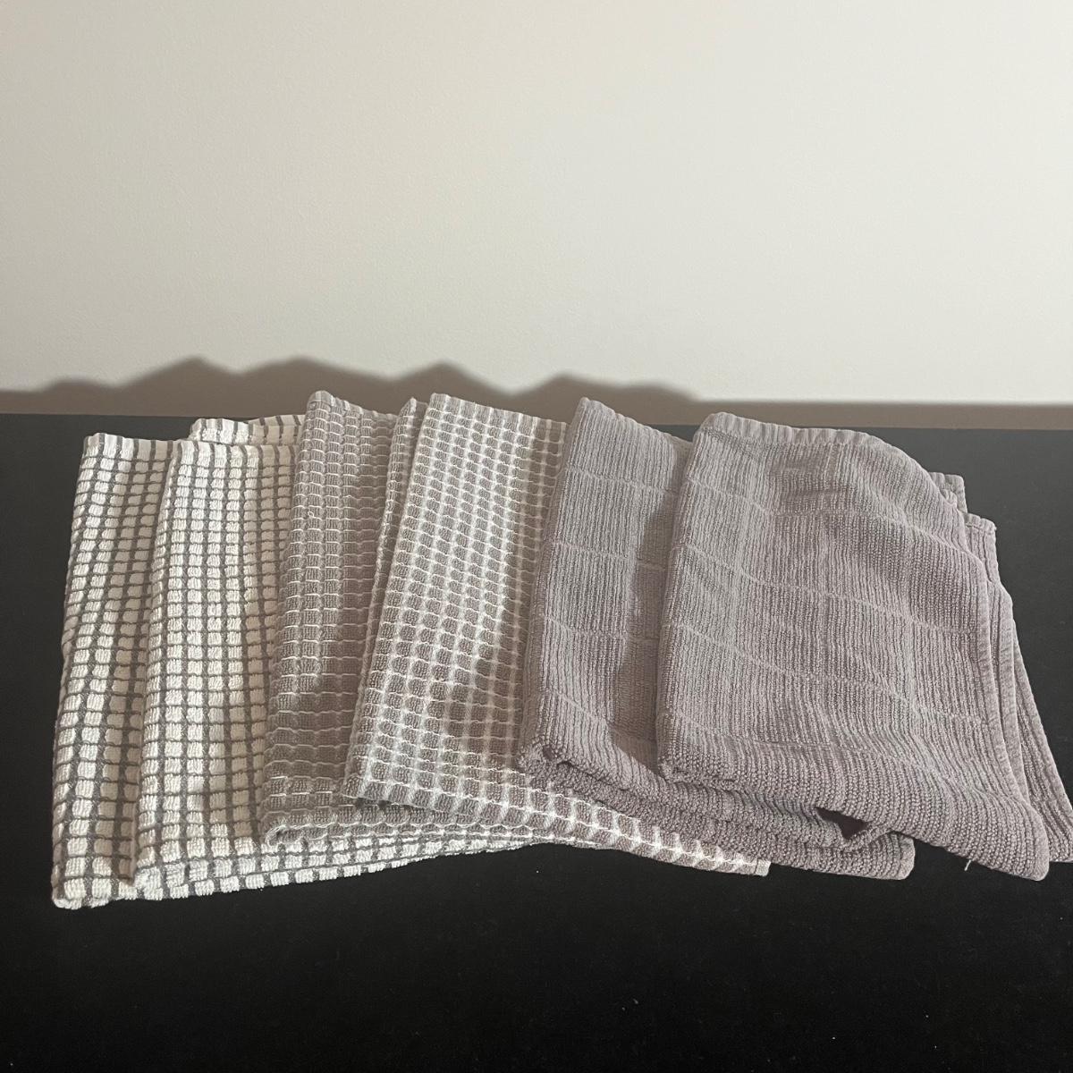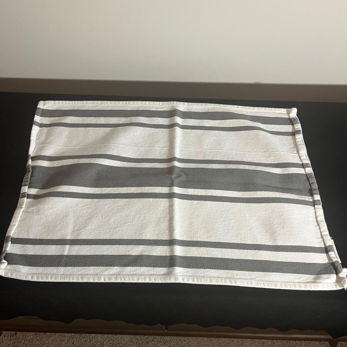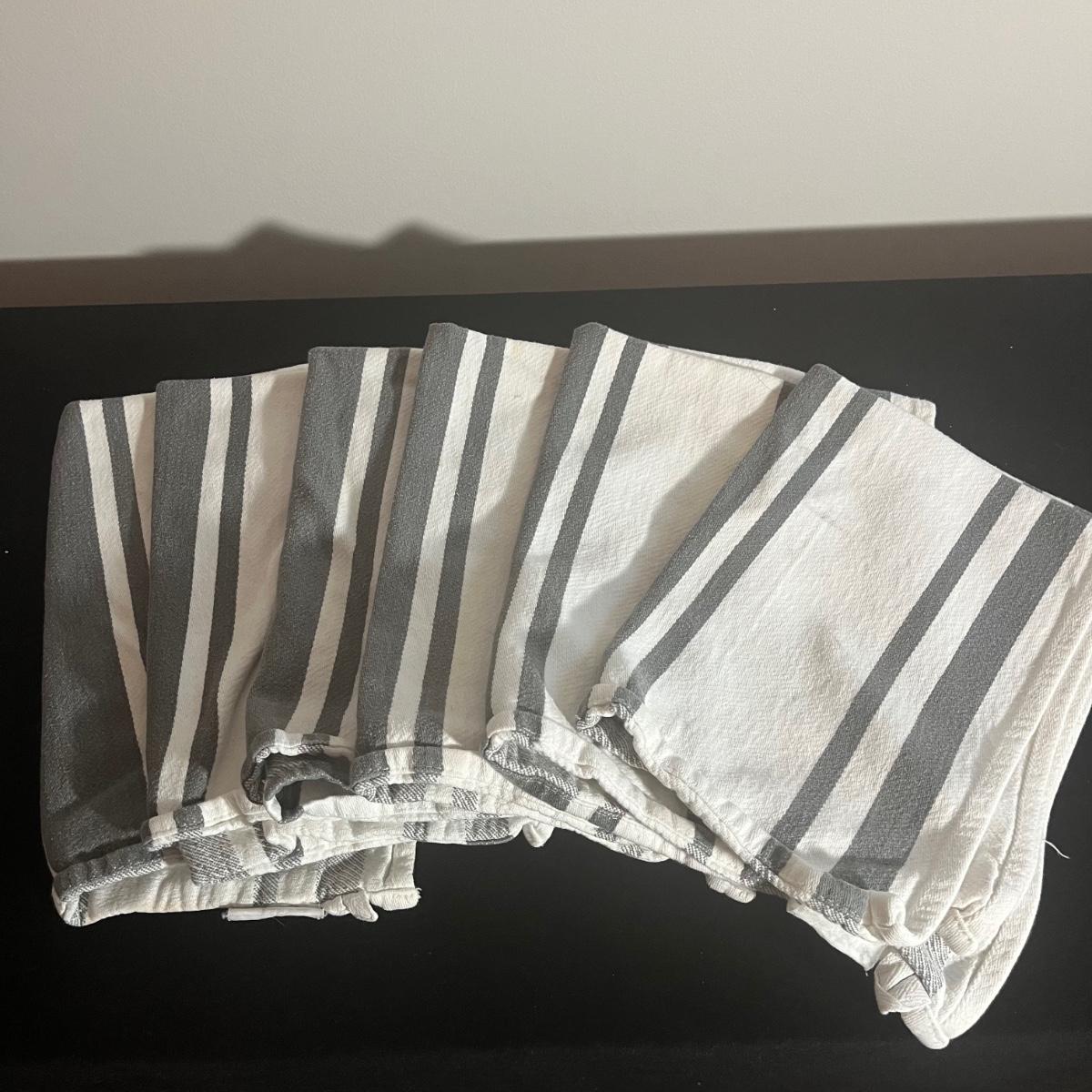 Lot includes a selection of cookbooks, Metal cookbook holder, 12+ dish towels, cotton napkins, placemats and an oven mitt. Dish towels measure 16” x 24”.