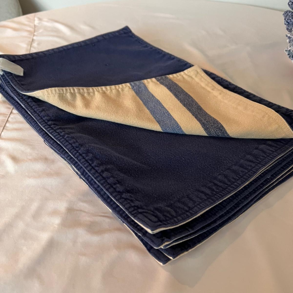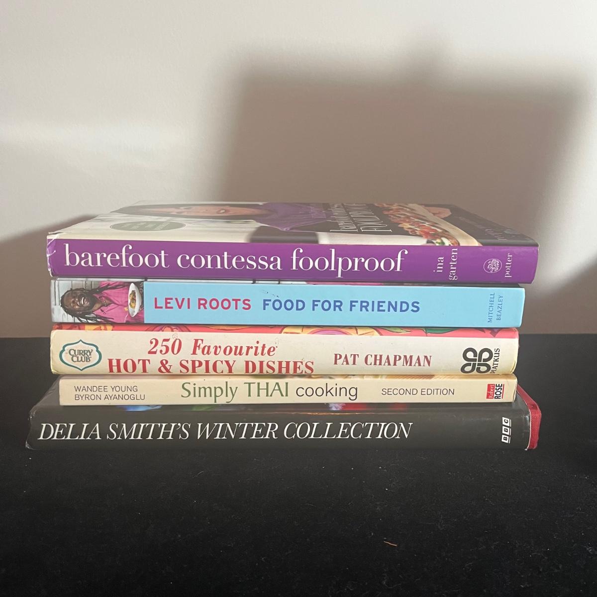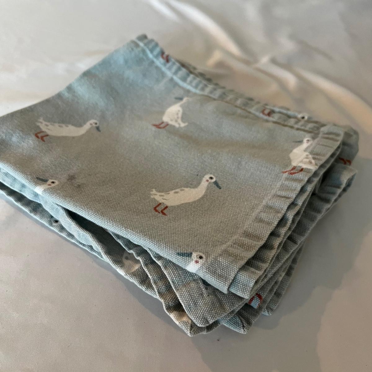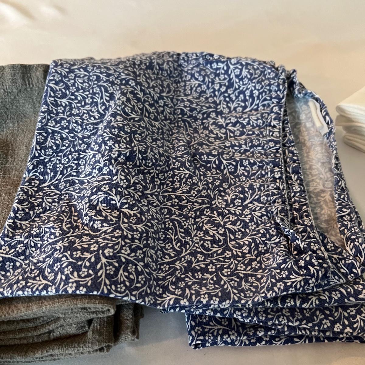 Lot includes a selection of cookbooks, Metal cookbook holder, 12+ dish towels, cotton napkins, placemats and an oven mitt. Dish towels measure 16” x 24”.