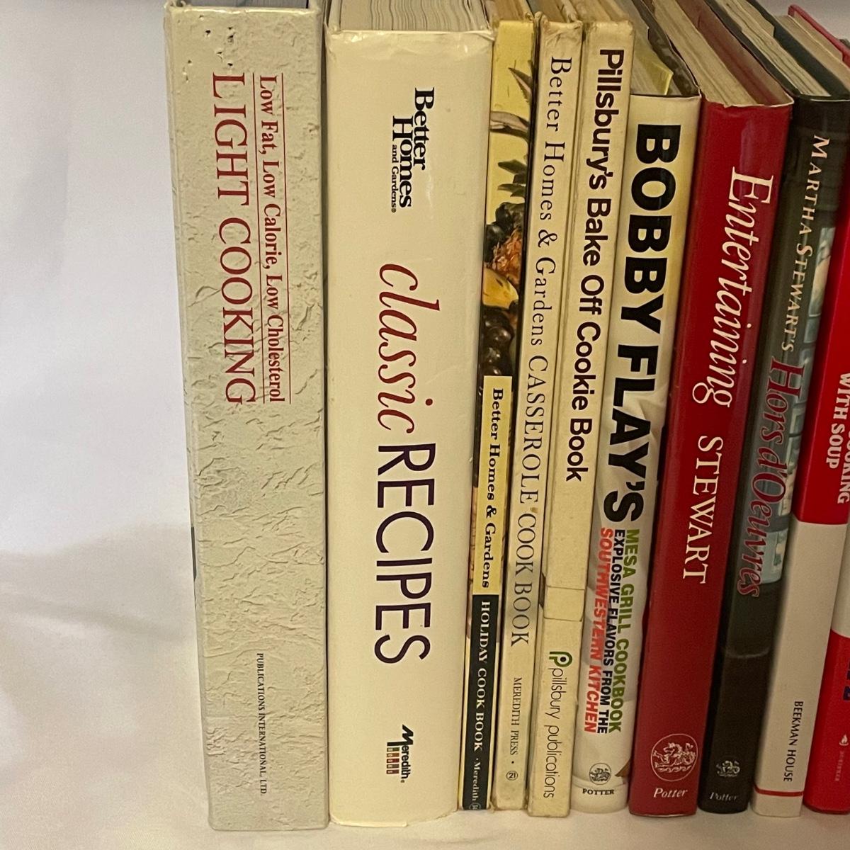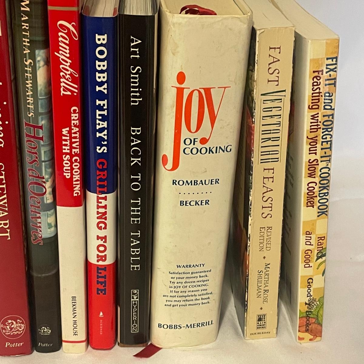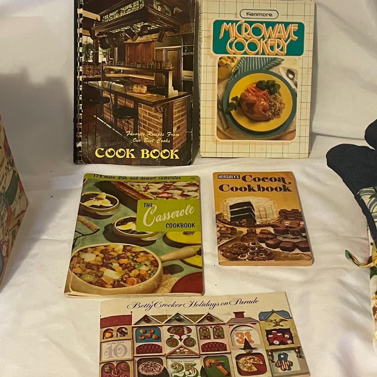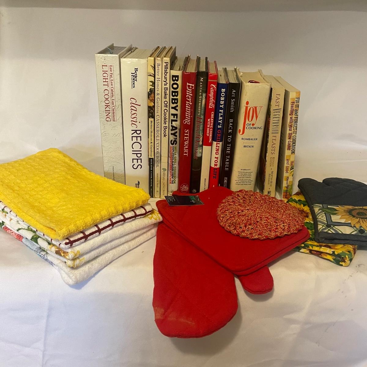 Over 15 cookbooks in this lot that also includes a handful of tea towels and some oven mitts, all in good condition.